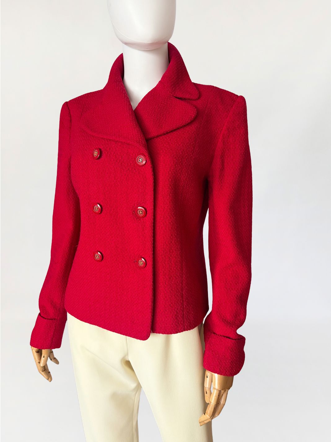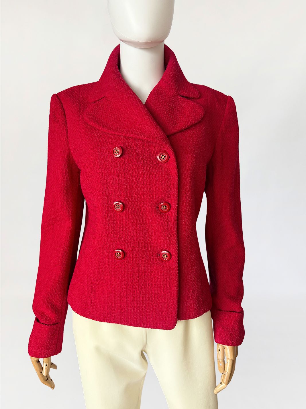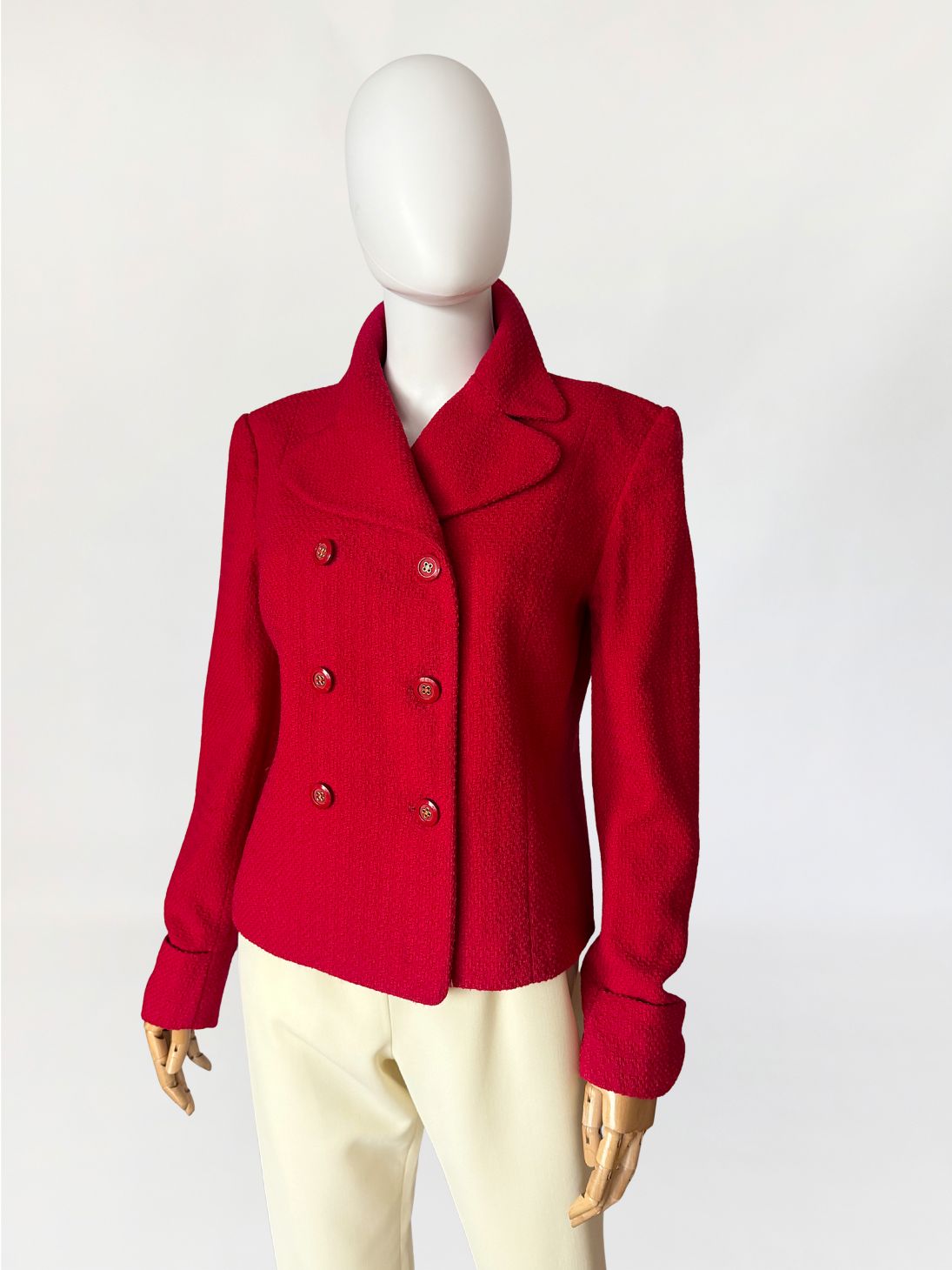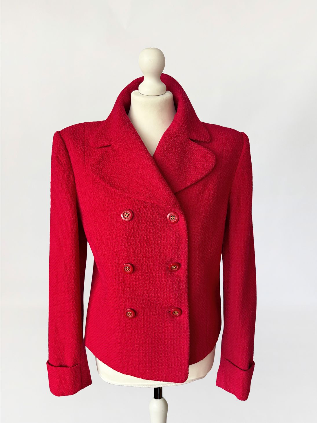 Marynarka vintage domu mody Valentino, z linii Oliver wykonana z wełnianej strukturalnej tkaniny w intensywnym czerwonym odcieniu. Krótki dwurzędowy fason z lekkim taliowaniem. Wyraźnie zarysowana linia ramion, klasycznie wszytymi długimi rękawami. Klasyczny, rewersowy kołnierz. Tył prowadzony środkowym szwem, bez rozcięcia.