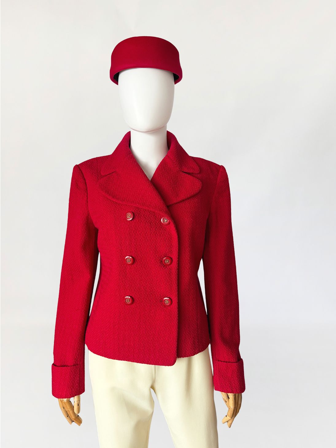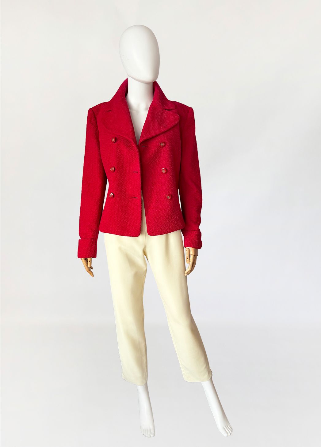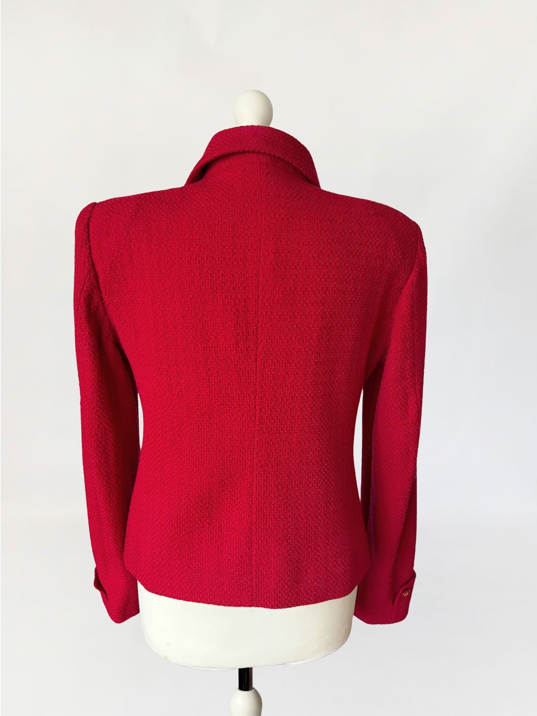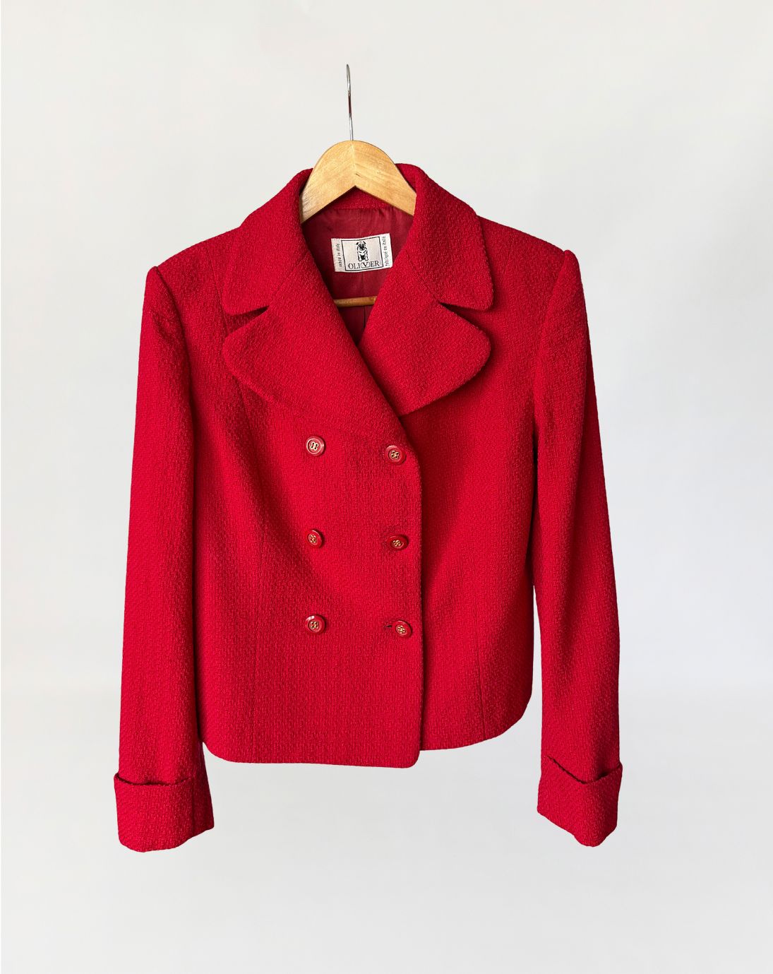 Marynarka vintage domu mody Valentino, z linii Oliver wykonana z wełnianej strukturalnej tkaniny w intensywnym czerwonym odcieniu. Krótki dwurzędowy fason z lekkim taliowaniem. Wyraźnie zarysowana linia ramion, klasycznie wszytymi długimi rękawami. Klasyczny, rewersowy kołnierz. Tył prowadzony środkowym szwem, bez rozcięcia.