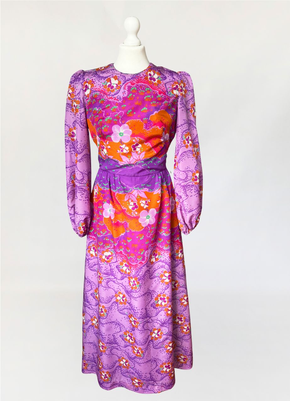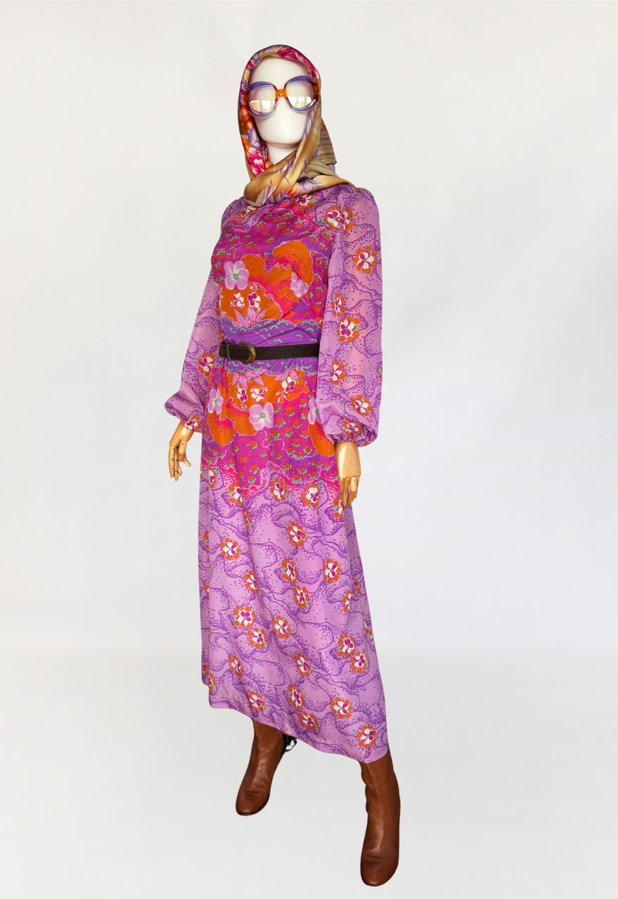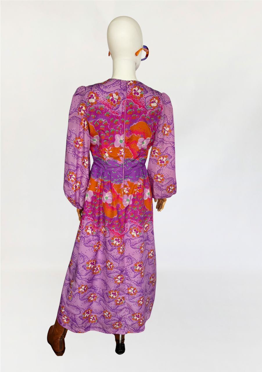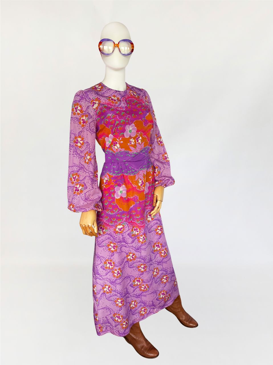 Sukienka vintage z lat 70-tych marki Vera Mont. Model mocno w stylu dekady 70's, w której romantyzm łączył się z odważnym kolorem i ekspresyjnym nadrukiem. Wykonana z lekkiej tkaniny syntetycznej w abstrakcyjne, kwiatowo-psychodeliczne motywy w intensywnych odcieniach fioletu, pomarańczu, różu i zieleni. Model z dopasowaną górą, okrągłym dekoltem i długimi szerszymi rękawami z marszczeniem przy ramionach. Dół trapezowy, o długości maxi. W talii cienkie szlufki, bez paska