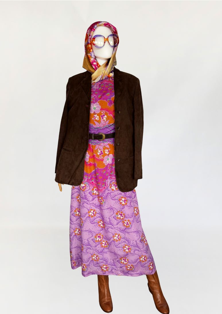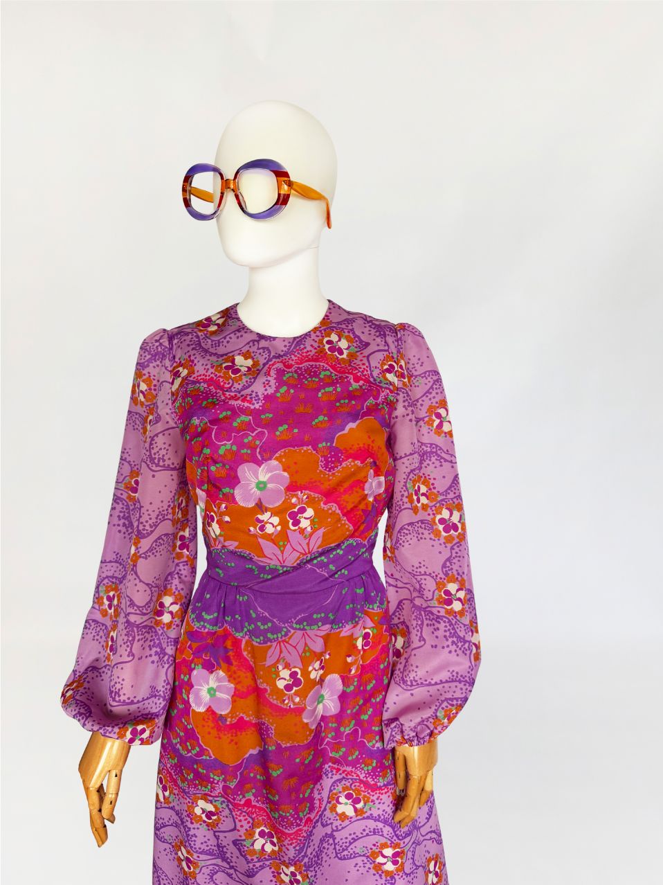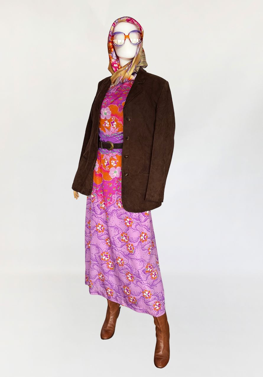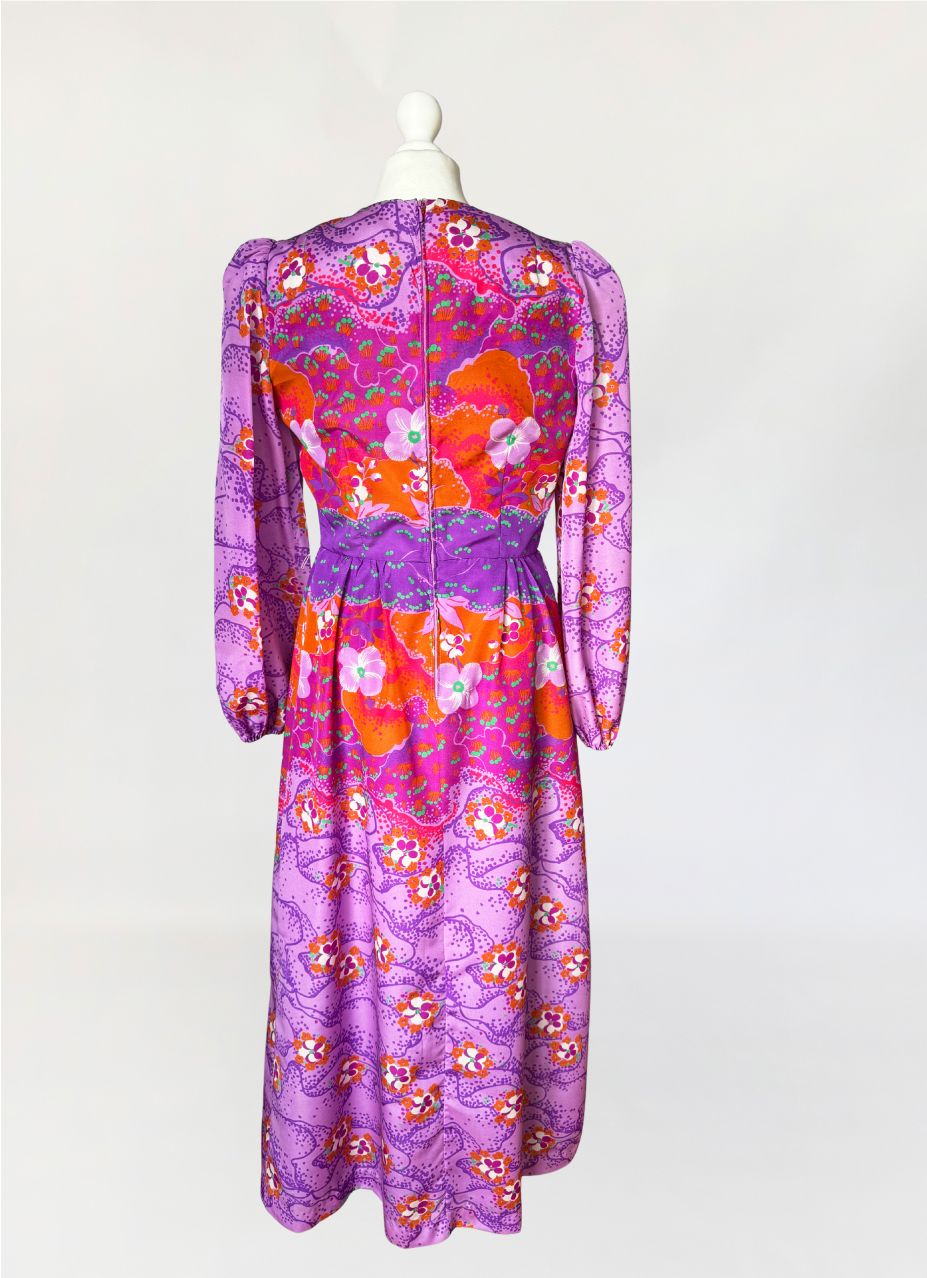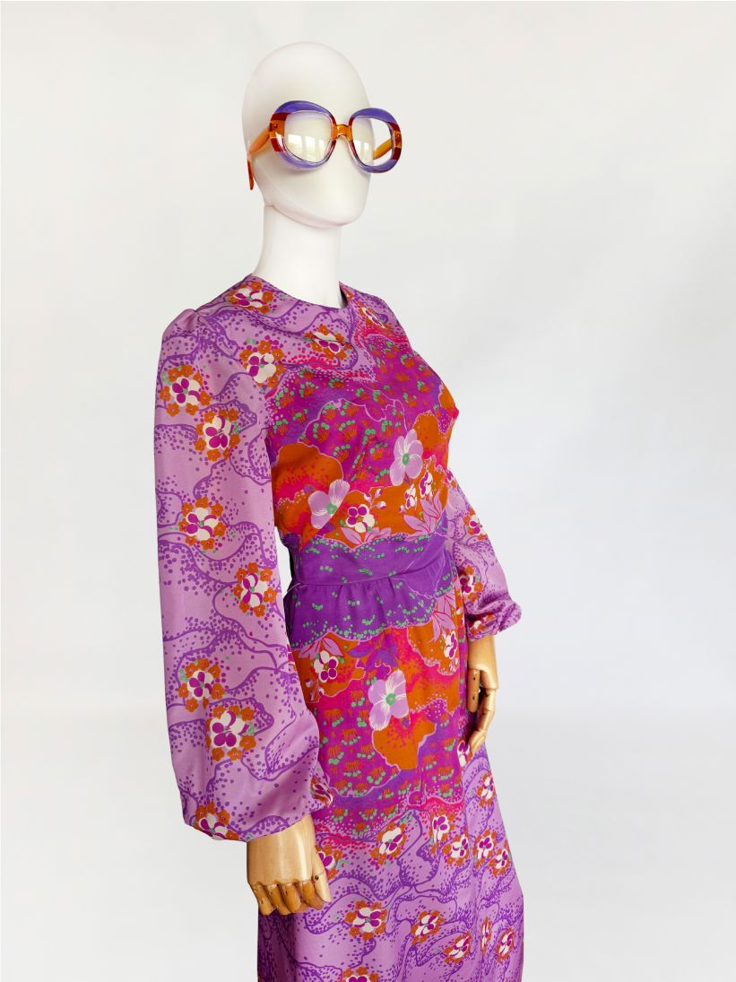 Sukienka vintage z lat 70-tych marki Vera Mont. Model mocno w stylu dekady 70's, w której romantyzm łączył się z odważnym kolorem i ekspresyjnym nadrukiem. Wykonana z lekkiej tkaniny syntetycznej w abstrakcyjne, kwiatowo-psychodeliczne motywy w intensywnych odcieniach fioletu, pomarańczu, różu i zieleni. Model z dopasowaną górą, okrągłym dekoltem i długimi szerszymi rękawami z marszczeniem przy ramionach. Dół trapezowy, o długości maxi. W talii cienkie szlufki, bez paska