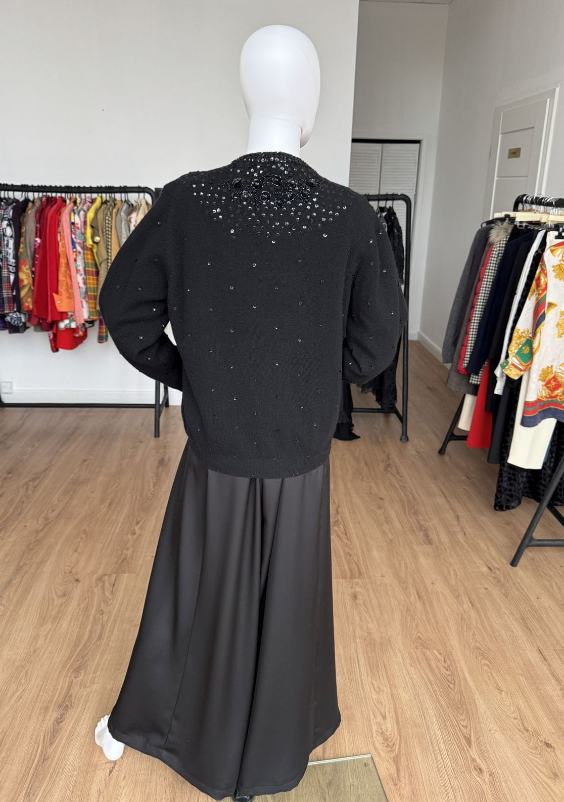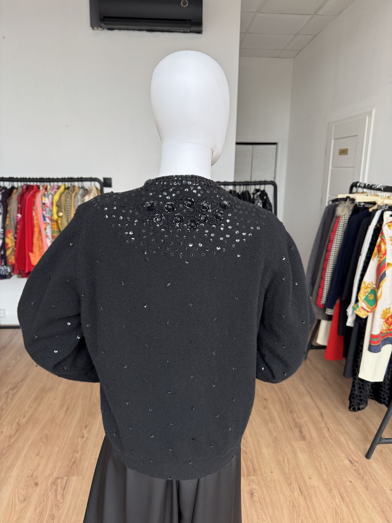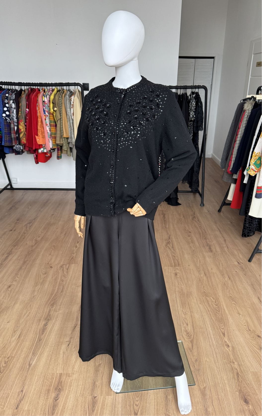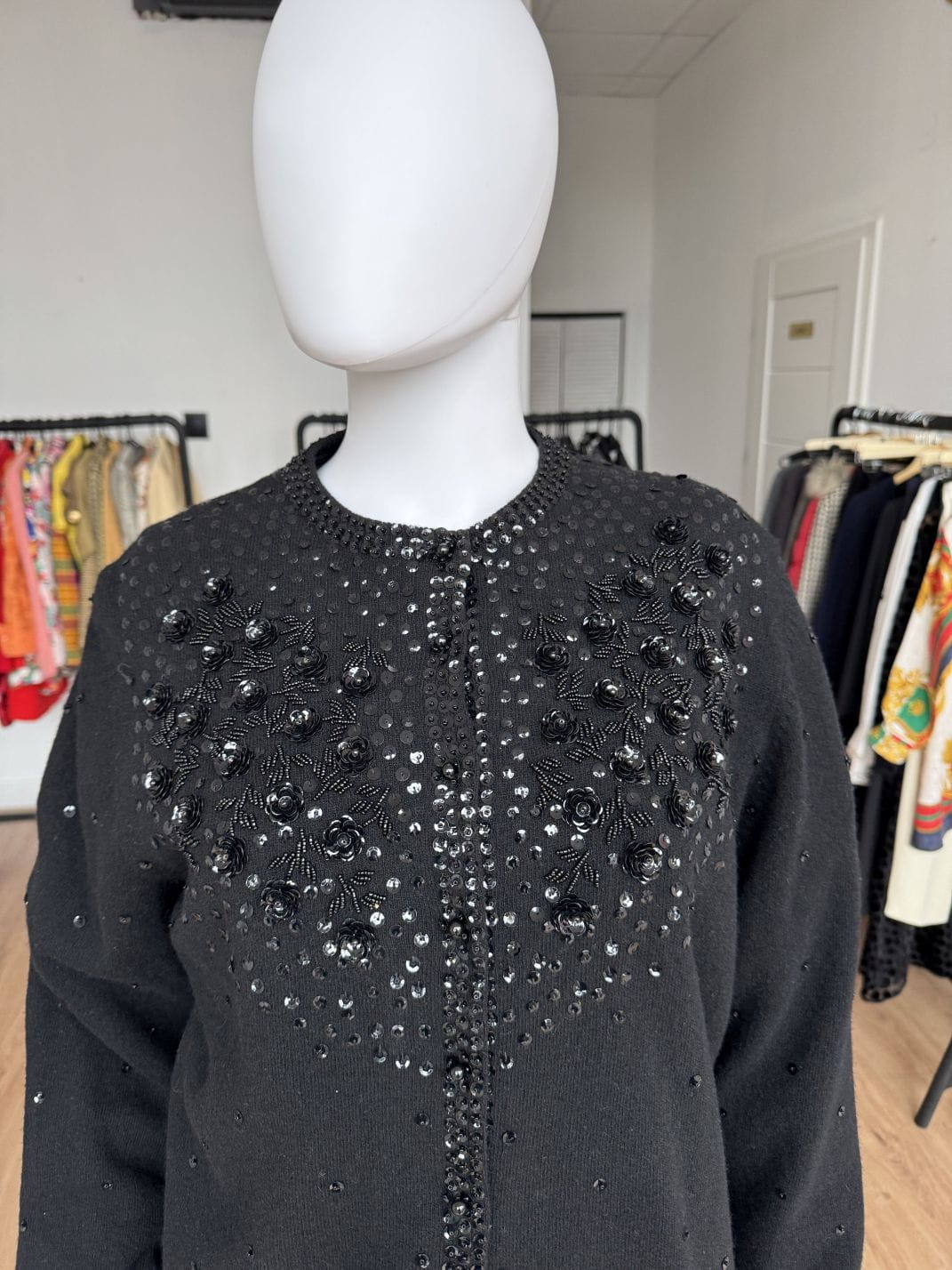 Kardigan/bomberka vintage wykonana z wełnianej czarnej dzianiny. Swobodny fason z długimi rękawami i dekoltem typu stójka. Na całości, szczególnie w górnej części biżuteryjne zdobienia. Zapinana na drobne guziki. Od wewnątrz w całości na podszewce.