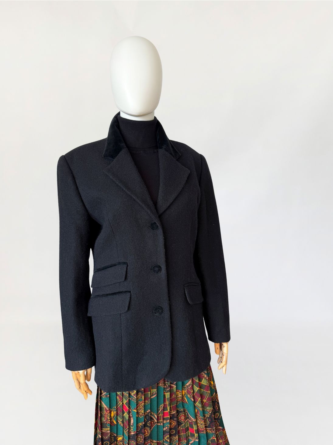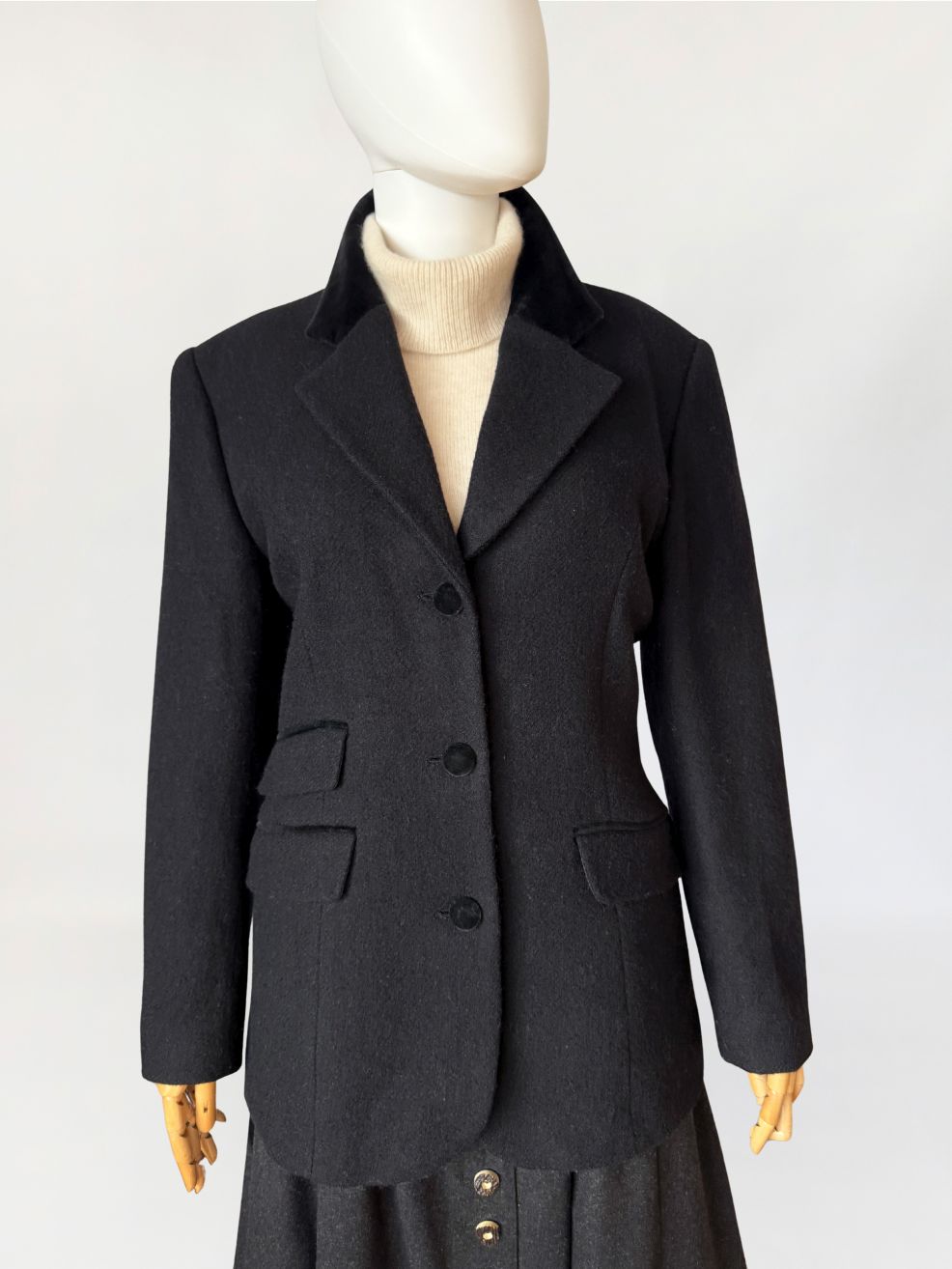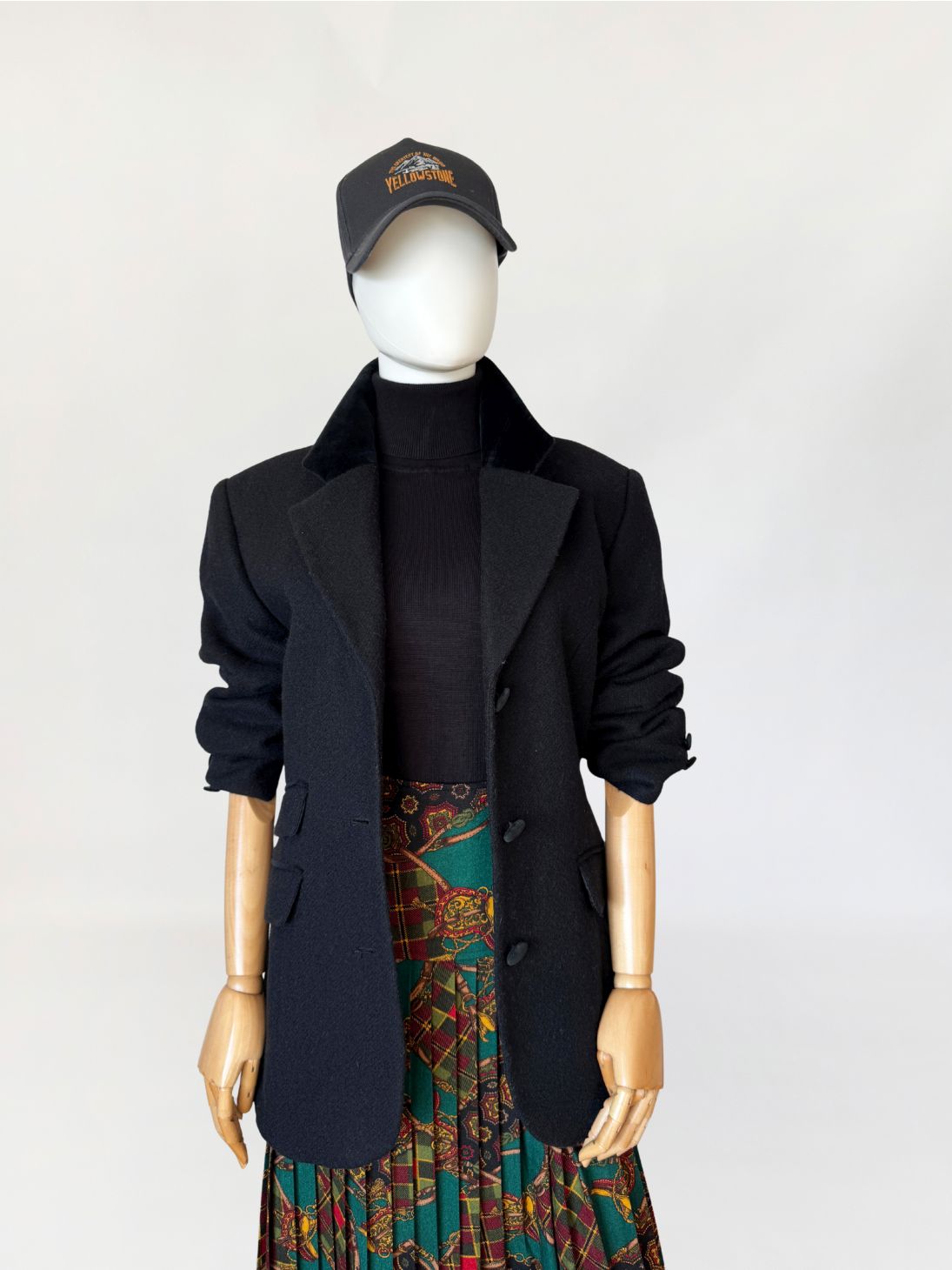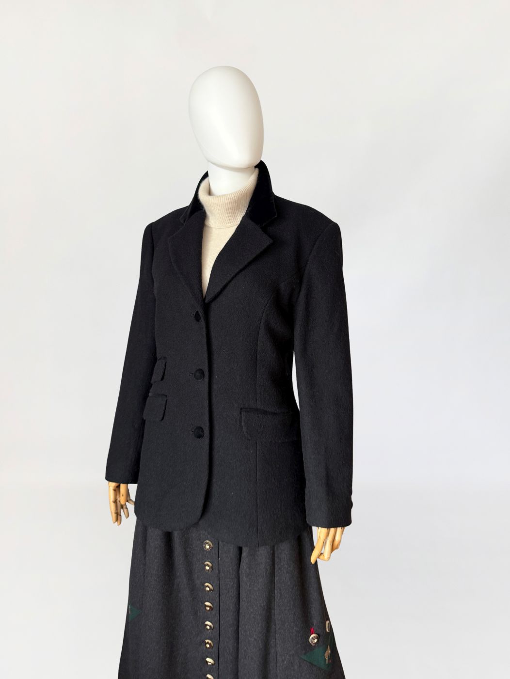 Czarna marynarka vintage z grubszej wełny, z kołnierzem wykończonym aksamitnym materiałem. Klasyczna konstrukcja z pojedynczym rzędem guzików, lekko taliowana, z pionowymi cięciami modelującymi sylwetkę. Dół wykończony dwiema kieszeniami z patkami oraz dodatkową kieszenią na wysokości biustu. Mięsista, bardziej kompaktowa wełna o wyczuwalnej strukturze. Rękawy zakończone guzikami.
