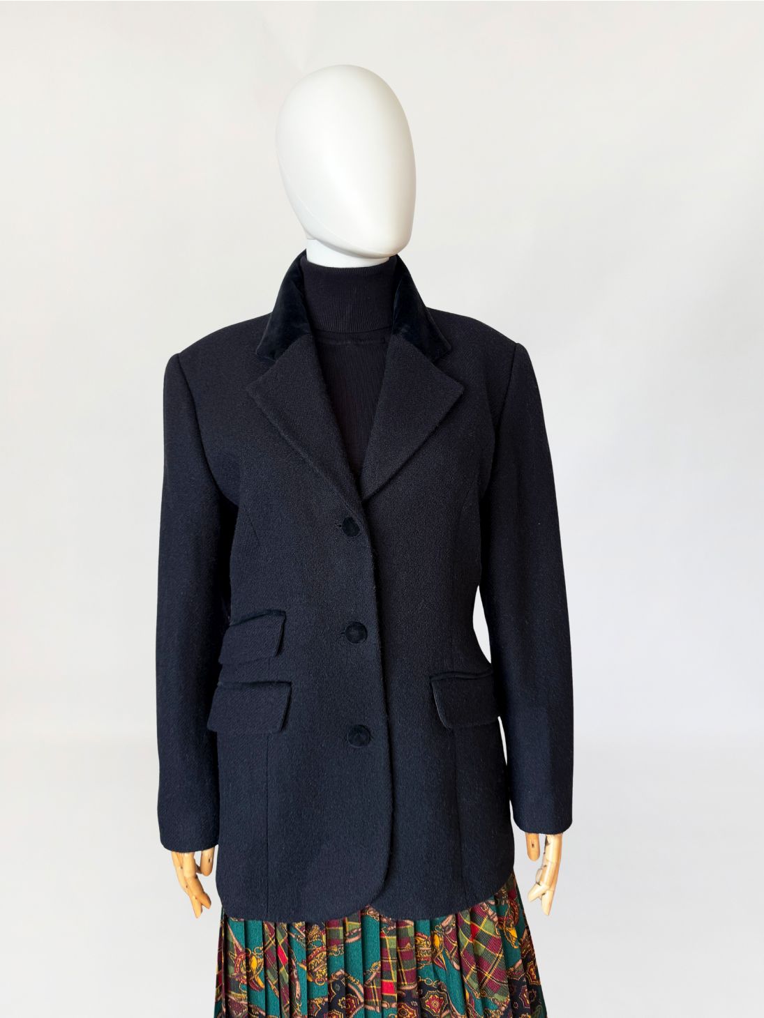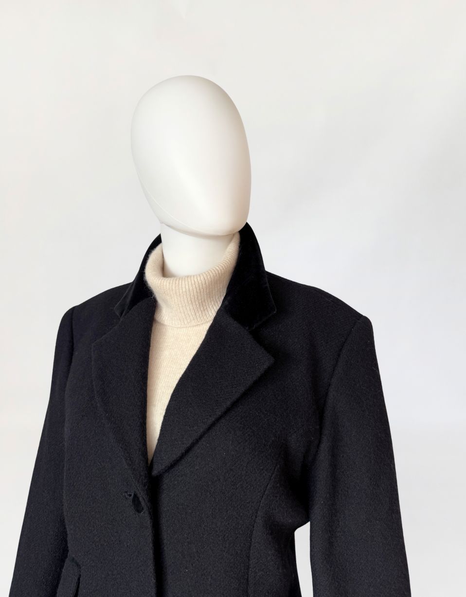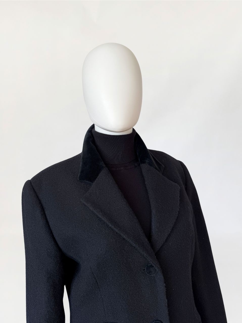 Czarna marynarka vintage z grubszej wełny, z kołnierzem wykończonym aksamitnym materiałem. Klasyczna konstrukcja z pojedynczym rzędem guzików, lekko taliowana, z pionowymi cięciami modelującymi sylwetkę. Dół wykończony dwiema kieszeniami z patkami oraz dodatkową kieszenią na wysokości biustu. Mięsista, bardziej kompaktowa wełna o wyczuwalnej strukturze. Rękawy zakończone guzikami.
