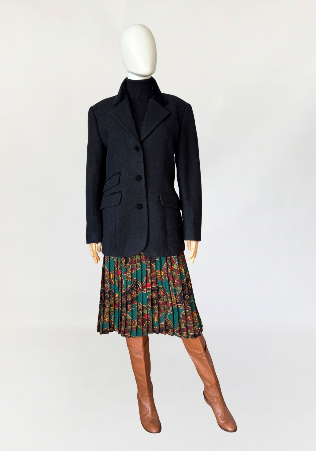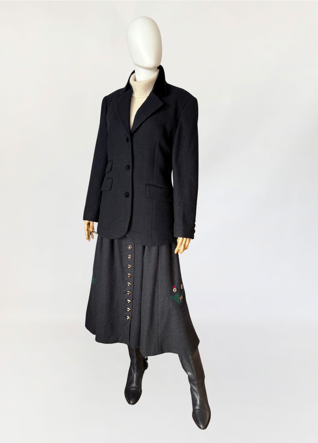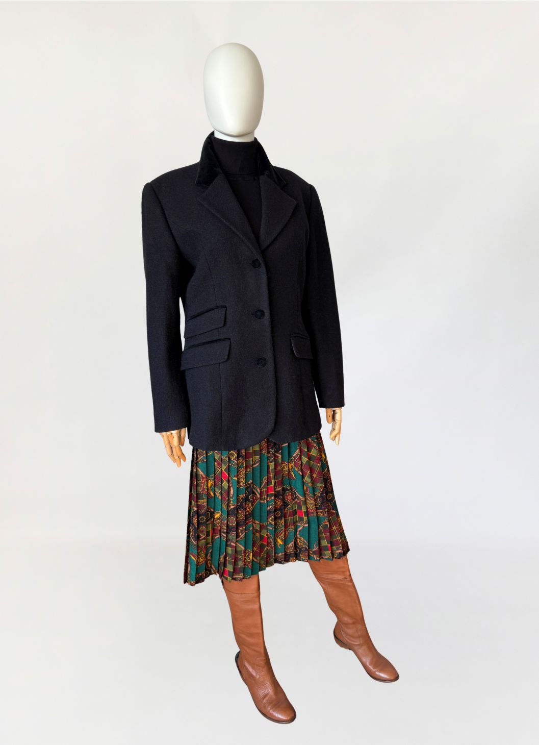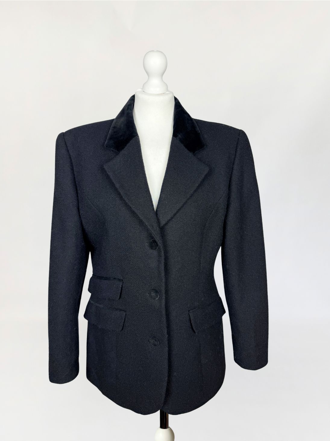 Czarna marynarka vintage z grubszej wełny, z kołnierzem wykończonym aksamitnym materiałem. Klasyczna konstrukcja z pojedynczym rzędem guzików, lekko taliowana, z pionowymi cięciami modelującymi sylwetkę. Dół wykończony dwiema kieszeniami z patkami oraz dodatkową kieszenią na wysokości biustu. Mięsista, bardziej kompaktowa wełna o wyczuwalnej strukturze. Rękawy zakończone guzikami.