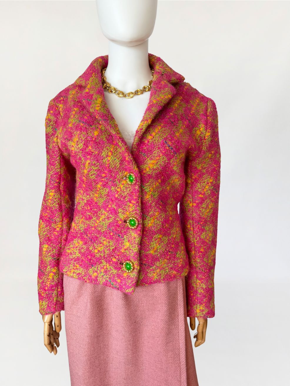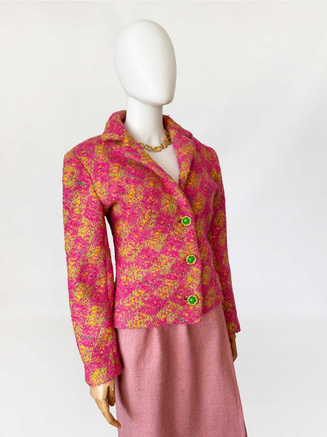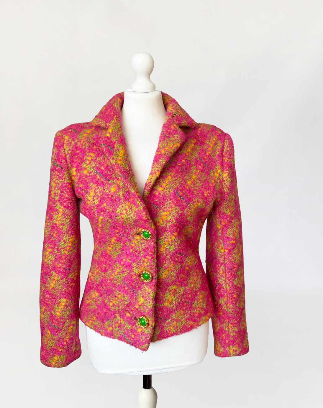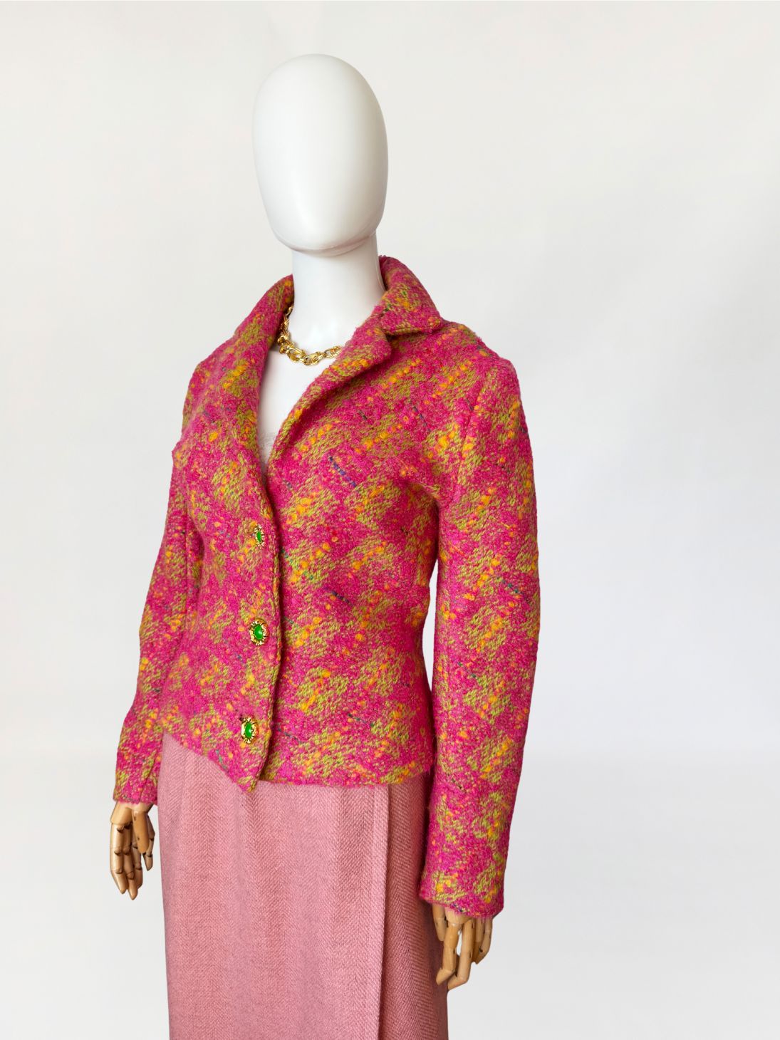 Marynarka vintage z lat 80-tych wykonana z grubszej wełny typu bouclé energetycznym splocie różu, żółci i limonki. Krótki, lekko taliowany fason z długimi rękawami. Zapinana na trzy efektowne guziki w kolorze zieleni, oprawione w złote ramki o rzeźbionej strukturze.