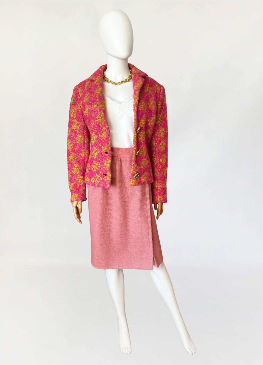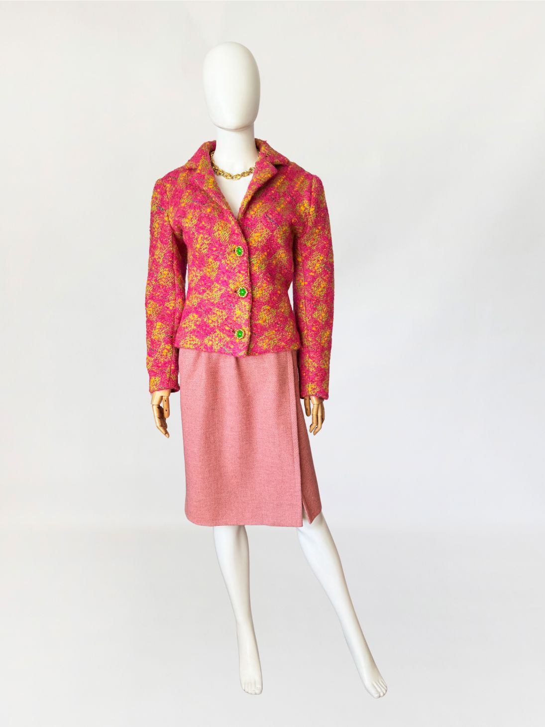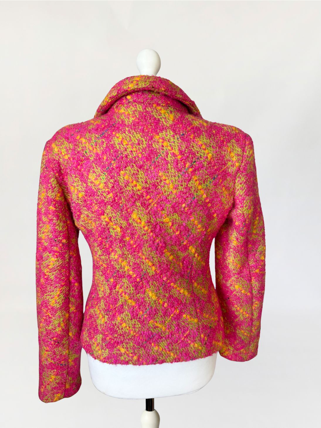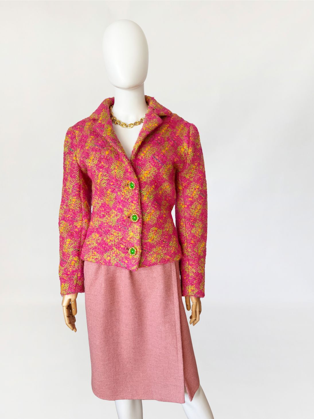 Marynarka vintage z lat 80-tych wykonana z grubszej wełny typu bouclé energetycznym splocie różu, żółci i limonki. Krótki, lekko taliowany fason z długimi rękawami. Zapinana na trzy efektowne guziki w kolorze zieleni, oprawione w złote ramki o rzeźbionej strukturze.