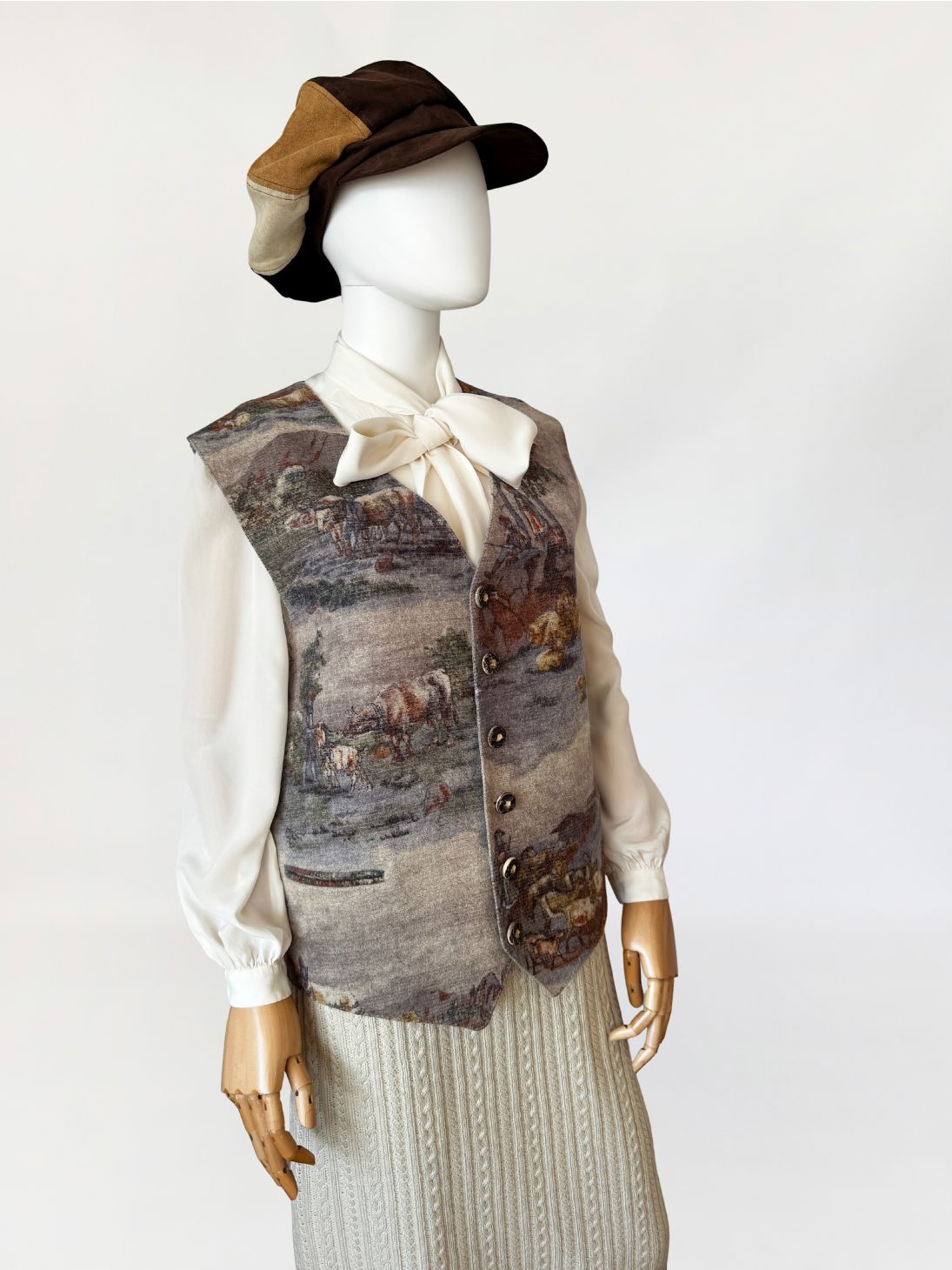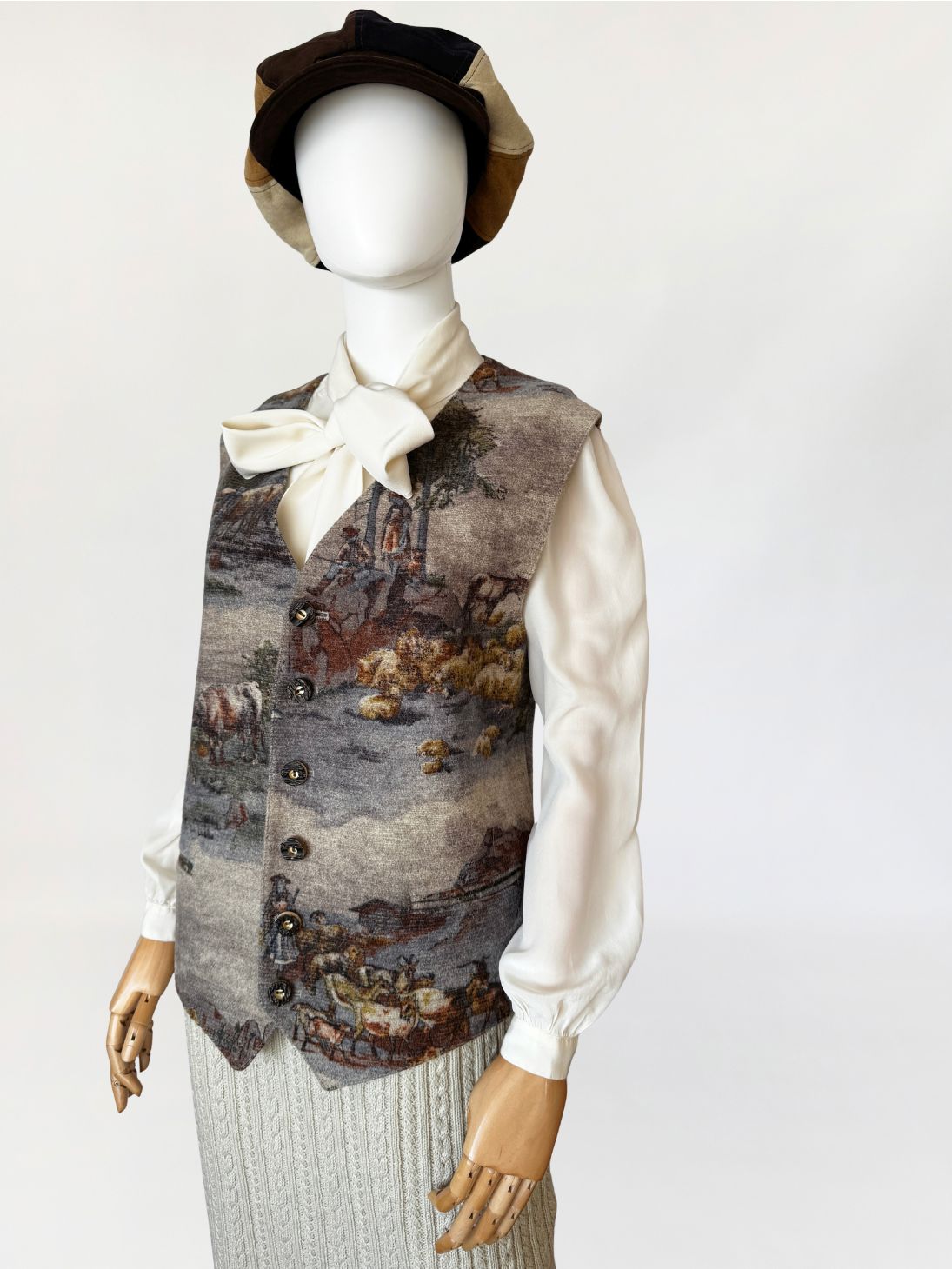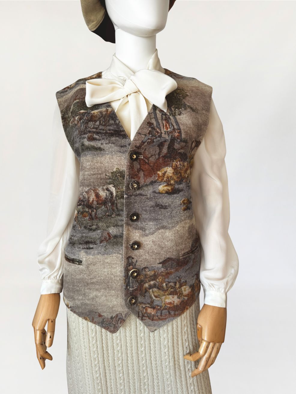 Kamizelka vintage wykonana z wełnianej tkaniny o miękkiej, lekko filcowanej powierzchni, zdobionej wielobarwnym nadrukiem inspirowanym klasycznym pejzażem. Motyw przedstawiający sceny wiejskie z postaciami i zwierzętami został rozłożony równomiernie na całej powierzchni, z zachowaniem spójności wzoru na przodzie i tyle. Fason dopasowany, bez rękawów, z głębokim dekoltem w kształcie litery V.