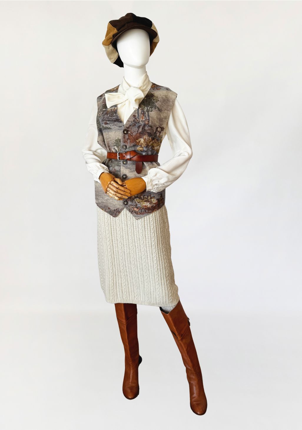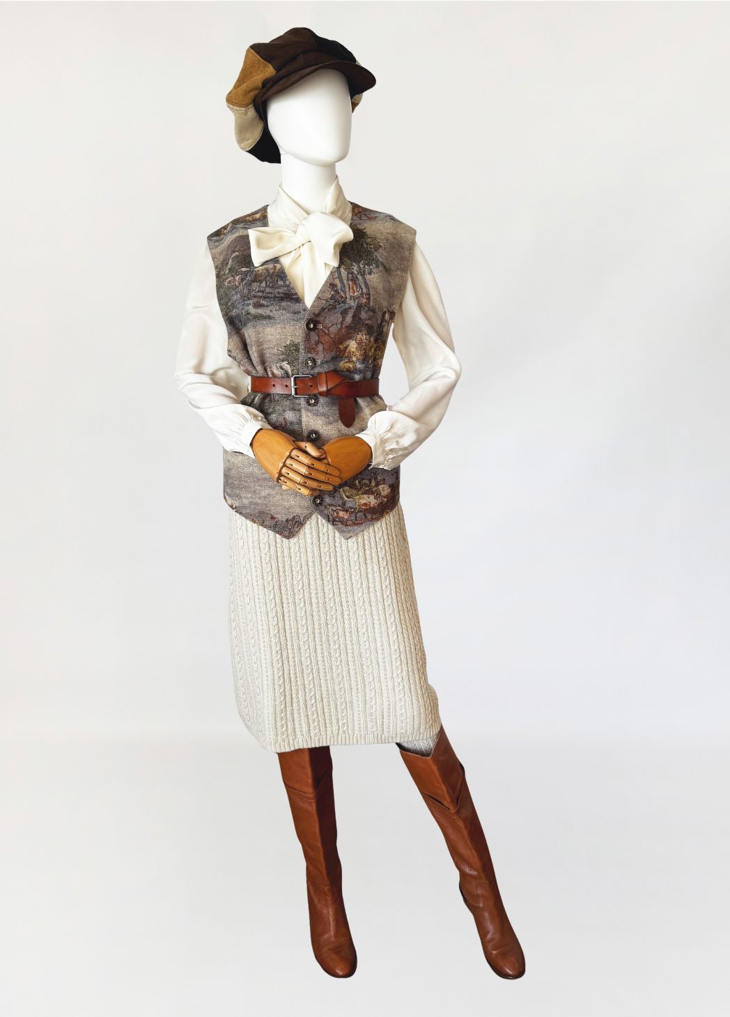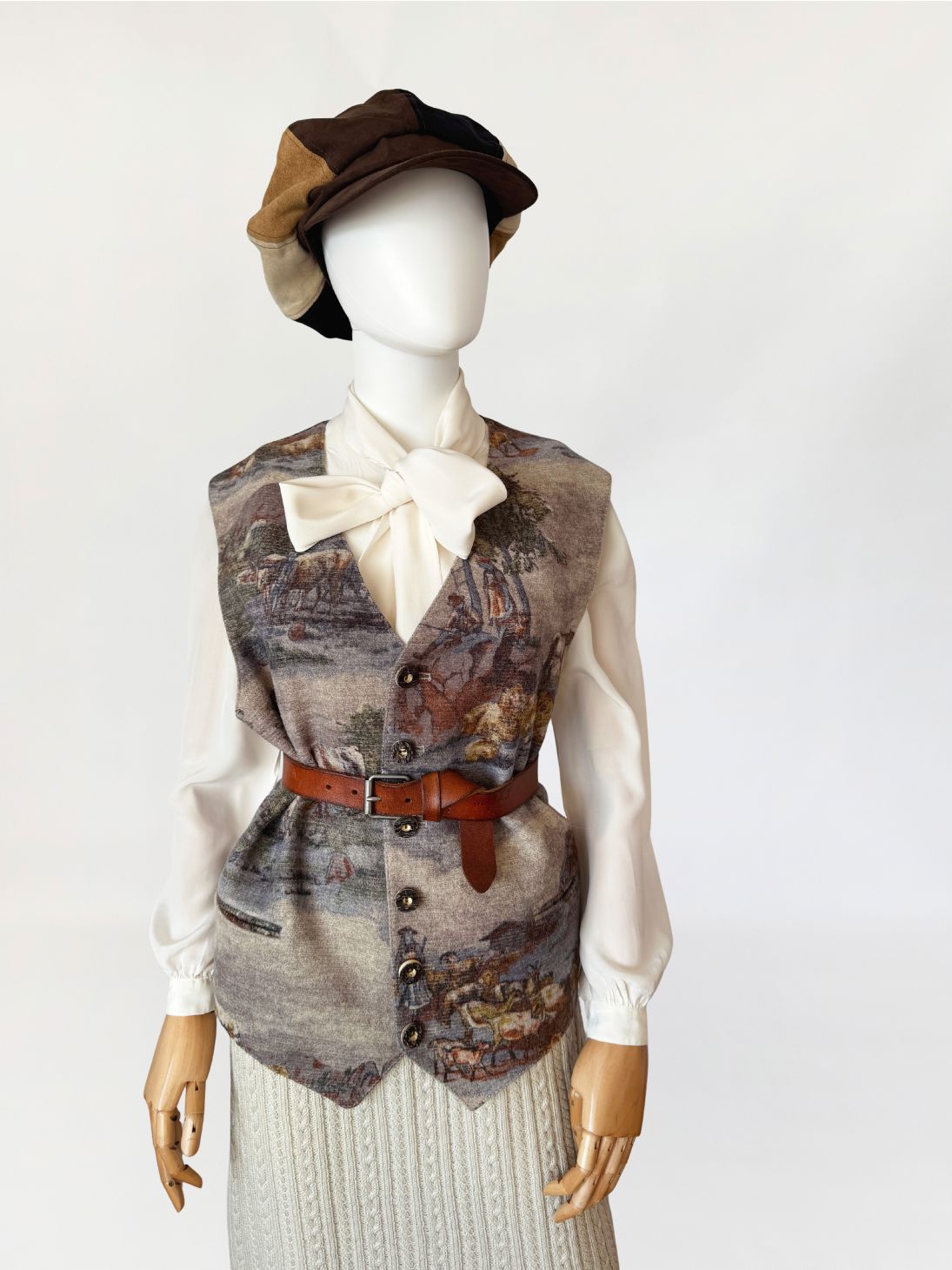Kamizelka vintage wykonana z wełnianej tkaniny o miękkiej, lekko filcowanej powierzchni, zdobionej wielobarwnym nadrukiem inspirowanym klasycznym pejzażem. Motyw przedstawiający sceny wiejskie z postaciami i zwierzętami został rozłożony równomiernie na całej powierzchni, z zachowaniem spójności wzoru na przodzie i tyle. Fason dopasowany, bez rękawów, z głębokim dekoltem w kształcie litery V.