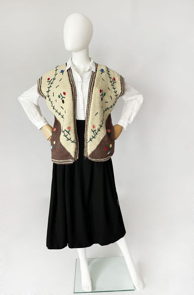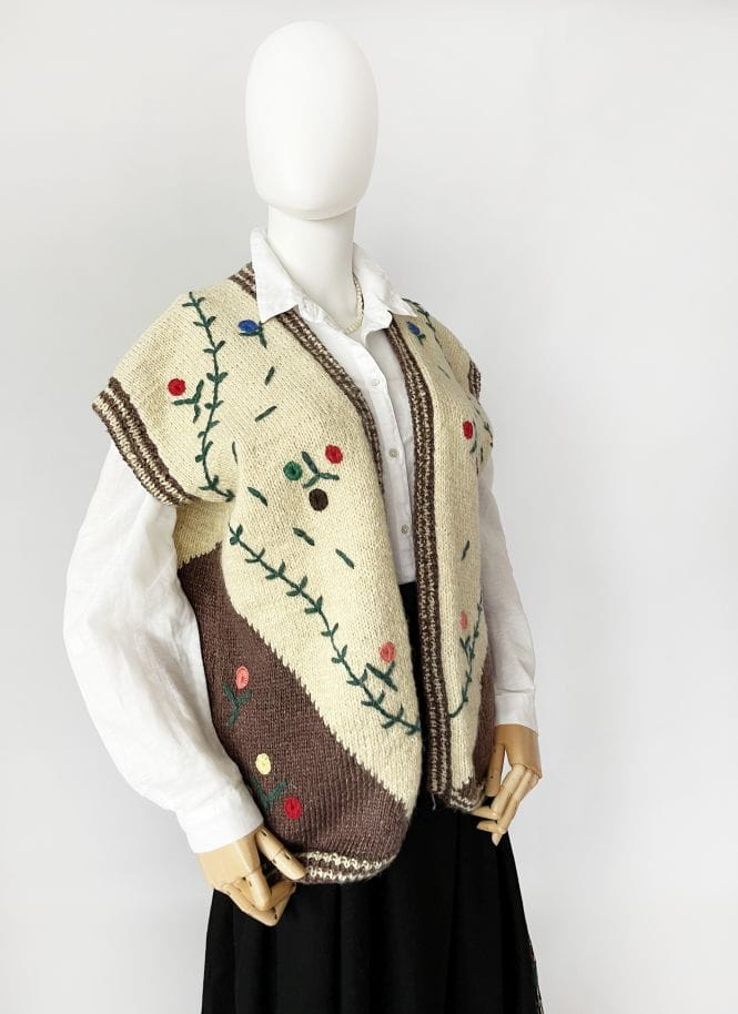Ręcznie robiona, wełniana kamizelka vintage w folkowym stylu. Na całości wyszywane kolorowe aplikacje. Fason otwarty.
