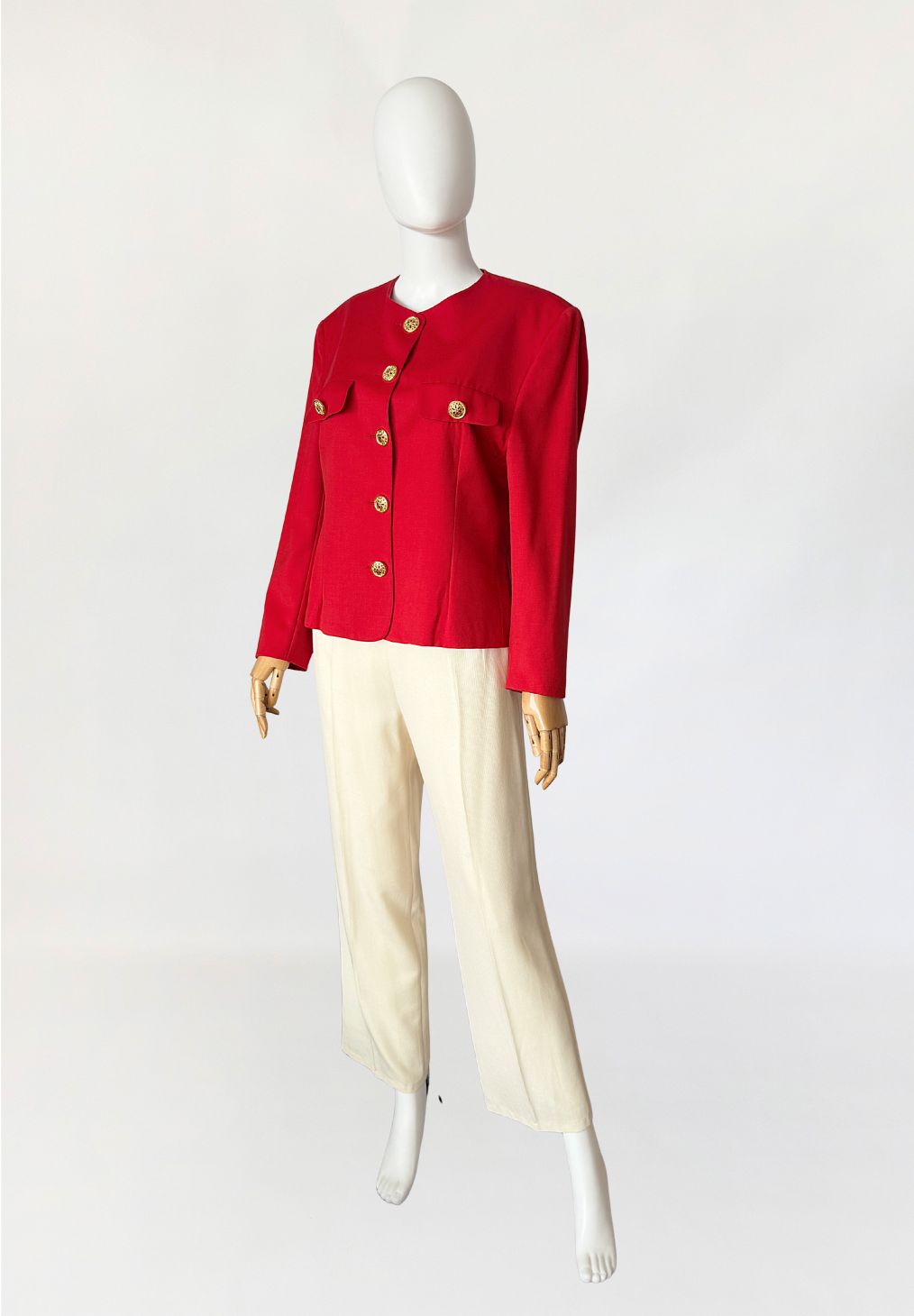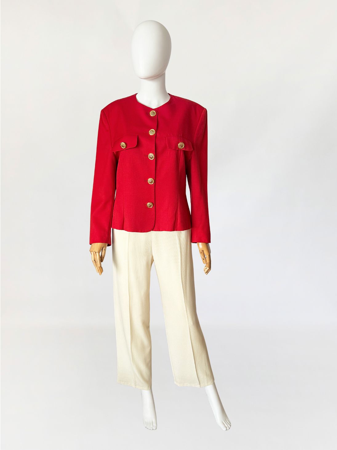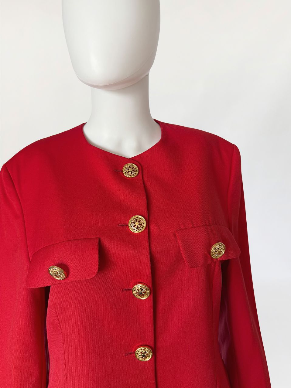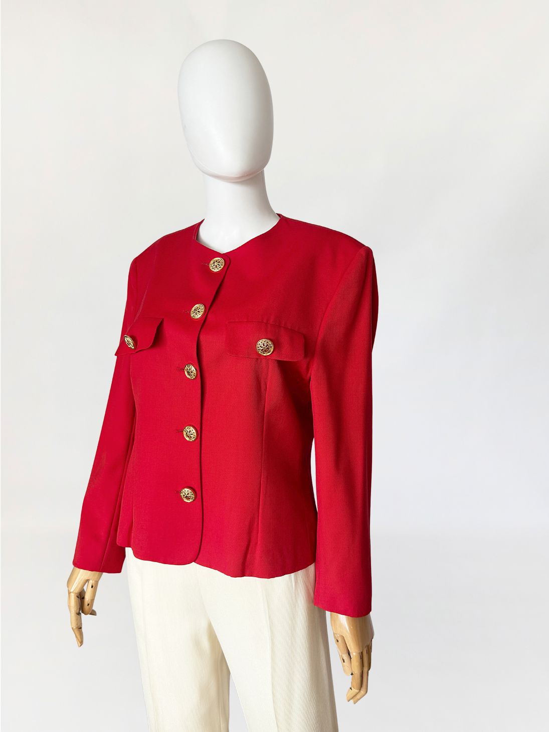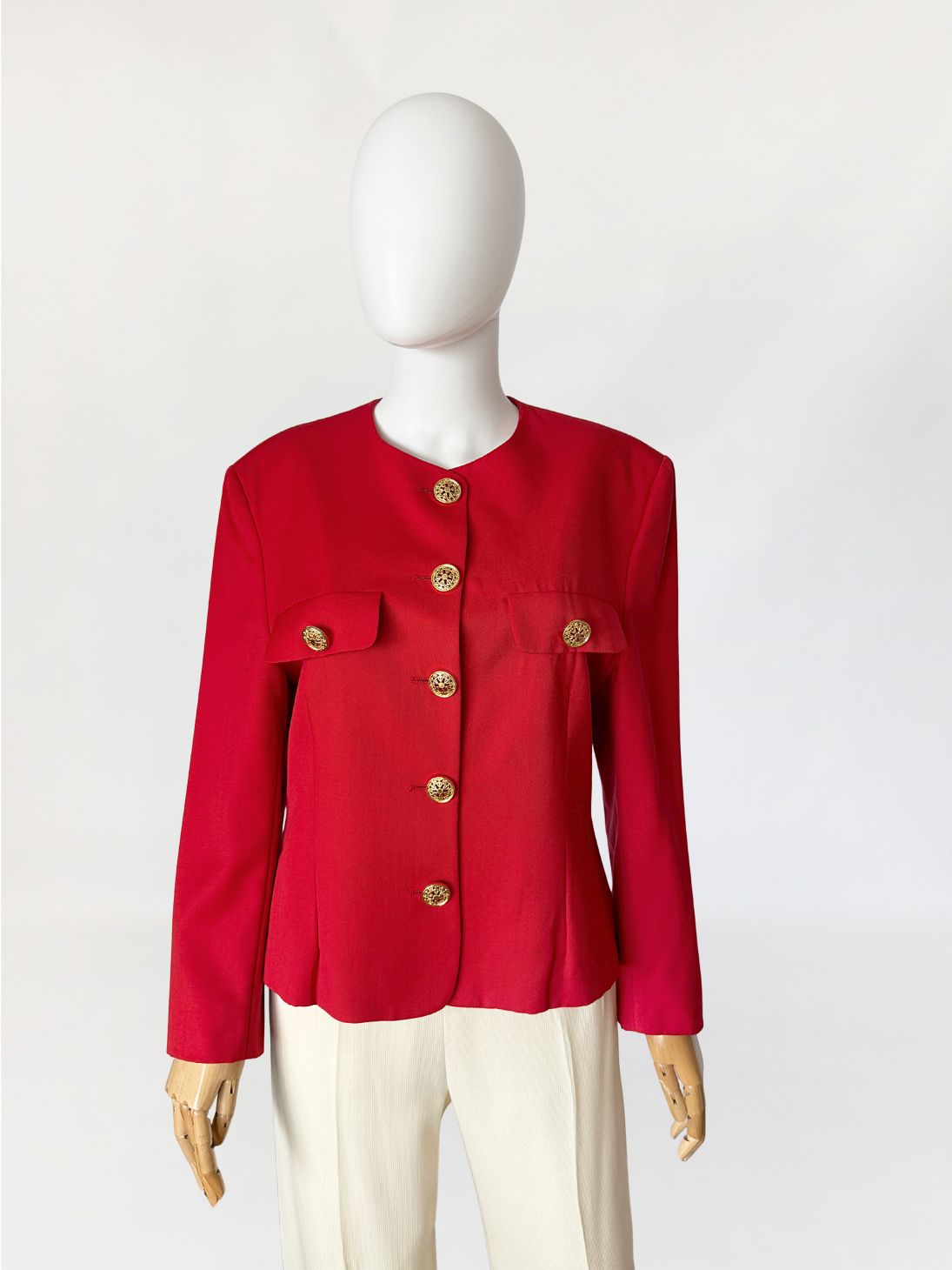 Włoska marynarka vintage wykonana z lekkiej tkaniny wełnianej w nasyconym odcieniu czerwieni. Fason dopasowany, z pionowymi cięciami modelującymi sylwetkę oraz lekko zaznaczoną talią. Linia ramion z delikatnym wypełnieniem konstrukcyjnym. Dekolt okrągły, bez kołnierza. Przód zapinany na rząd dekoracyjnych, złotych guzików w formie złotych rozet. Na wysokości biustu naszyte patki imitujące kieszenie, również wykończone guzikami.