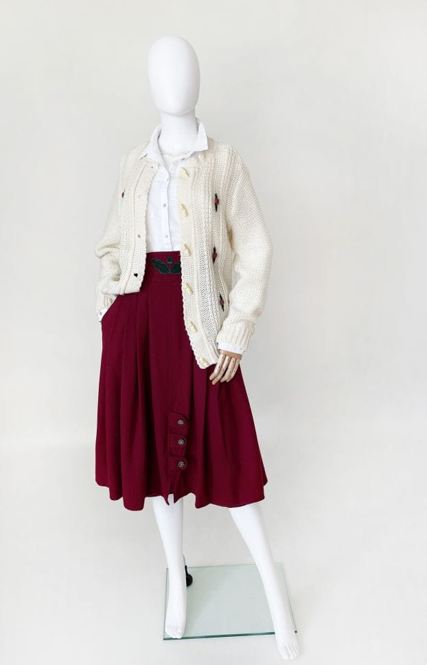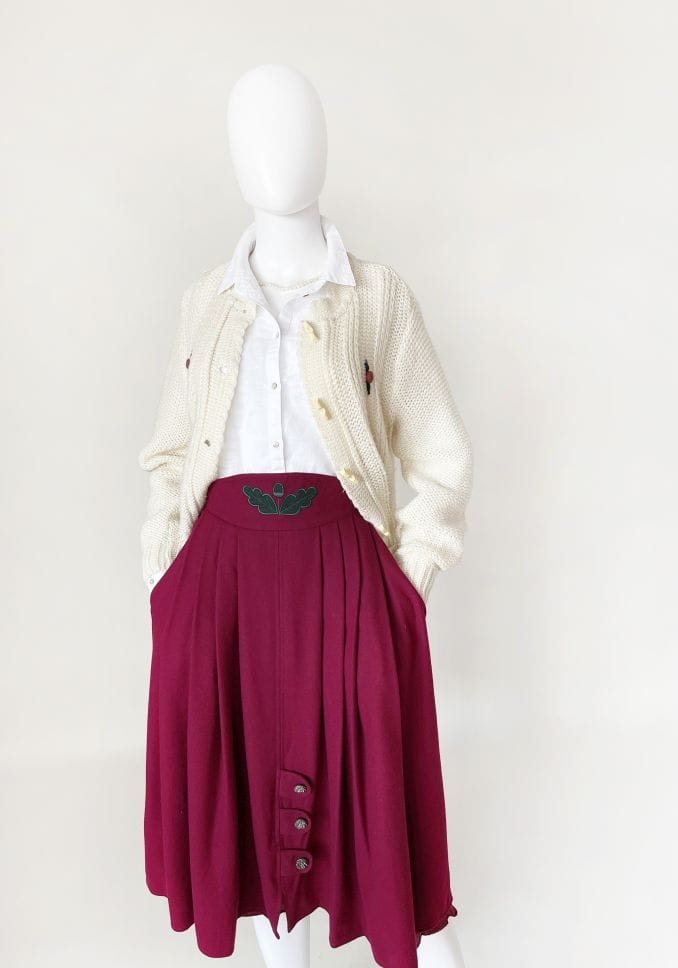 Austriacka spódnica vintage wykonana z miękkiej tkaniny z przewagą wełny. Rozkloszowany fason z kontrafałdami. W pasie haftowana aplikacja. Po bokach ma wsuwane kieszenie. U dołu dekoracyjne zapięcie na metalowe guziki. Model z podszewką.
