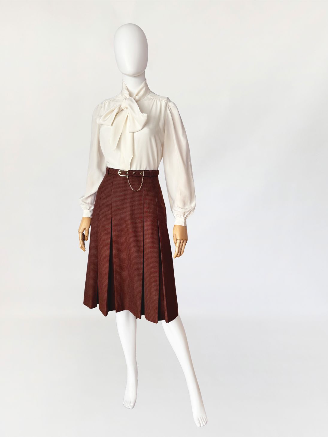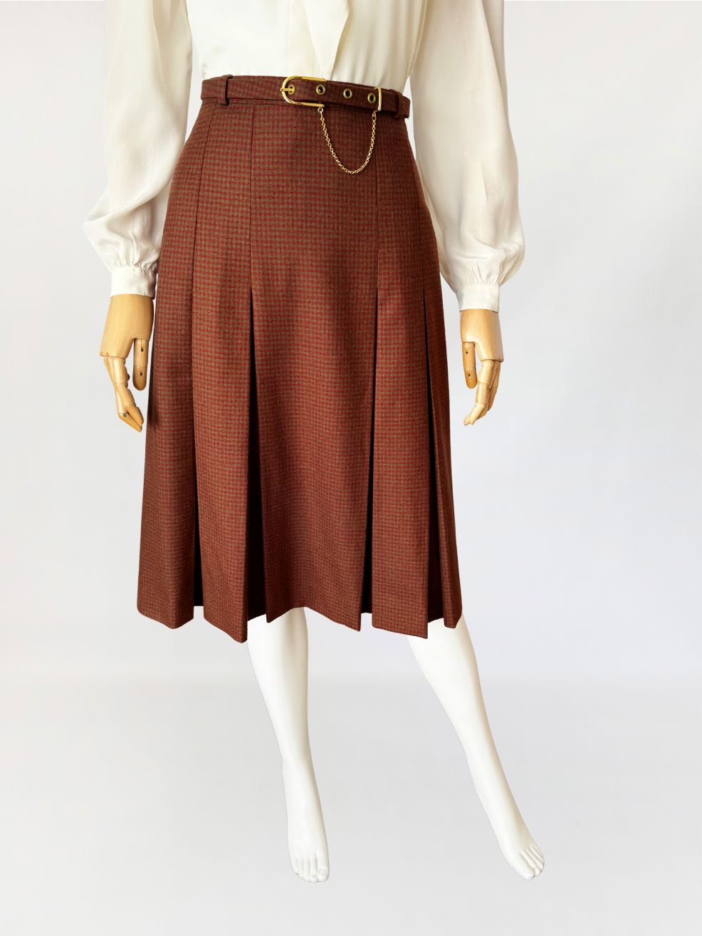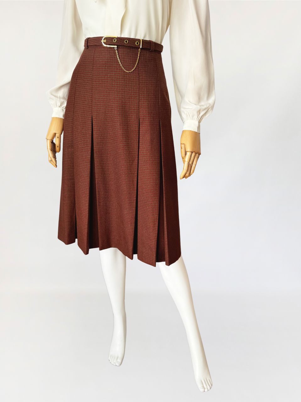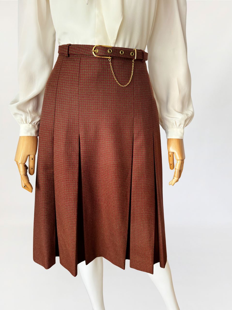 Spódnica vintage, wykonana z wełnianej tkaniny w drobną kratkę w odcieniach ciepłego brązu i przygaszonej czerwieni. Fason a-line, o długości midi, z wyższym stanem, formowany pionowymi kontrafałdami. W talii pasek powlekany tkaniną bazową, zapinany na metalową klamrę w kolorze złota, z dekoracyjnym łańcuszkiem.