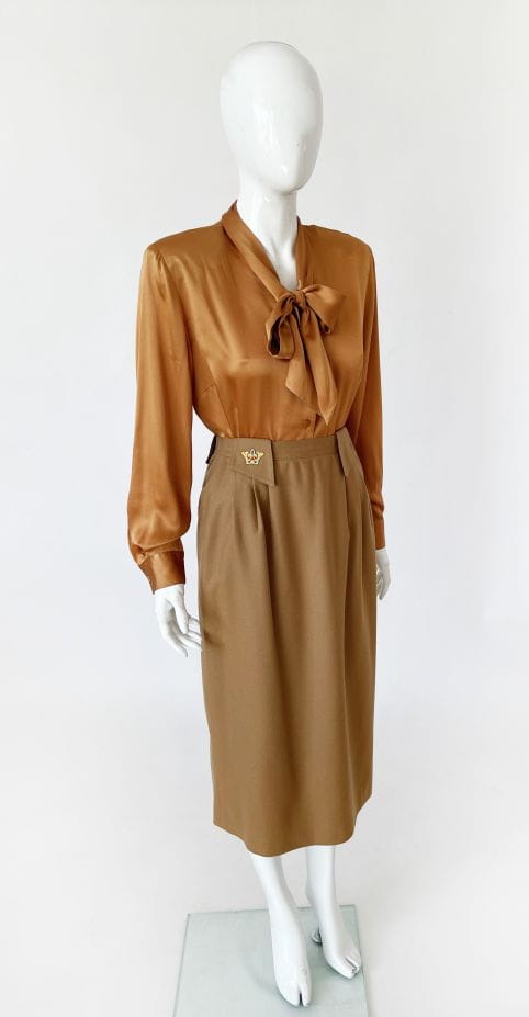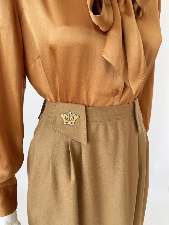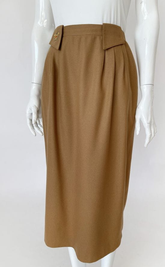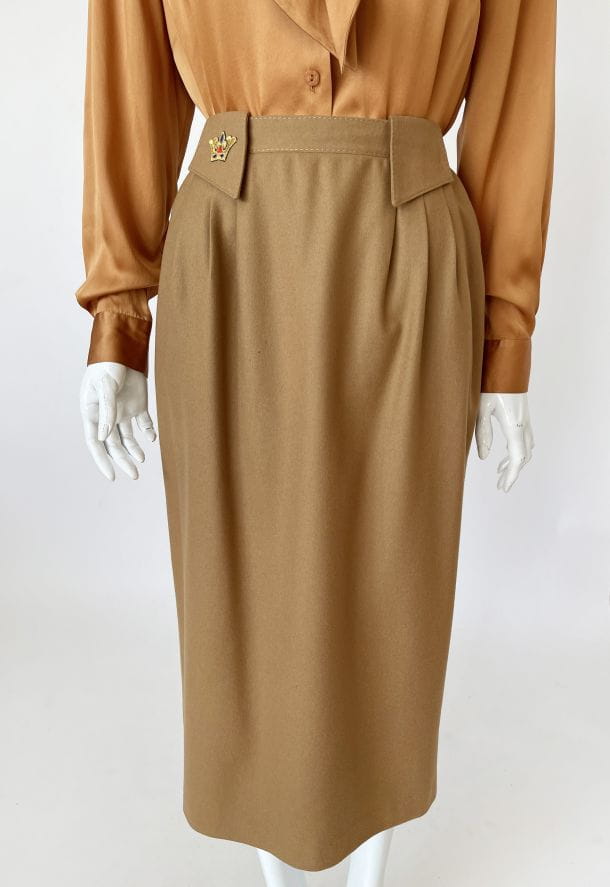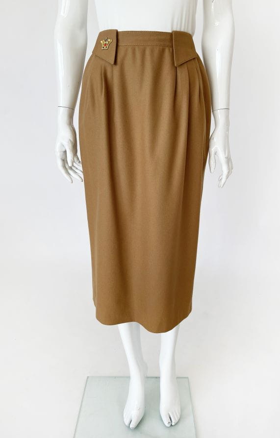 Wełniana spódnica vintage w kolorze camelowym. Szeroki pas z dużymi szlufkami, na jednej haftowana aplikacja. Po bokach zaszewki. Po metce z instrukcją pielęgnacji widać, że to stary egzemplarz.