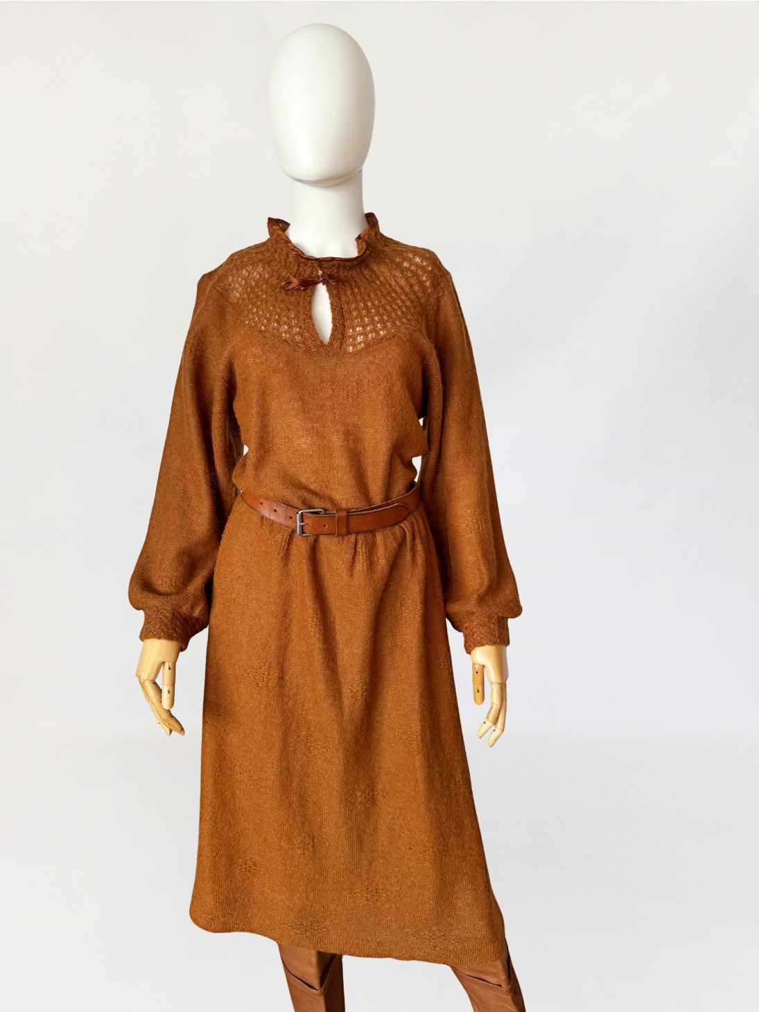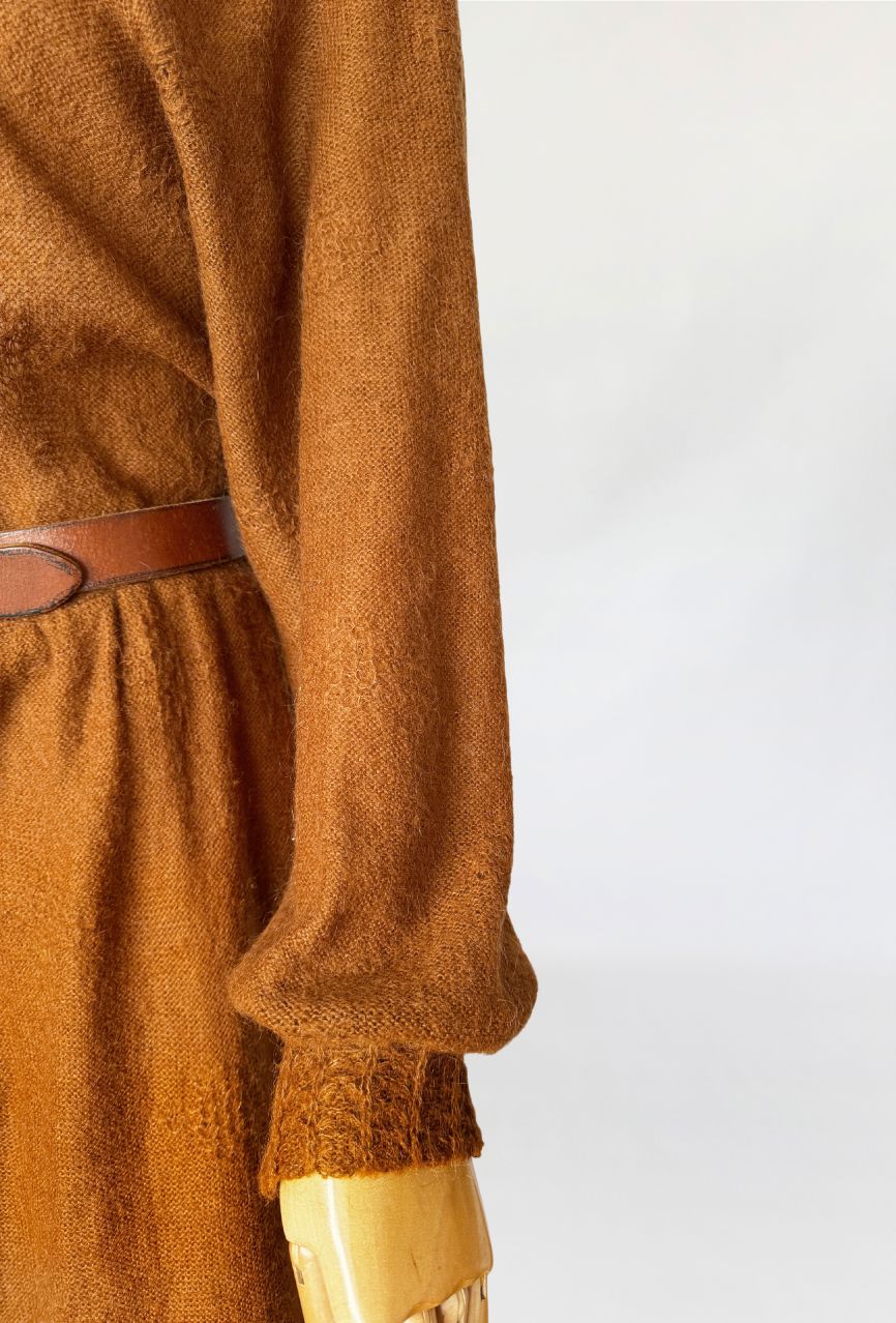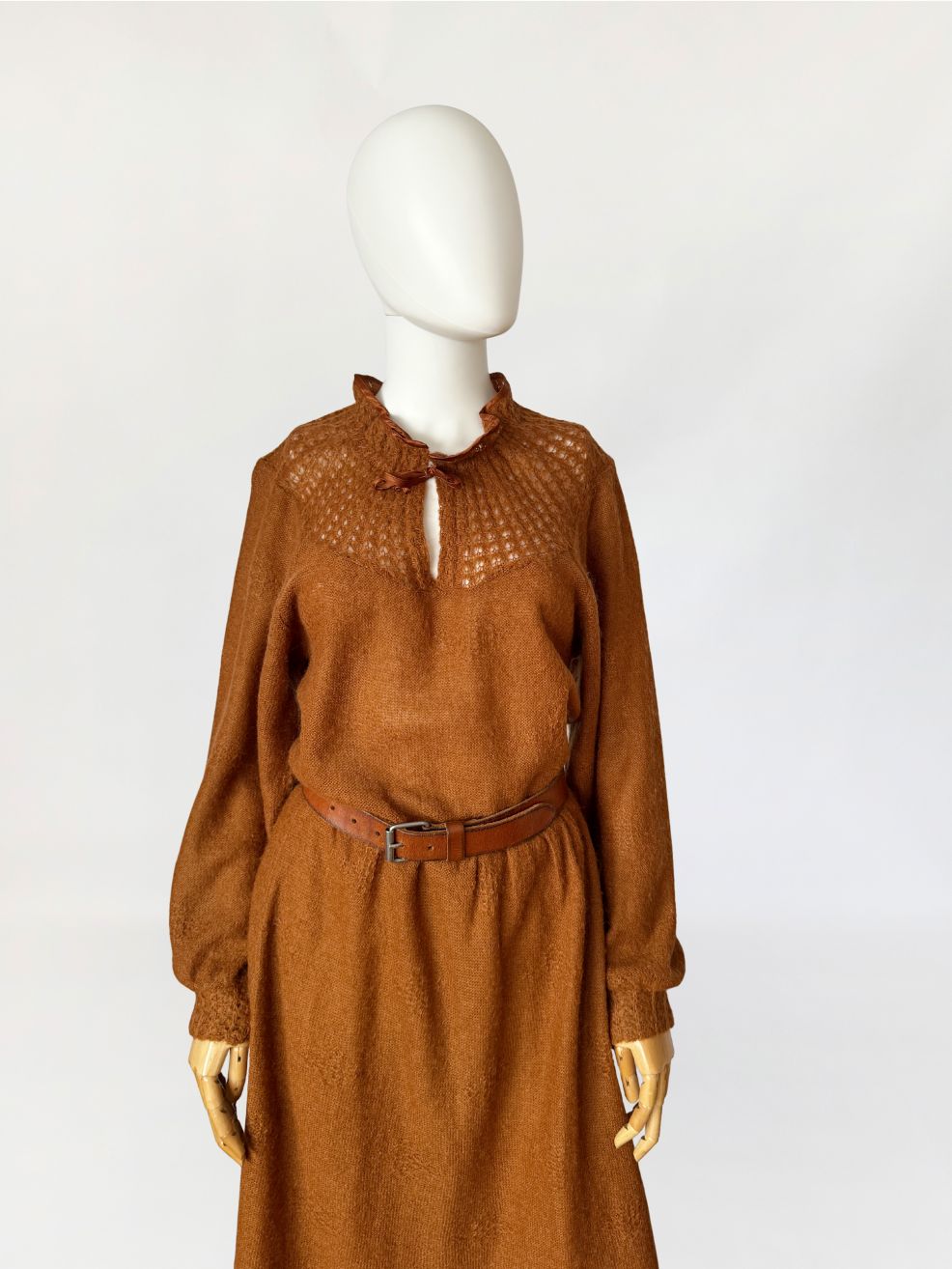 Sukienka vintage z lat 70-tych wykonana z lekkiej wełnianej dzianiny o wyraźnie widocznej strukturze oczek i delikatnym, naturalnym włosiu przędzy.
