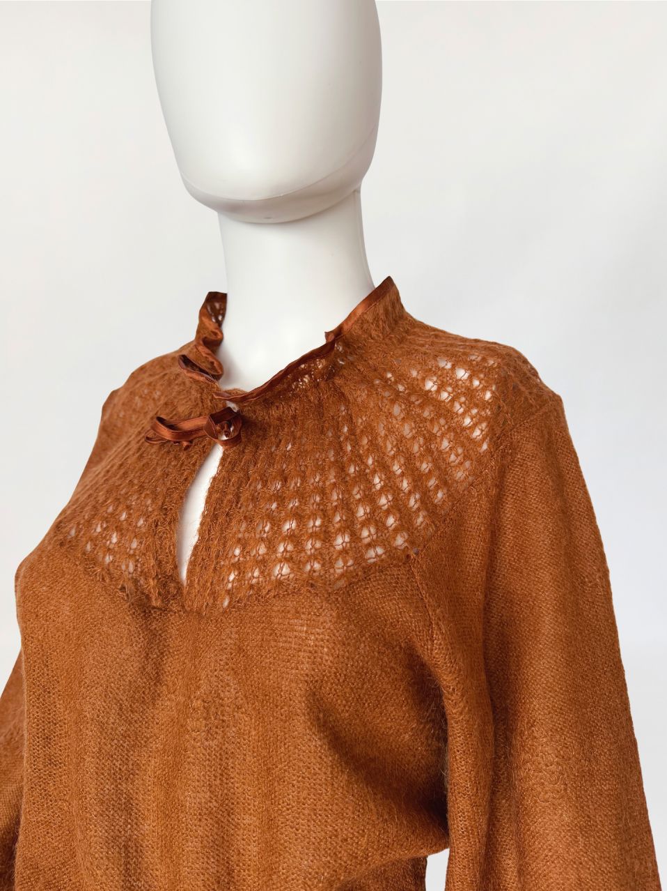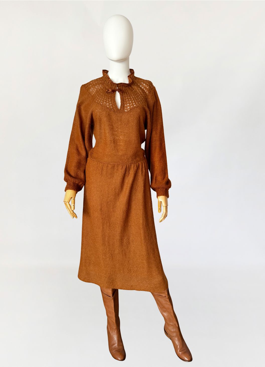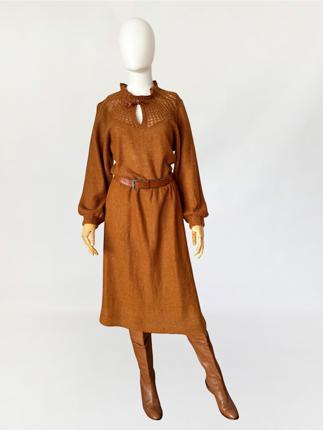 Sukienka vintage z lat 70-tych wykonana z lekkiej wełnianej dzianiny o wyraźnie widocznej strukturze oczek i delikatnym, naturalnym włosiu przędzy.