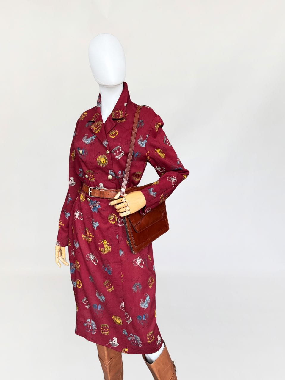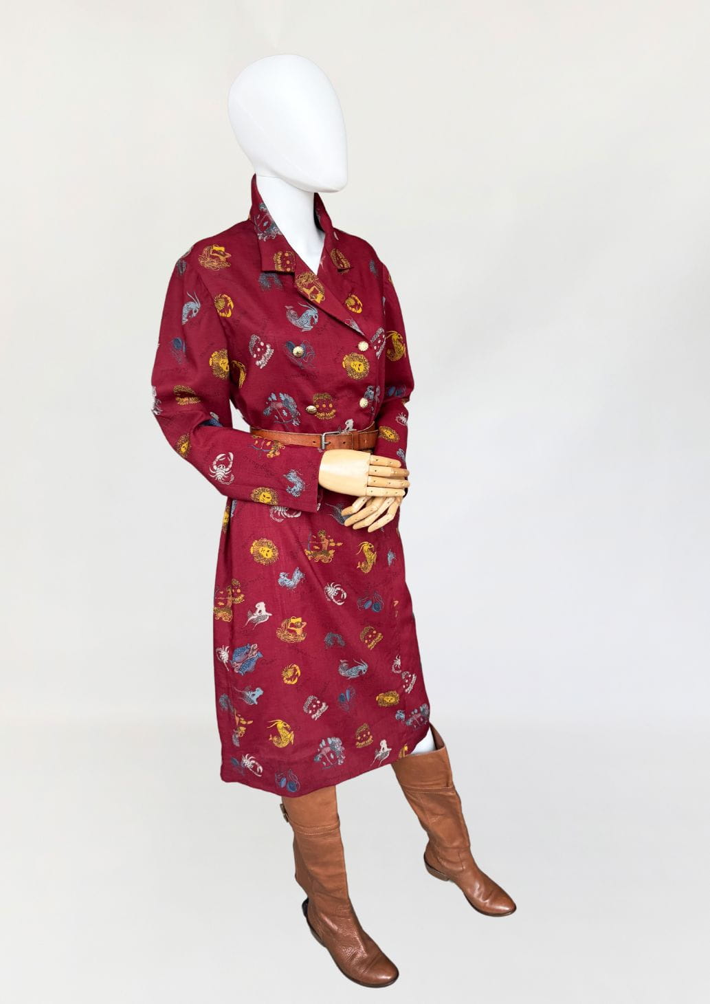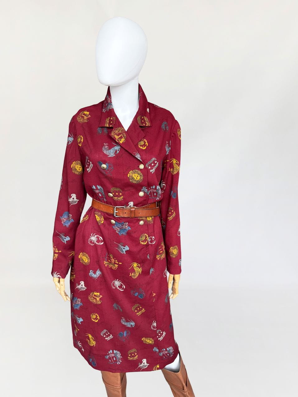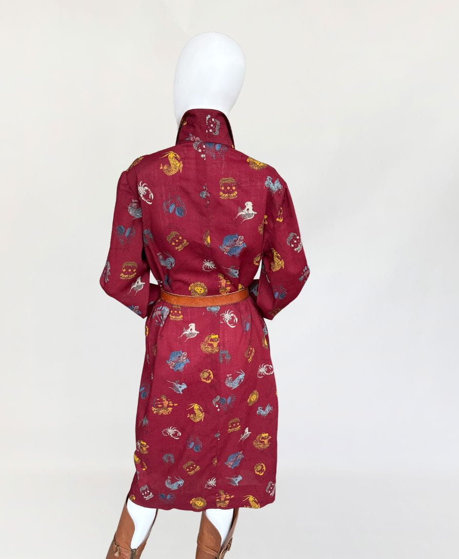 Sukienka vintage wykonana z włoskiej wełnianej tkaniny w odcieniu burgundu w kolorowe wzory - znaki zodiaku. Brak oznaczenia surowcowego, ale to lekka czysta wełna. Sukienka szyta domowo na maszynie. Prosty fason o długości midi. Klasyczne, długie rękawy. Góra z niedużym kołnierzem, zapinana dwurzędowo na złote guziki. Pasek nie jest elementem kompletu.