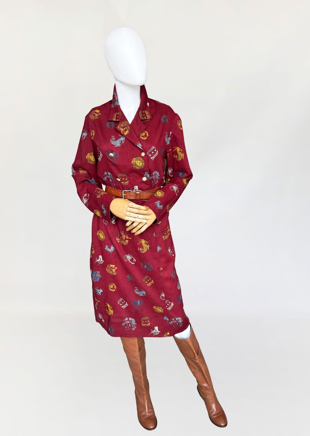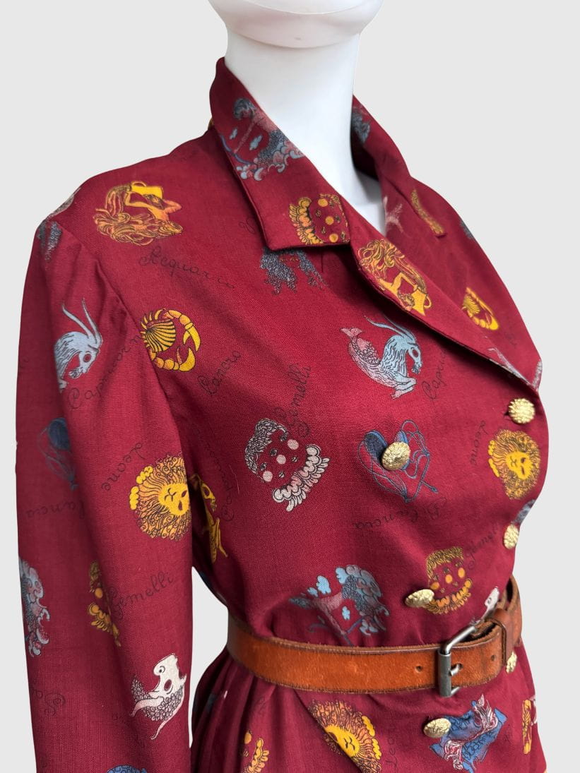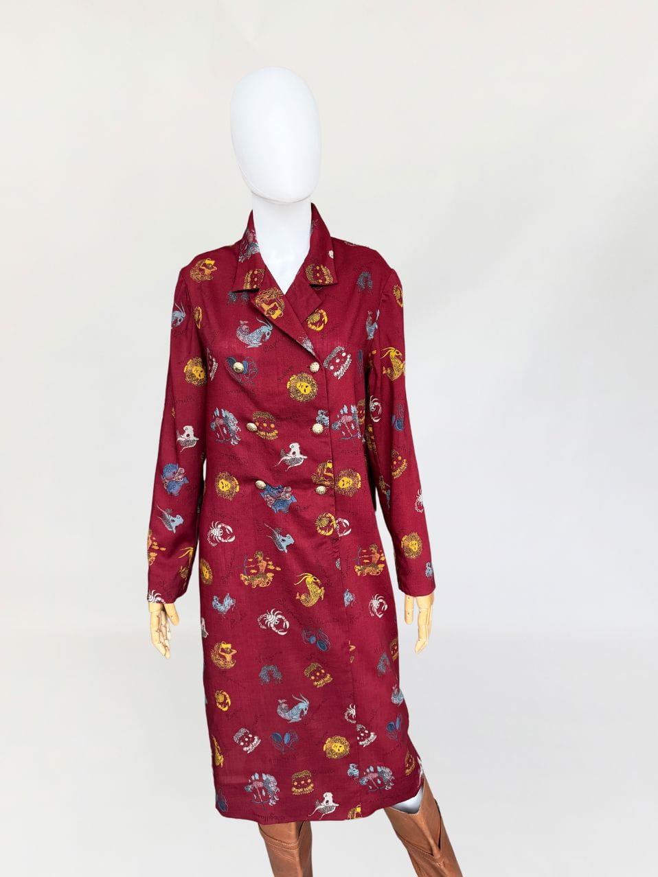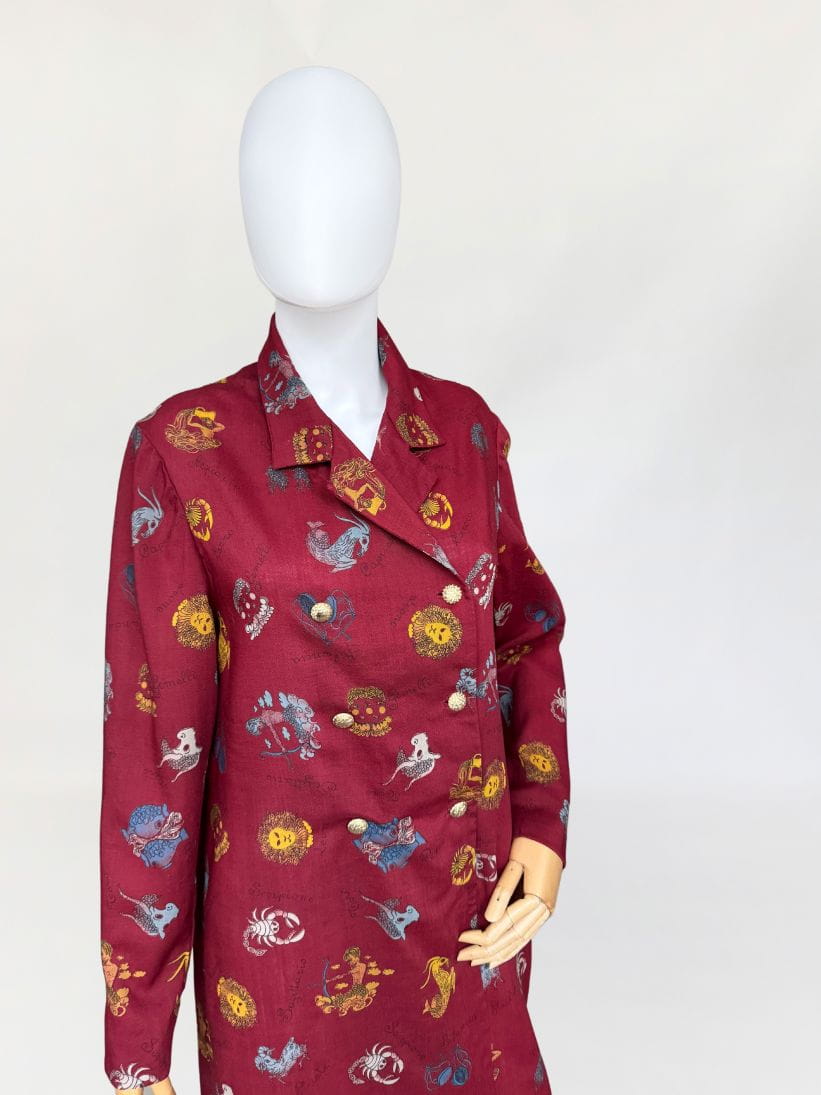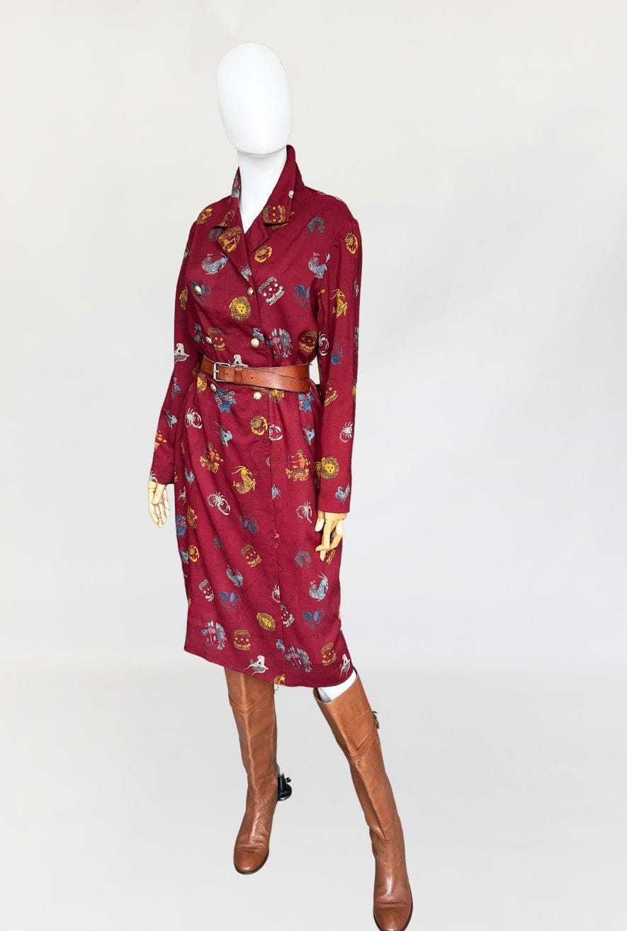 Sukienka vintage wykonana z włoskiej wełnianej tkaniny w odcieniu burgundu w kolorowe wzory - znaki zodiaku. Brak oznaczenia surowcowego, ale to lekka czysta wełna. Sukienka szyta domowo na maszynie. Prosty fason o długości midi. Klasyczne, długie rękawy. Góra z niedużym kołnierzem, zapinana dwurzędowo na złote guziki. Pasek nie jest elementem kompletu.
