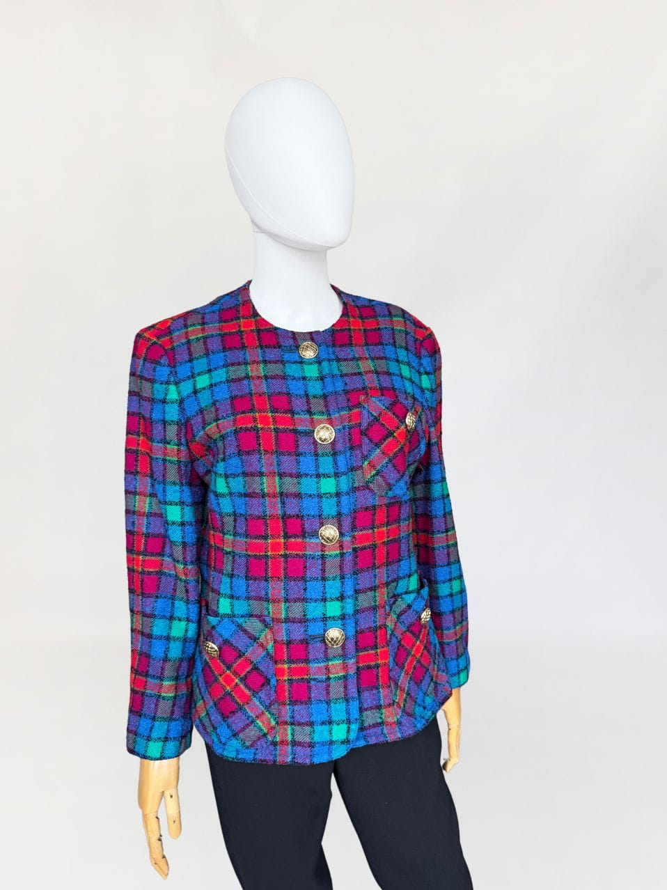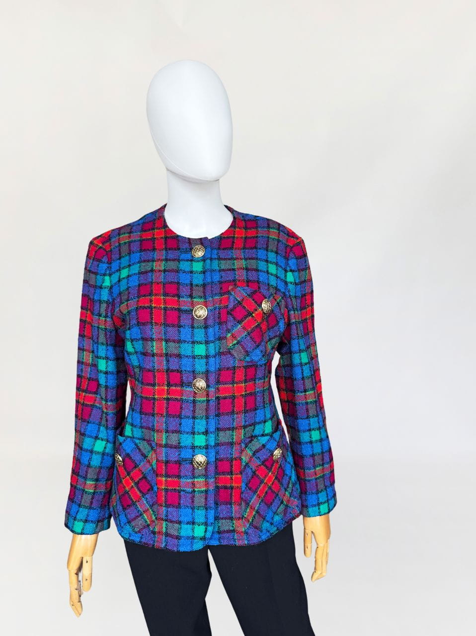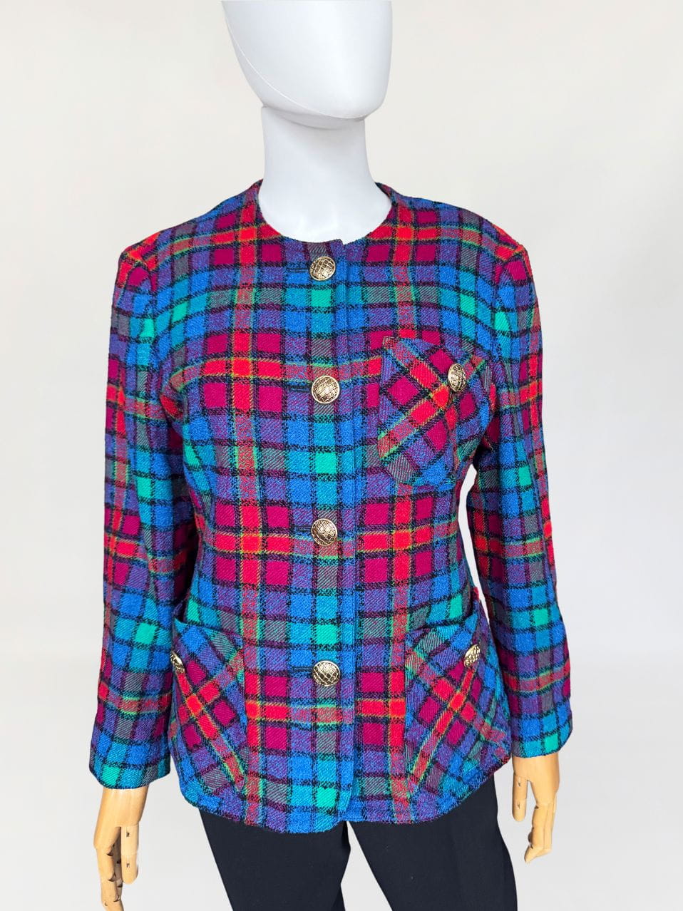 Marynarka vintage wykonana z wełnianego tweedu we wzór kraty w mocnej kolorystyce. Lekko taliowany, klasyczny fason z długimi rękawami i okrągłym dekoltem. Jednorzędowe zapięcie na duże złote guziki. W dolnej części kieszenie + jedna w górnej części.