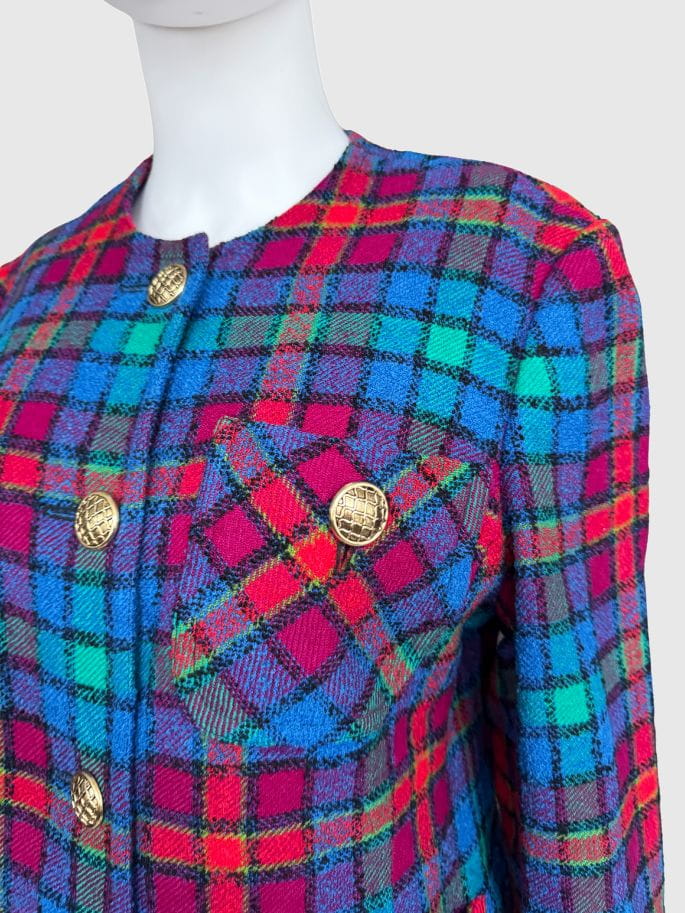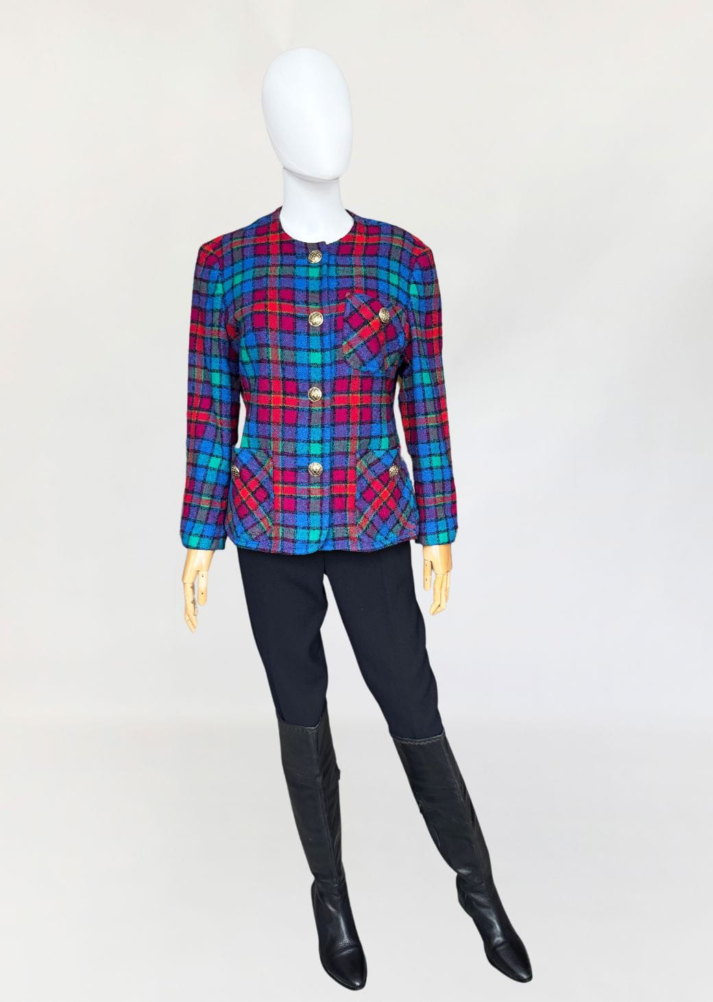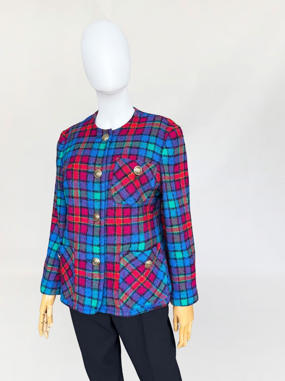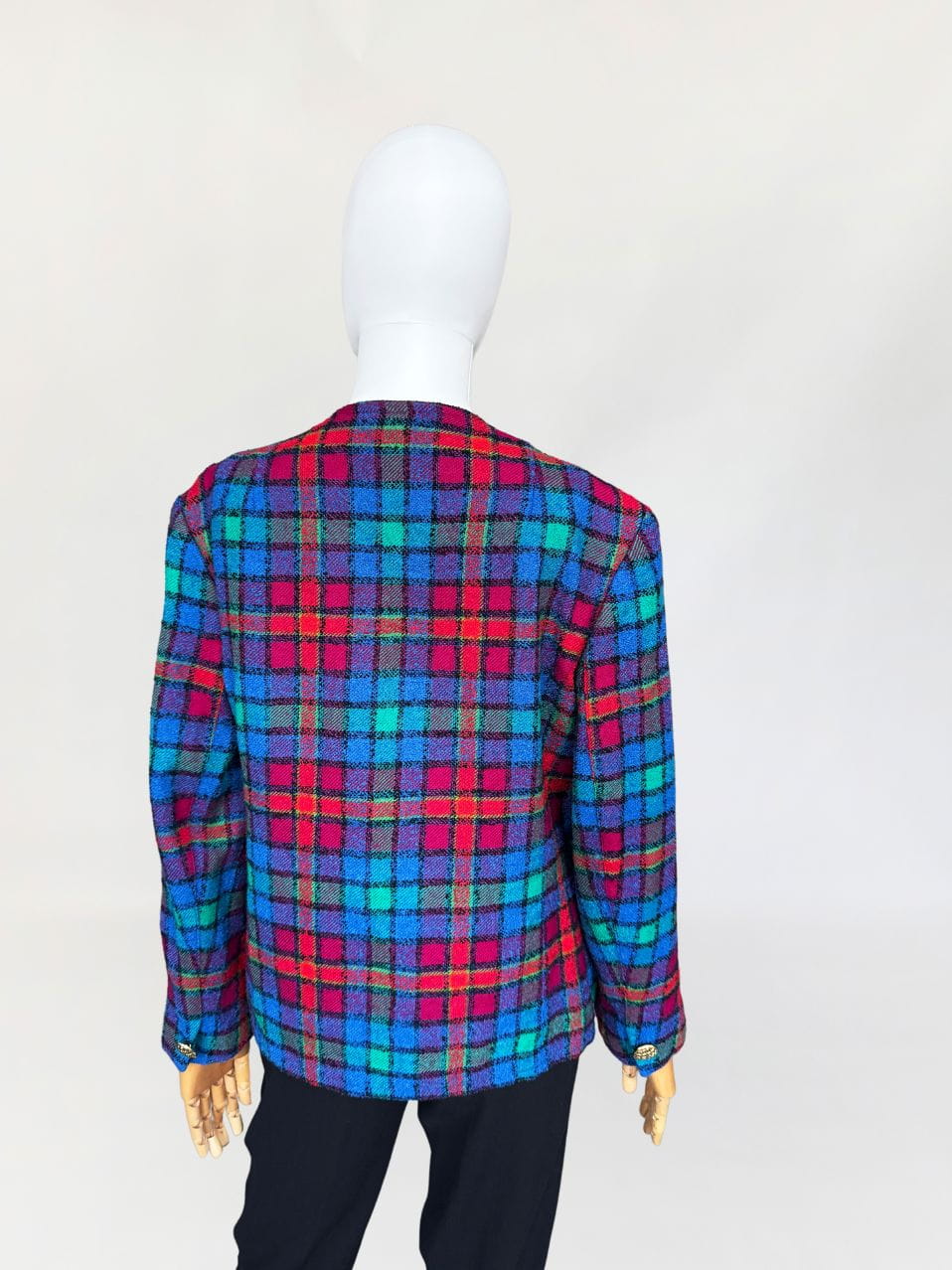 Marynarka vintage wykonana z wełnianego tweedu we wzór kraty w mocnej kolorystyce. Lekko taliowany, klasyczny fason z długimi rękawami i okrągłym dekoltem. Jednorzędowe zapięcie na duże złote guziki. W dolnej części kieszenie + jedna w górnej części.
