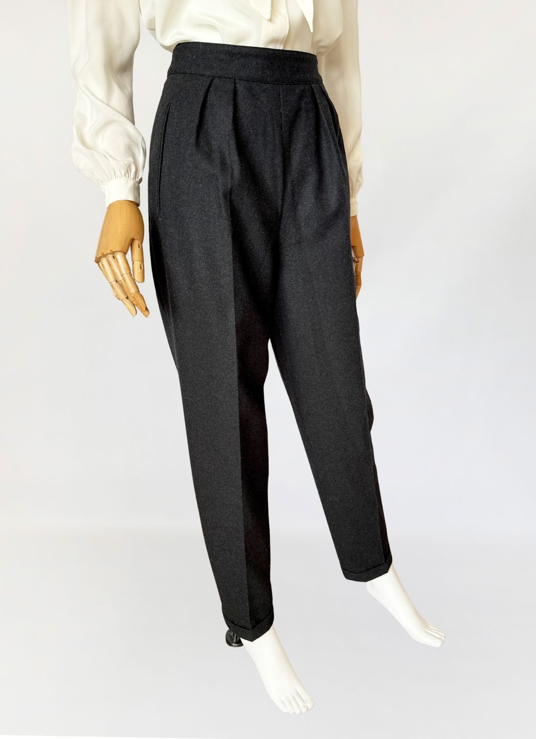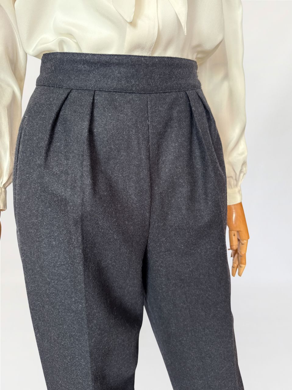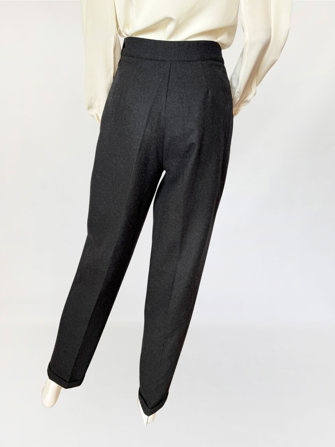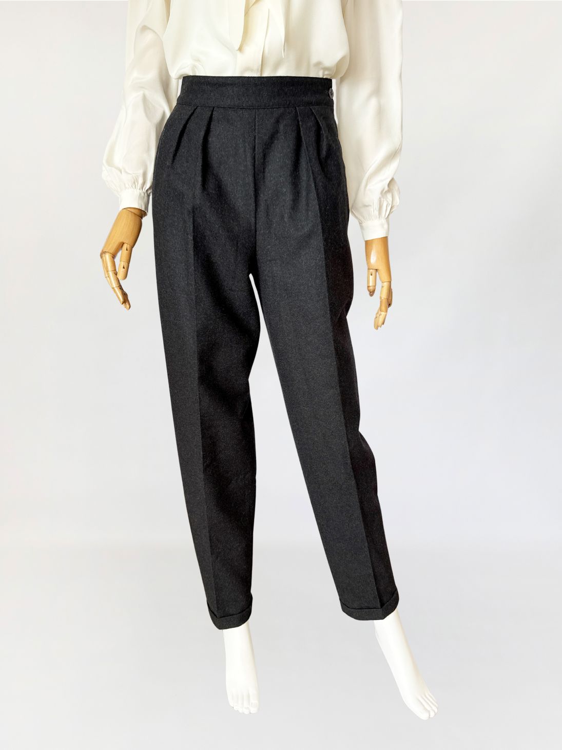 Cygaretki vintage z lat 80-tych o minimalistycznej ponadczasowej formie. Wykonane z wełnianej tkaniny w odcieniu grafitowej szarości, o klasycznym fasonie z wysokim stanem i zakładkami w talii. Proste nogawki lekko zwężane ku dołowi, z zaprasowanym kantem. Kieszenie boczne wpuszczane, zapięcie na suwak i boczny guzik.