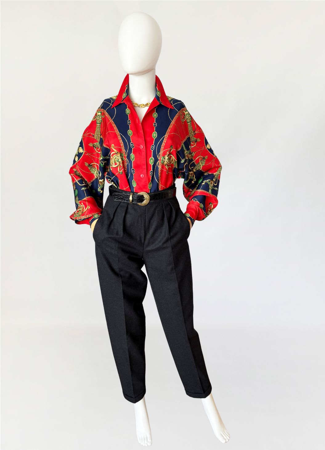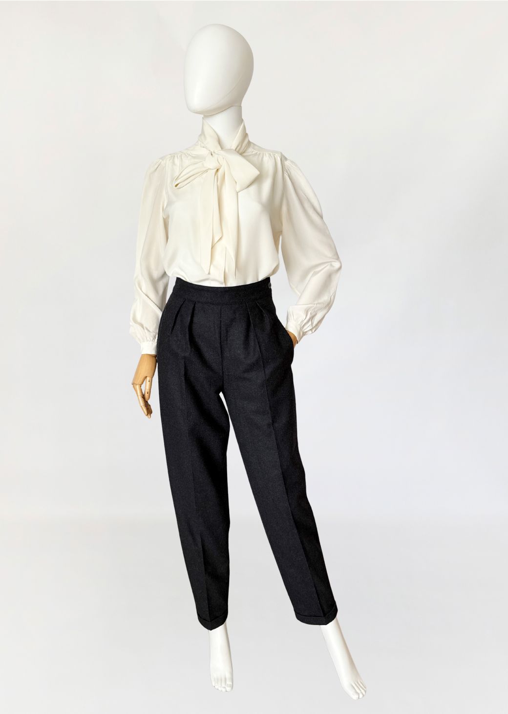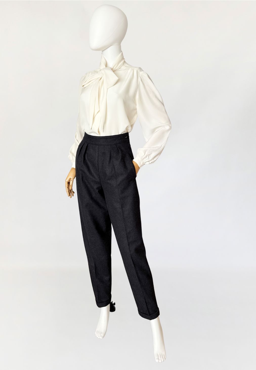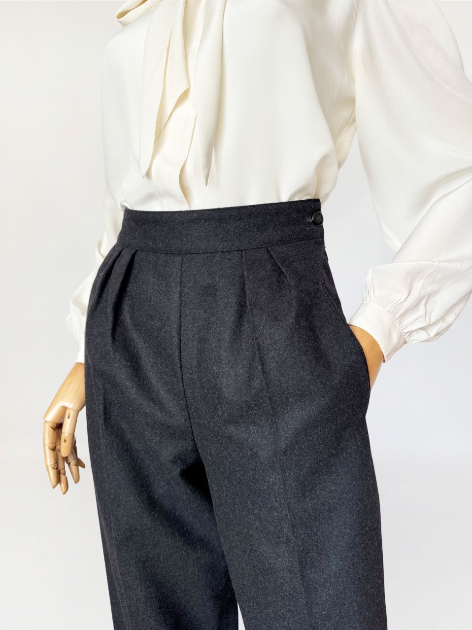 Cygaretki vintage z lat 80-tych o minimalistycznej ponadczasowej formie. Wykonane z wełnianej tkaniny w odcieniu grafitowej szarości, o klasycznym fasonie z wysokim stanem i zakładkami w talii. Proste nogawki lekko zwężane ku dołowi, z zaprasowanym kantem. Kieszenie boczne wpuszczane, zapięcie na suwak i boczny guzik.