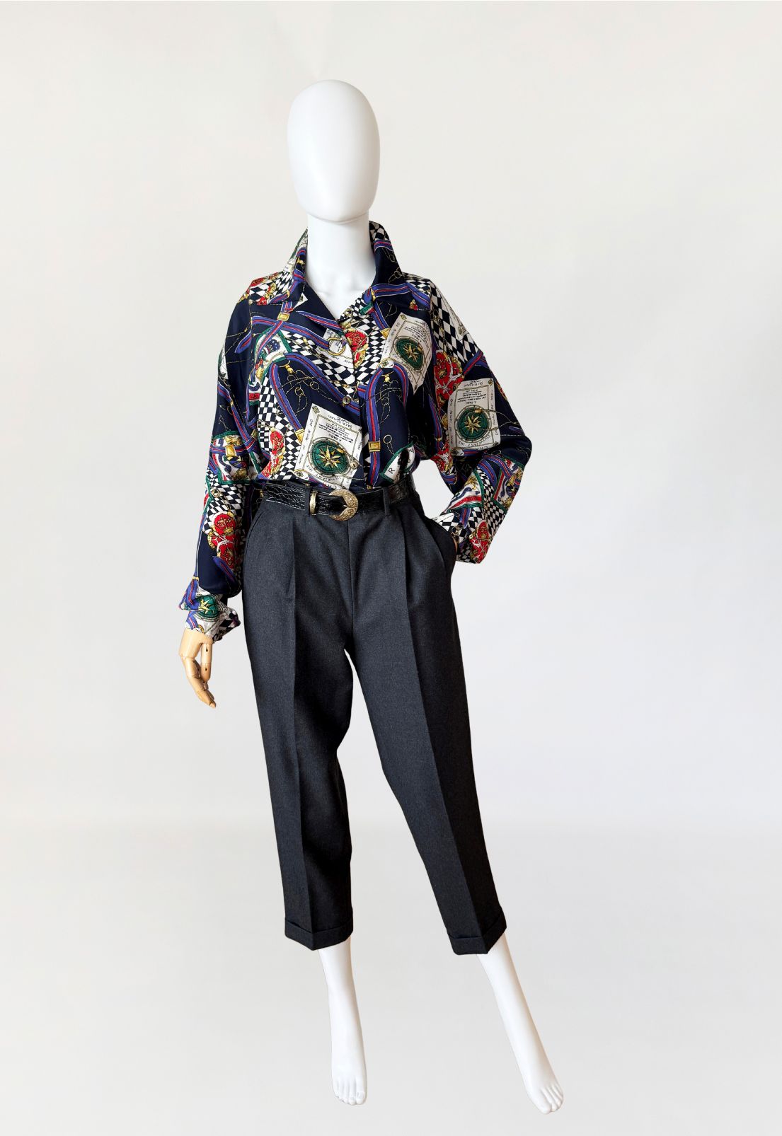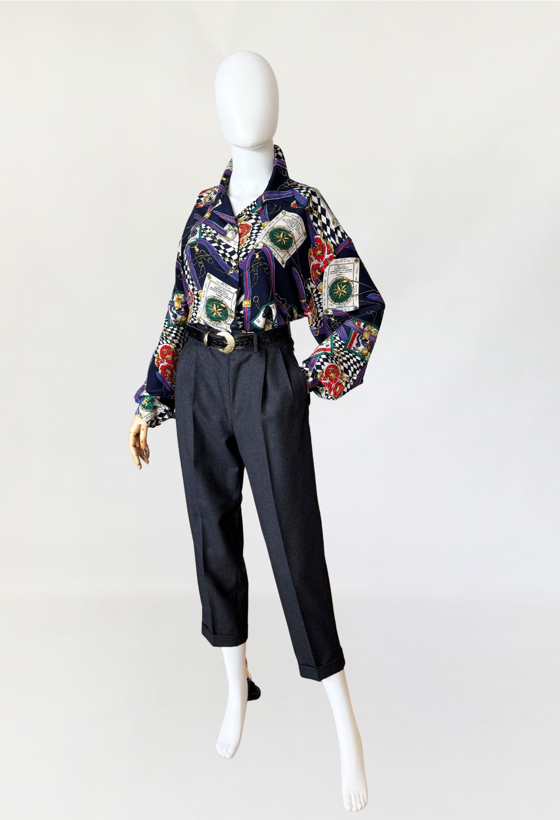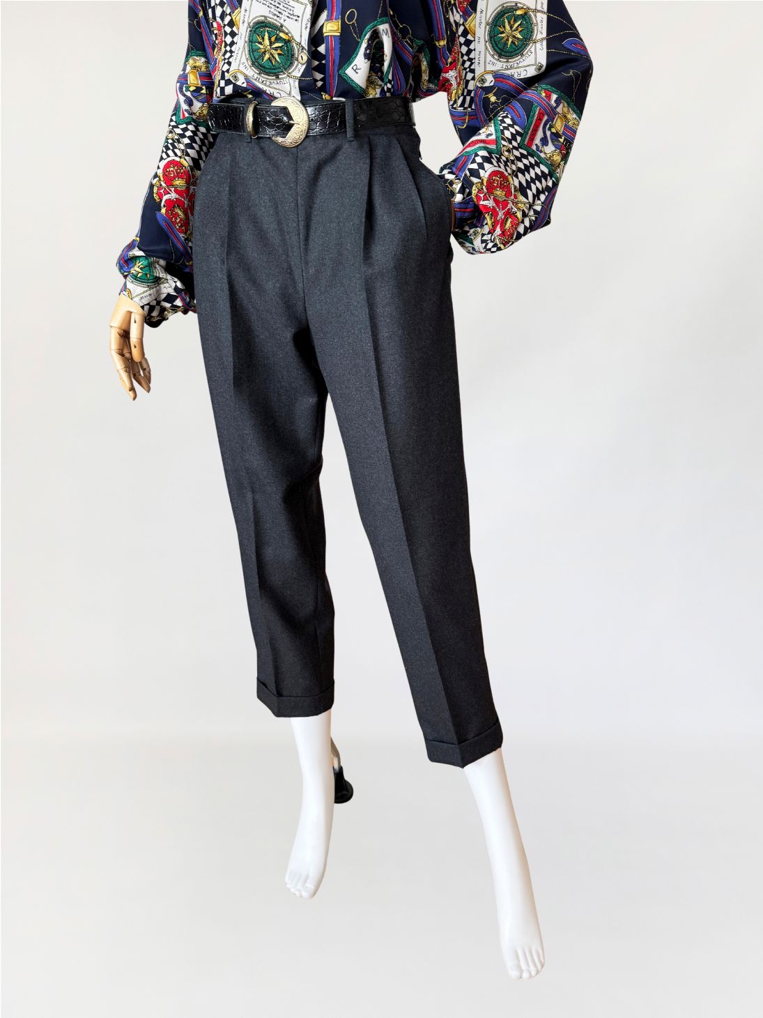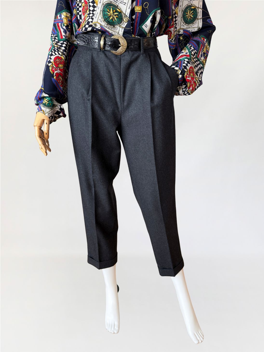 Spodnie vintage wykonane z wysokogatunkowej wełny o klasycznym fasonie cygaretek. Model z wysokim stanem i zaszewkami, które nadają konstrukcji eleganckiego kształtu. Nogawki zwężane ku dołowi, zakończone mankietem. Zapinane na guzik i zamek, z bocznymi kieszeniami. Starannie odszyte wnętrze i dopracowane proporcje podkreślają precyzję vintage krawiectwa.