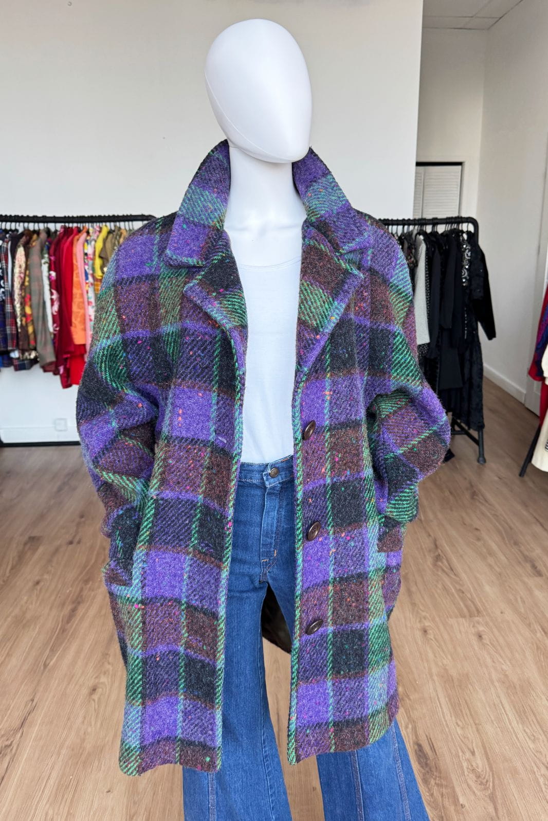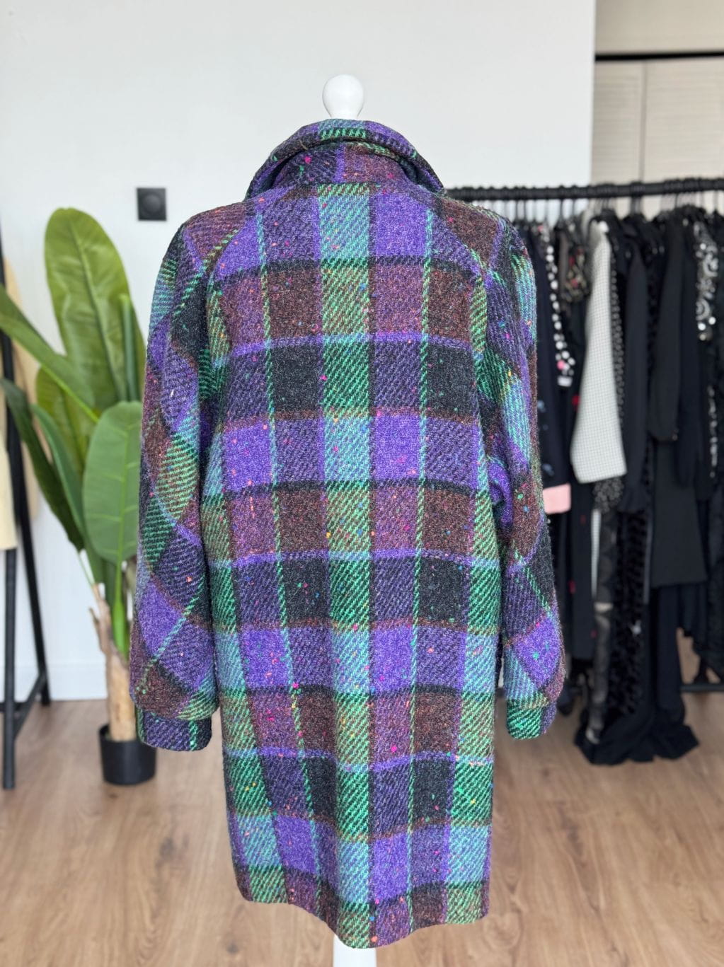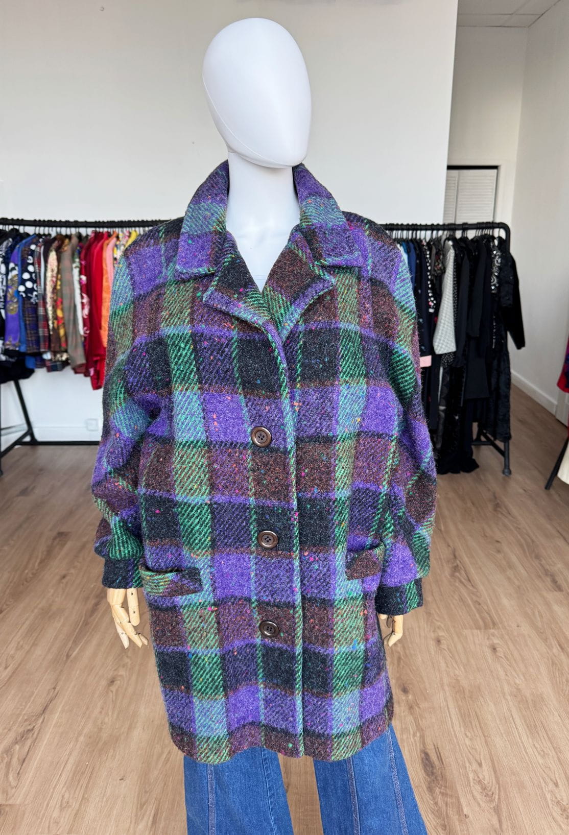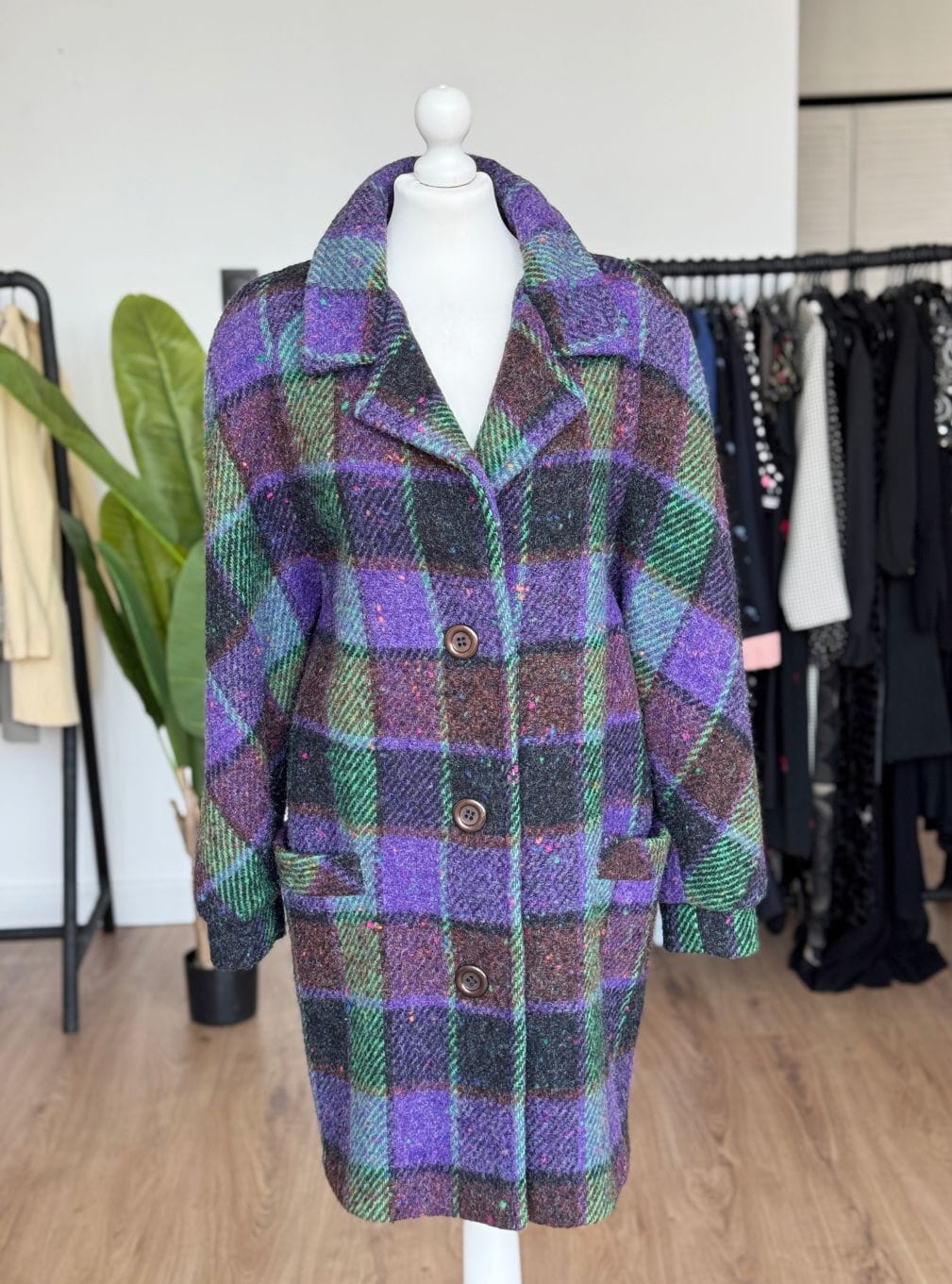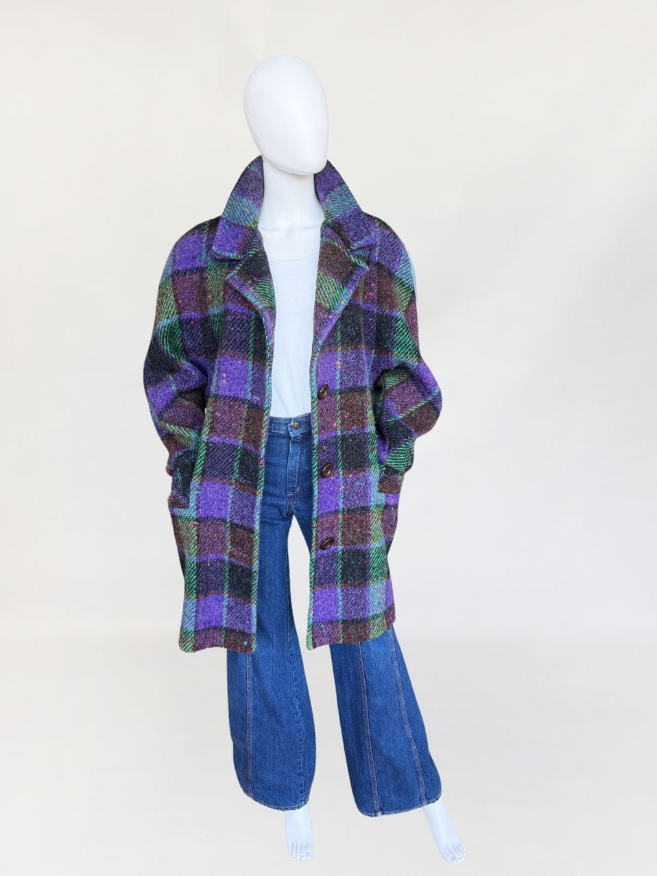 Płaszcz vintage produkcji włoskiej wykonany z wysokogatunkowej wełny o kraciastym deseniu z dominacją kolorów: fiolet, brąz, zieleń. Swobodny fason z rewersowym kołnierzem i długimi raglanowymi rękawami. Jednorzędowe zapięcie na duże guziki. W dolnej części kieszenie.