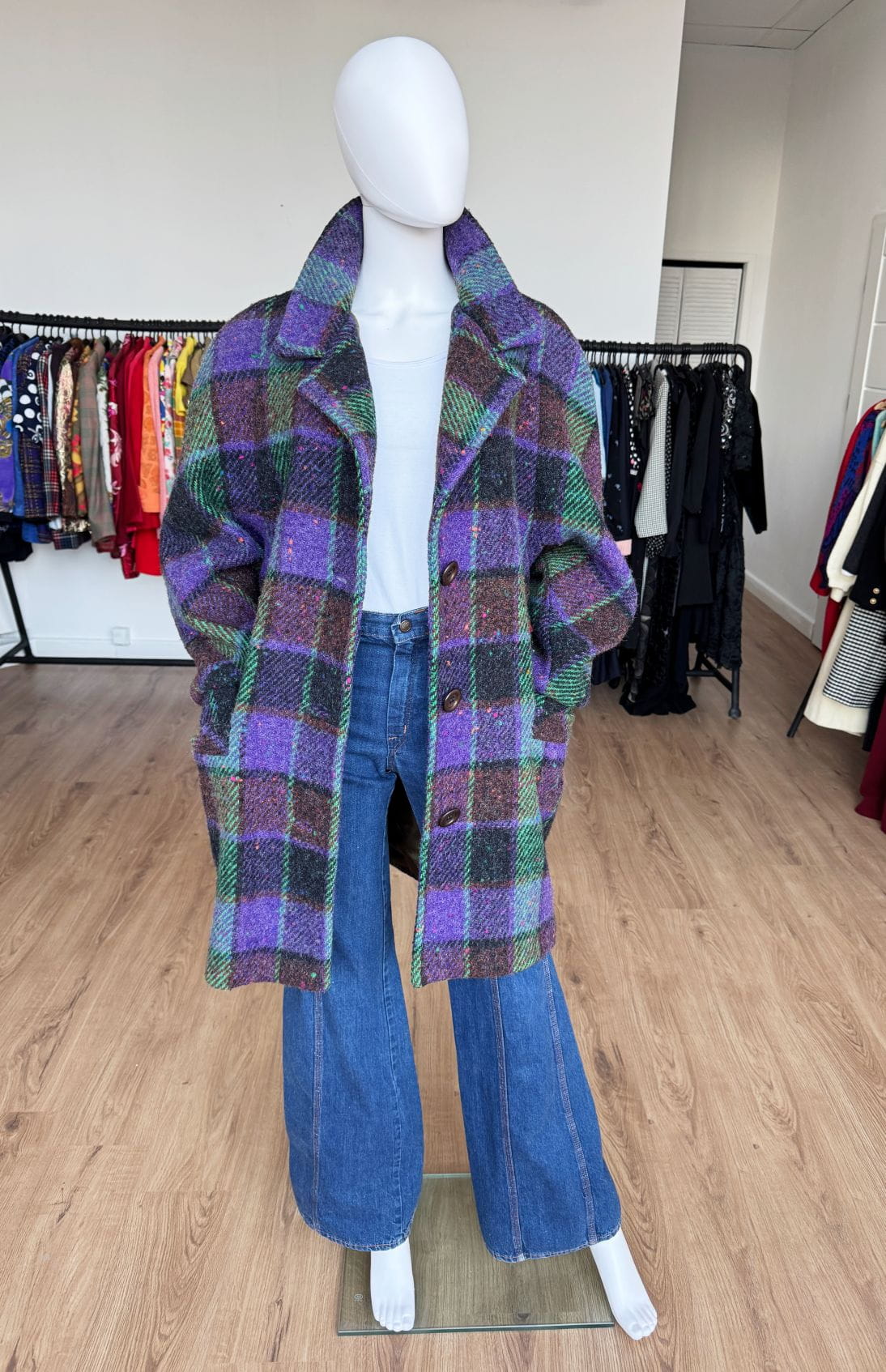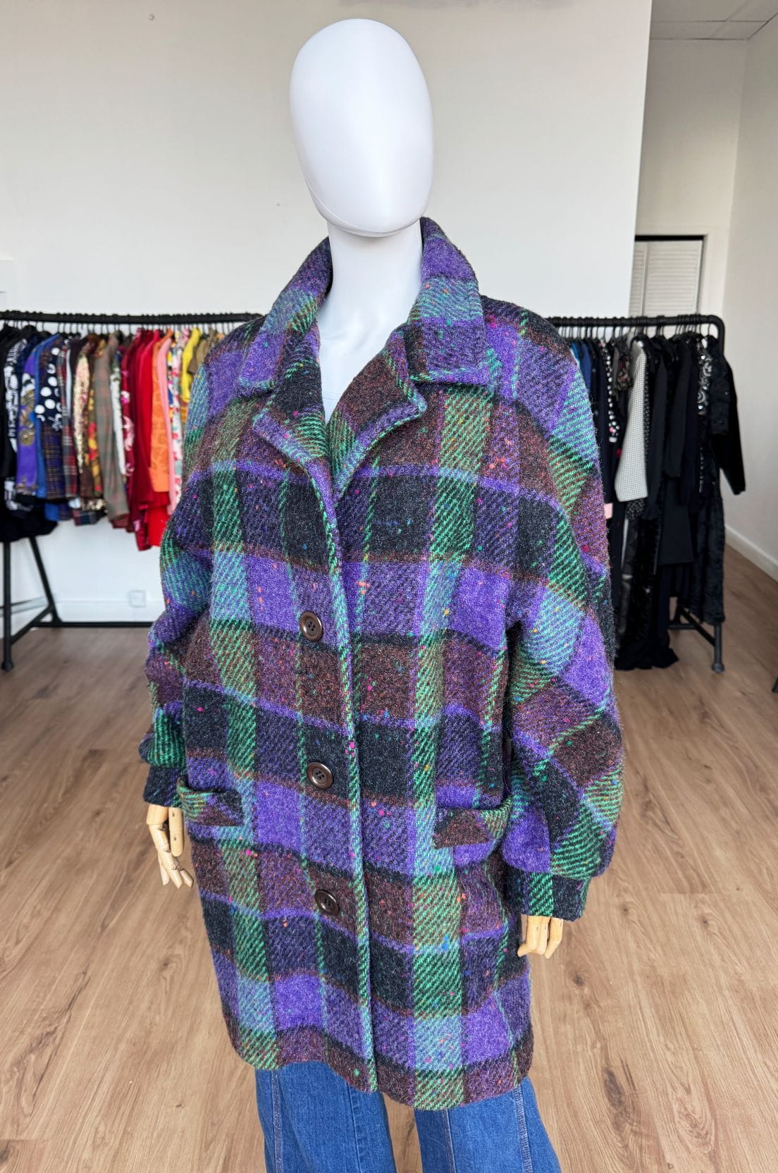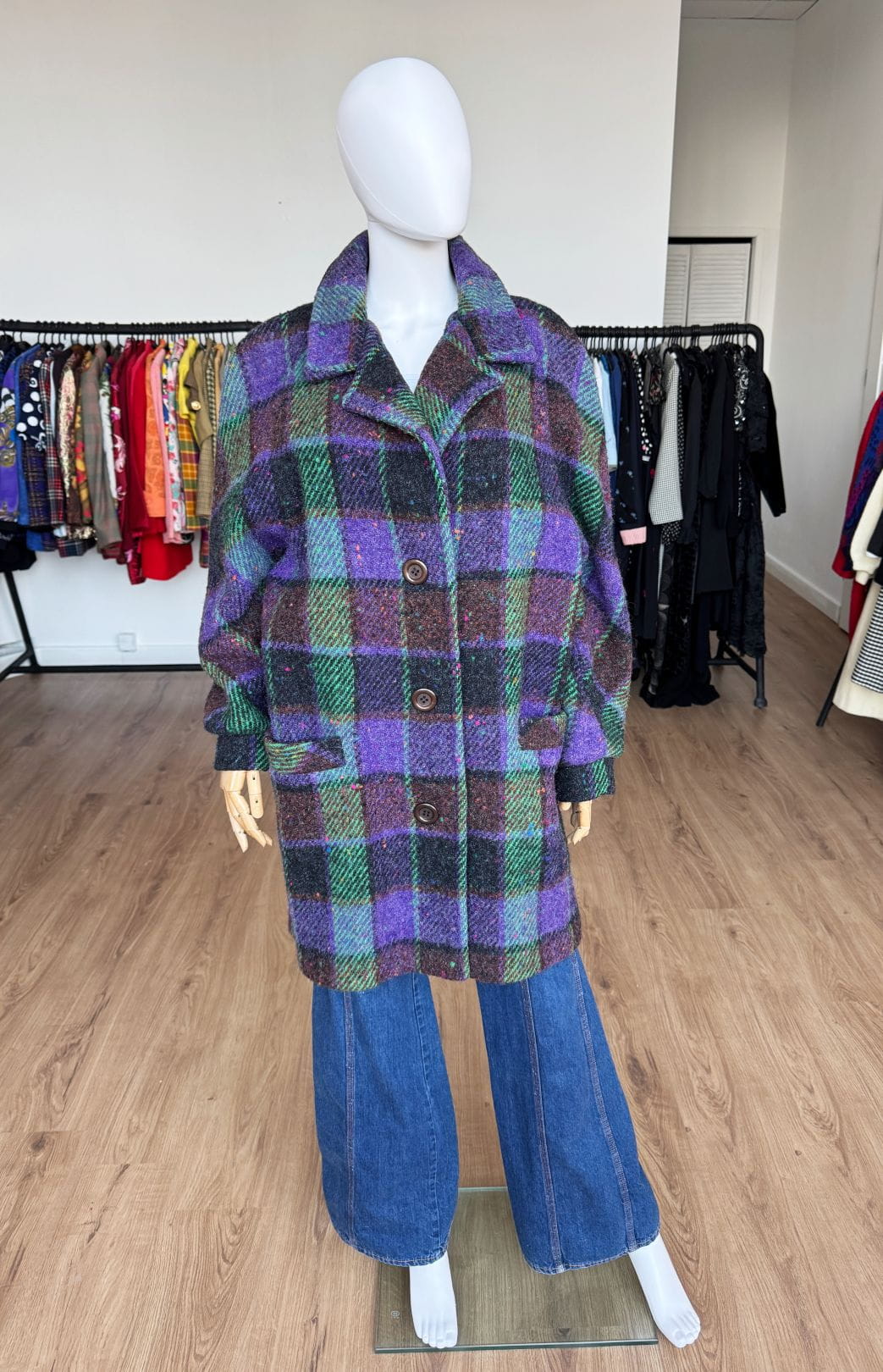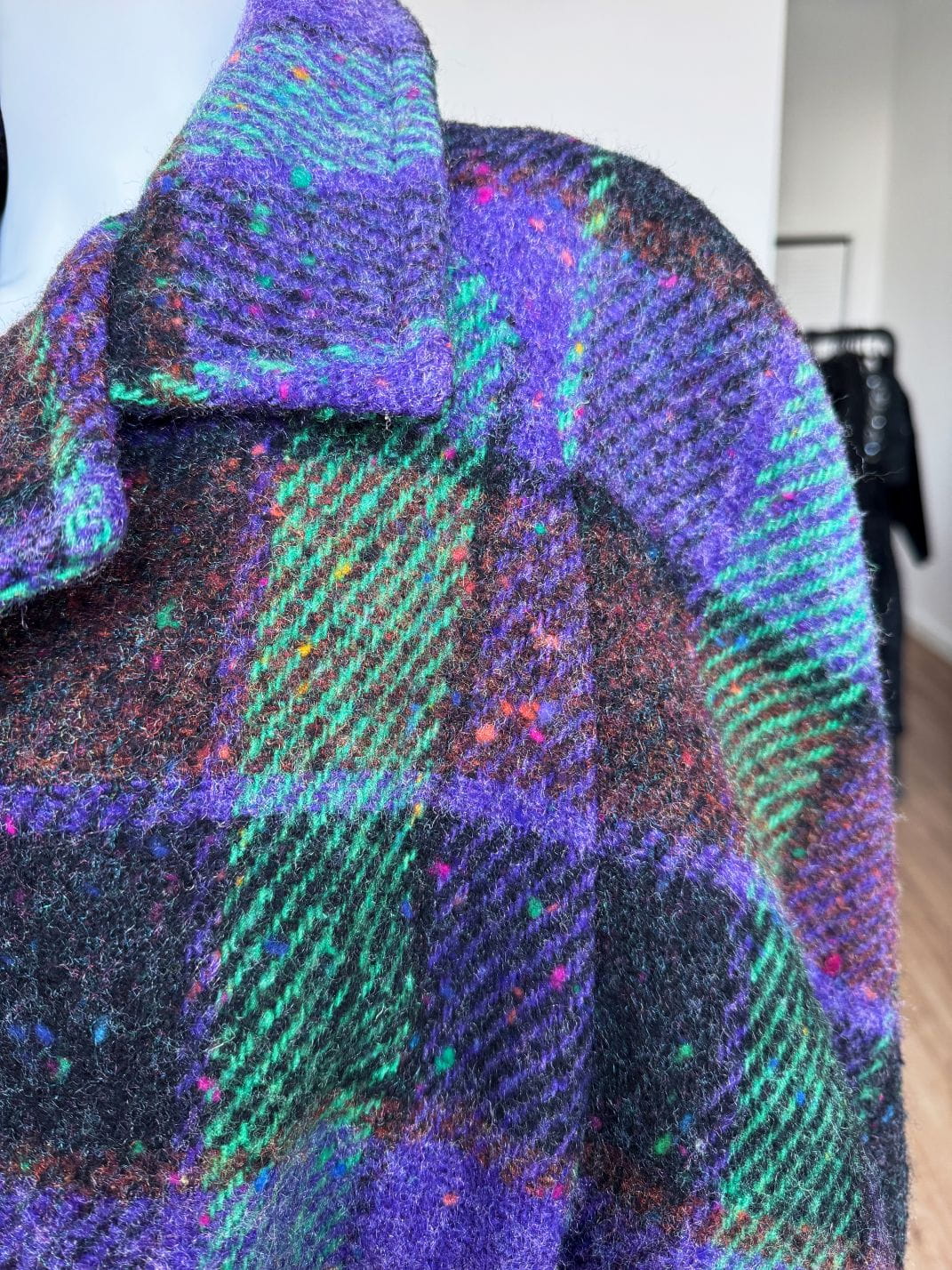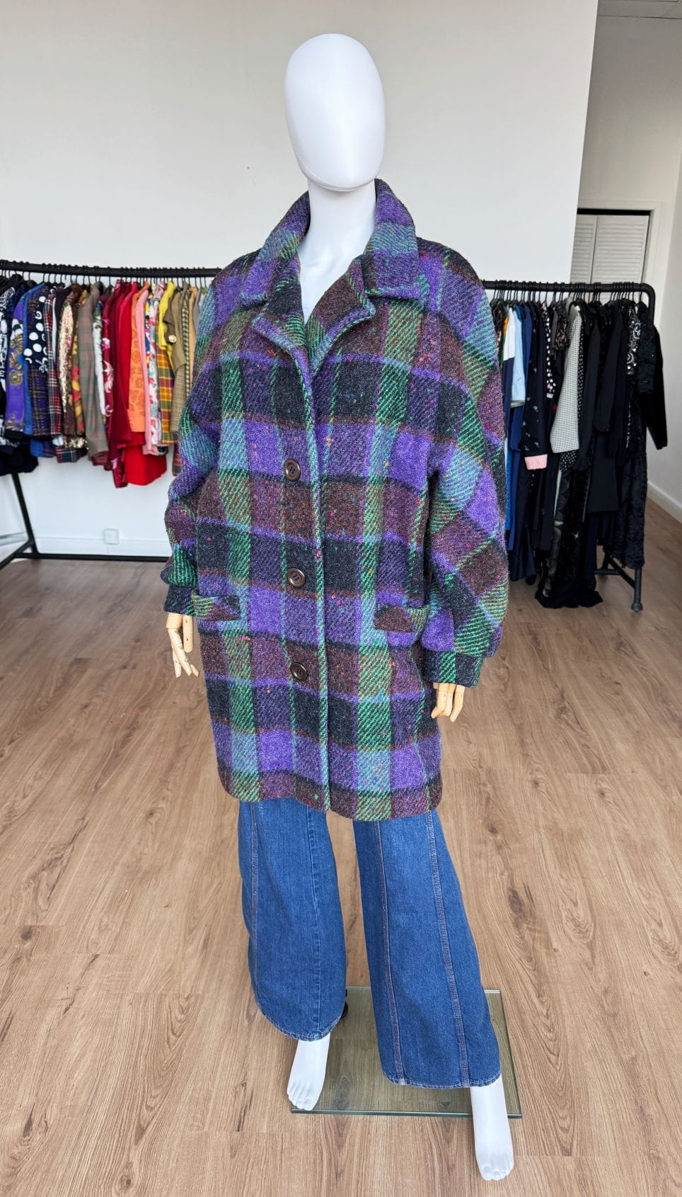 Płaszcz vintage produkcji włoskiej wykonany z wysokogatunkowej wełny o kraciastym deseniu z dominacją kolorów: fiolet, brąz, zieleń. Swobodny fason z rewersowym kołnierzem i długimi raglanowymi rękawami. Jednorzędowe zapięcie na duże guziki. W dolnej części kieszenie.