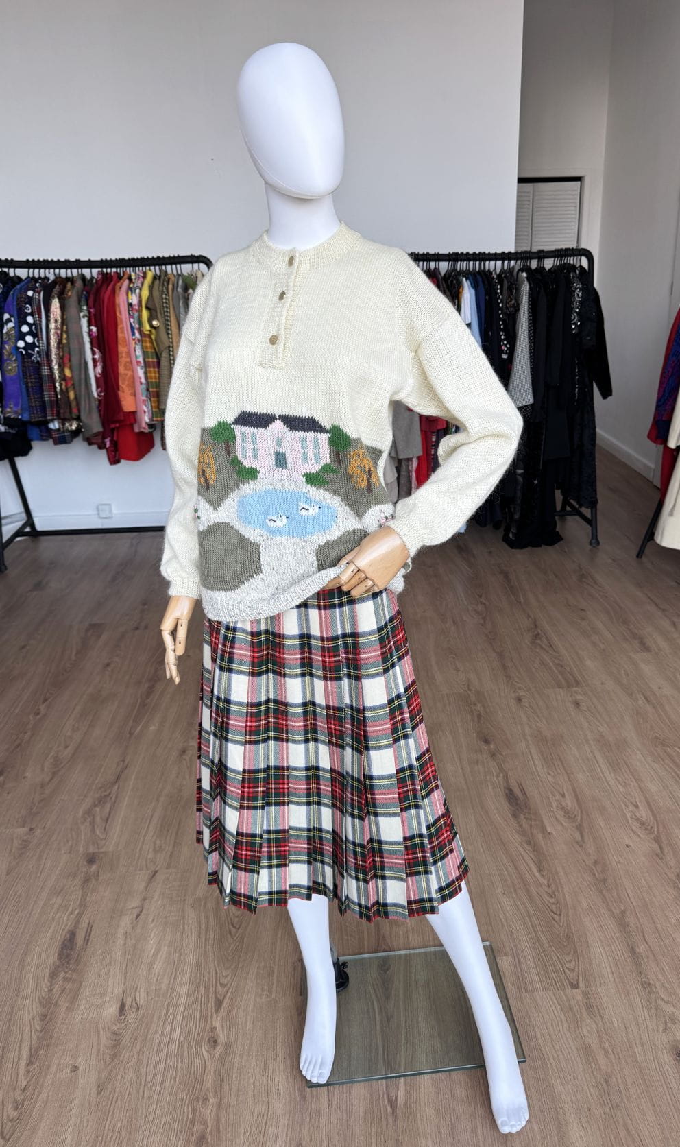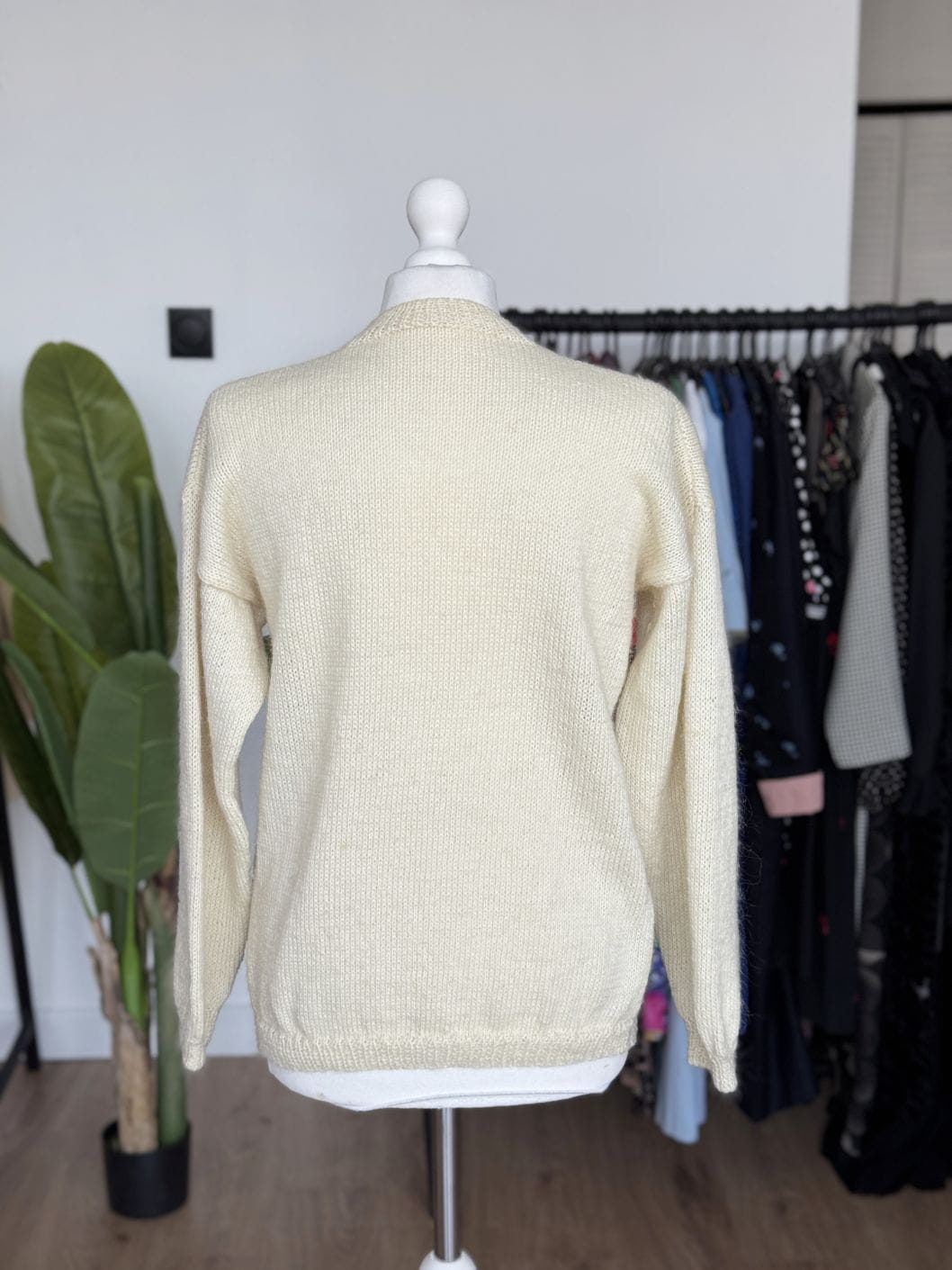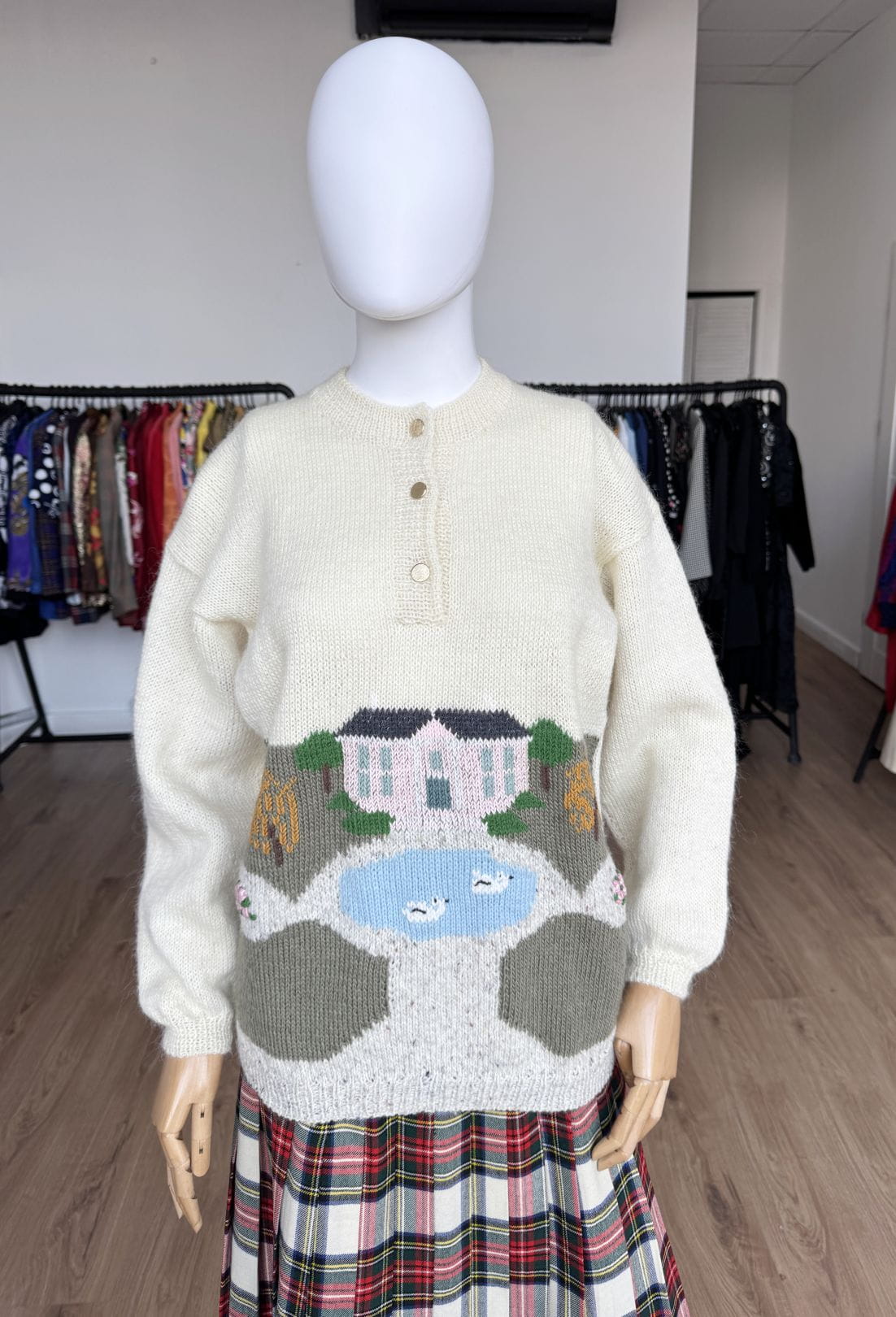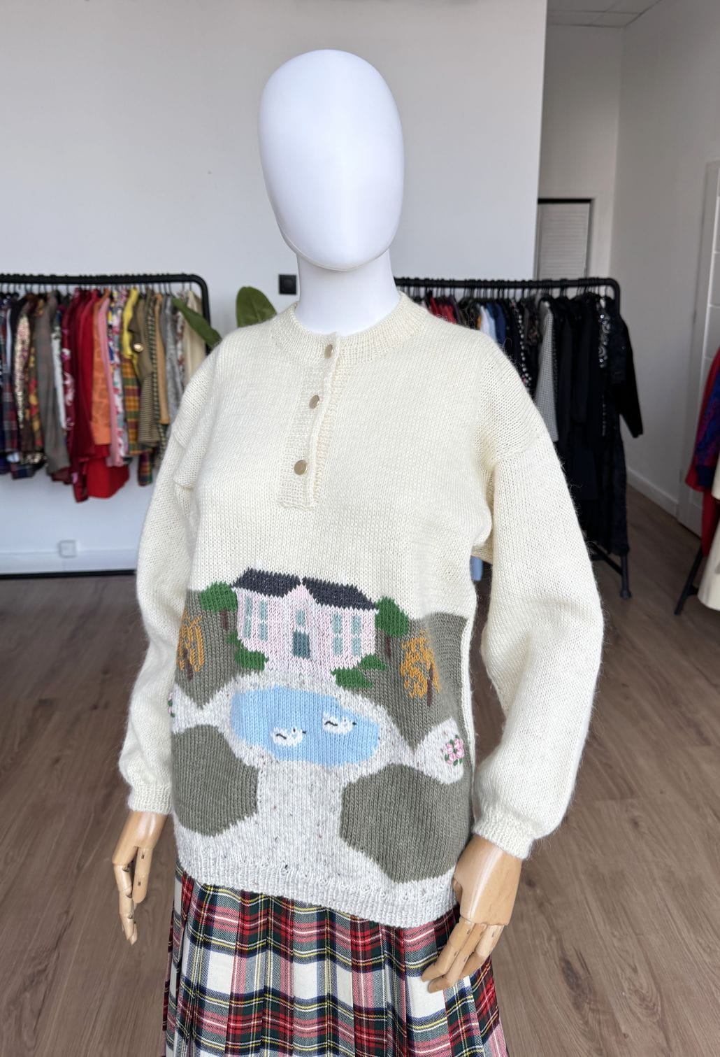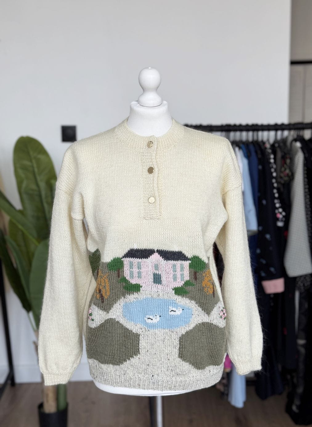 Ręcznie robiony, wełniany sweter vintage. Klasyczny, prosty fason, długie rękawy z obniżoną linią ramion. Góra rozpinana, z niedużą stójką. Od frontu we wzory: drzewa, domki, łabędzie w stawie.