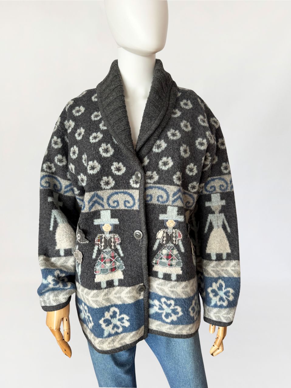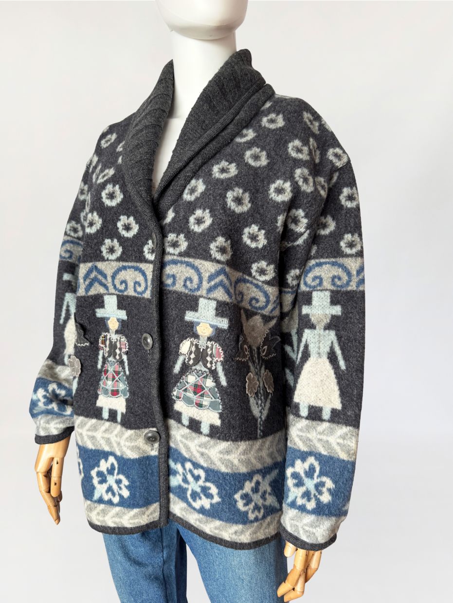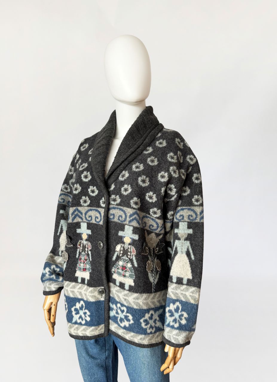 Włoski kardigan vintage z lat 90-tych wykonany z miękkiej, filcowanej wełny o strukturze przypominającej polar. Powierzchnia jest gęsta, lekko puszysta, o właściwościach termoizolacyjnych typowych dla wełen flokowanych. Model w odcieniach grafitu, z akcentami jasnej szarości i chłodnego błękitu, zdobiony wielopasmowym wzorem z motywami ludowymi, oraz ornamentami roślinnymi. W centralnej części postacie z naszywanymi ubraniami 3d. Swobodny dłuższy fason z długimi rękawami o obniżonych ramionach. Front zapinany na trzy guziki z matowego tworzywa. Kołnierz typu szalowego, modelowany z jednego szerokiego panelu.