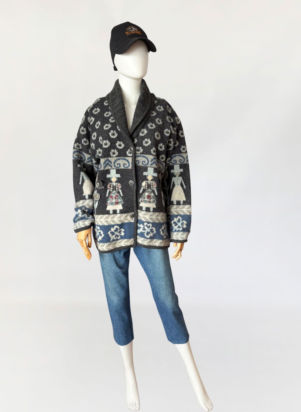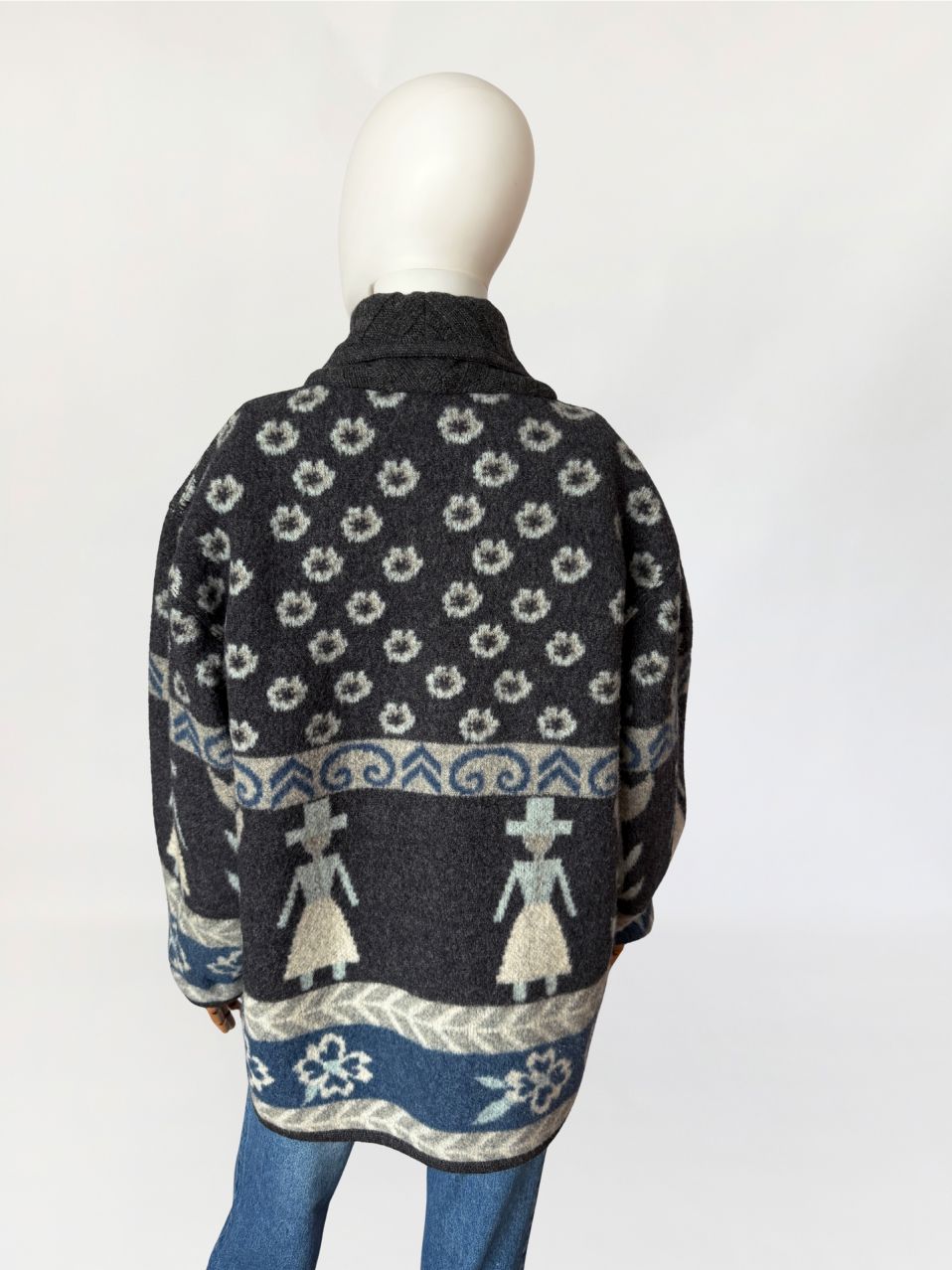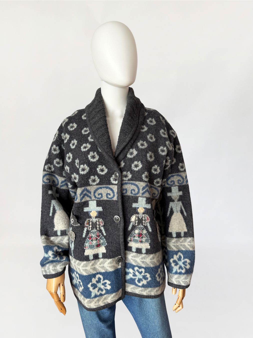 Włoski kardigan vintage z lat 90-tych wykonany z miękkiej, filcowanej wełny o strukturze przypominającej polar. Powierzchnia jest gęsta, lekko puszysta, o właściwościach termoizolacyjnych typowych dla wełen flokowanych. Model w odcieniach grafitu, z akcentami jasnej szarości i chłodnego błękitu, zdobiony wielopasmowym wzorem z motywami ludowymi, oraz ornamentami roślinnymi. W centralnej części postacie z naszywanymi ubraniami 3d. Swobodny dłuższy fason z długimi rękawami o obniżonych ramionach. Front zapinany na trzy guziki z matowego tworzywa. Kołnierz typu szalowego, modelowany z jednego szerokiego panelu.