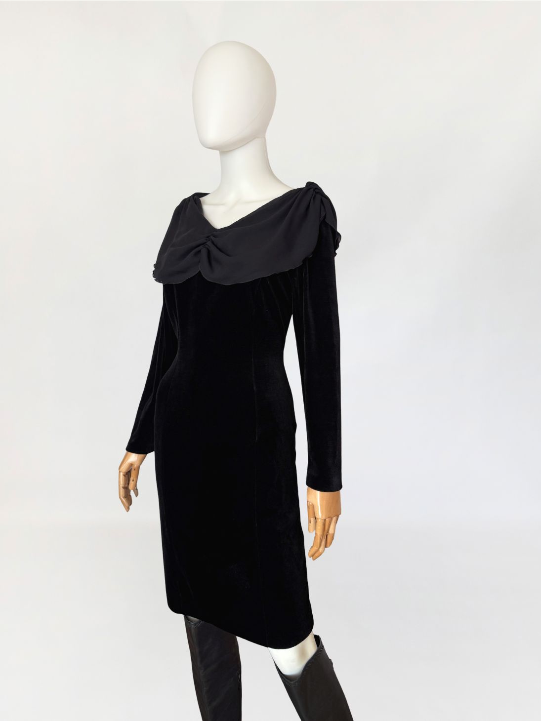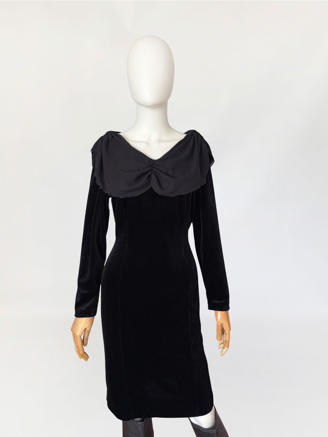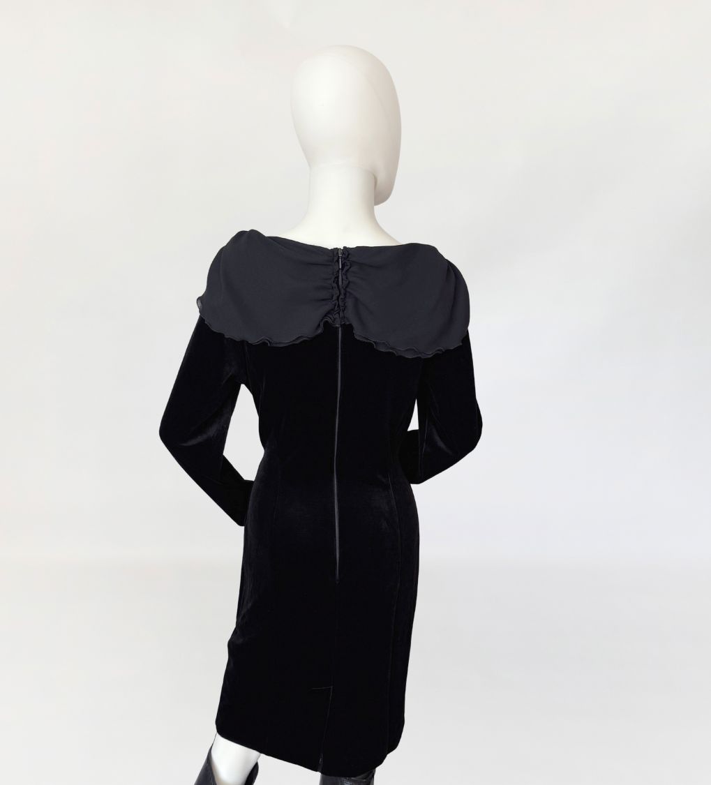 Sukienka vintage wykonana z czarnego weluru, o dopasowanej, klasycznej linii długości midi. Góra z szerokim, miękko układającym się szyfonowym kołnierzem obejmującym linię ramion i dekoltu, wykończonym subtelną falowaną krawędzią. Długie klasyczne rękawy. Z tyłu nieduży rozporek.