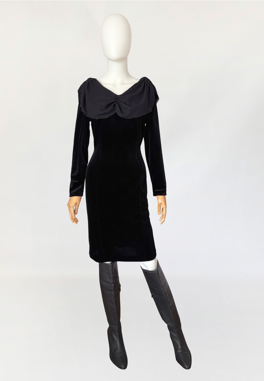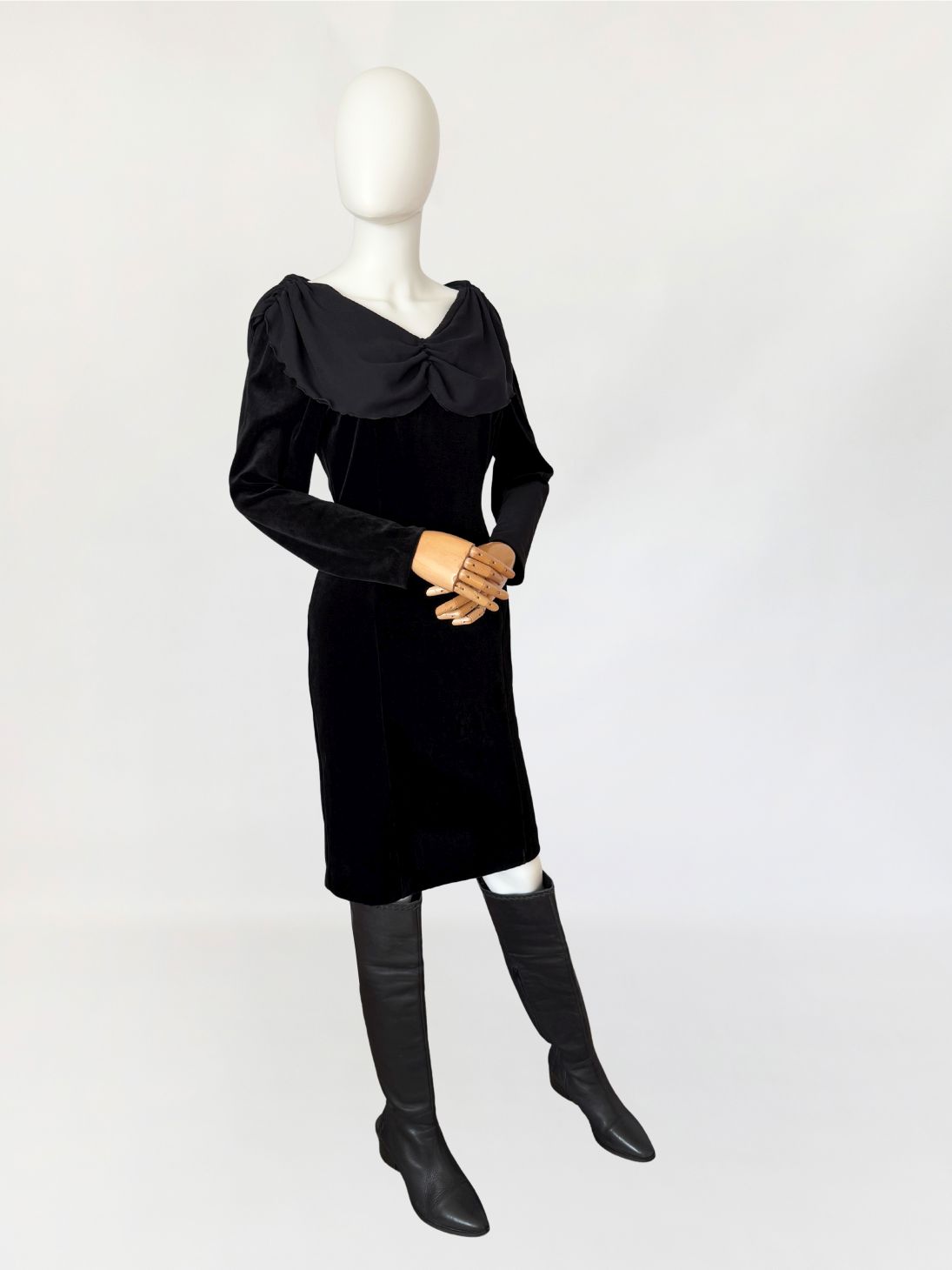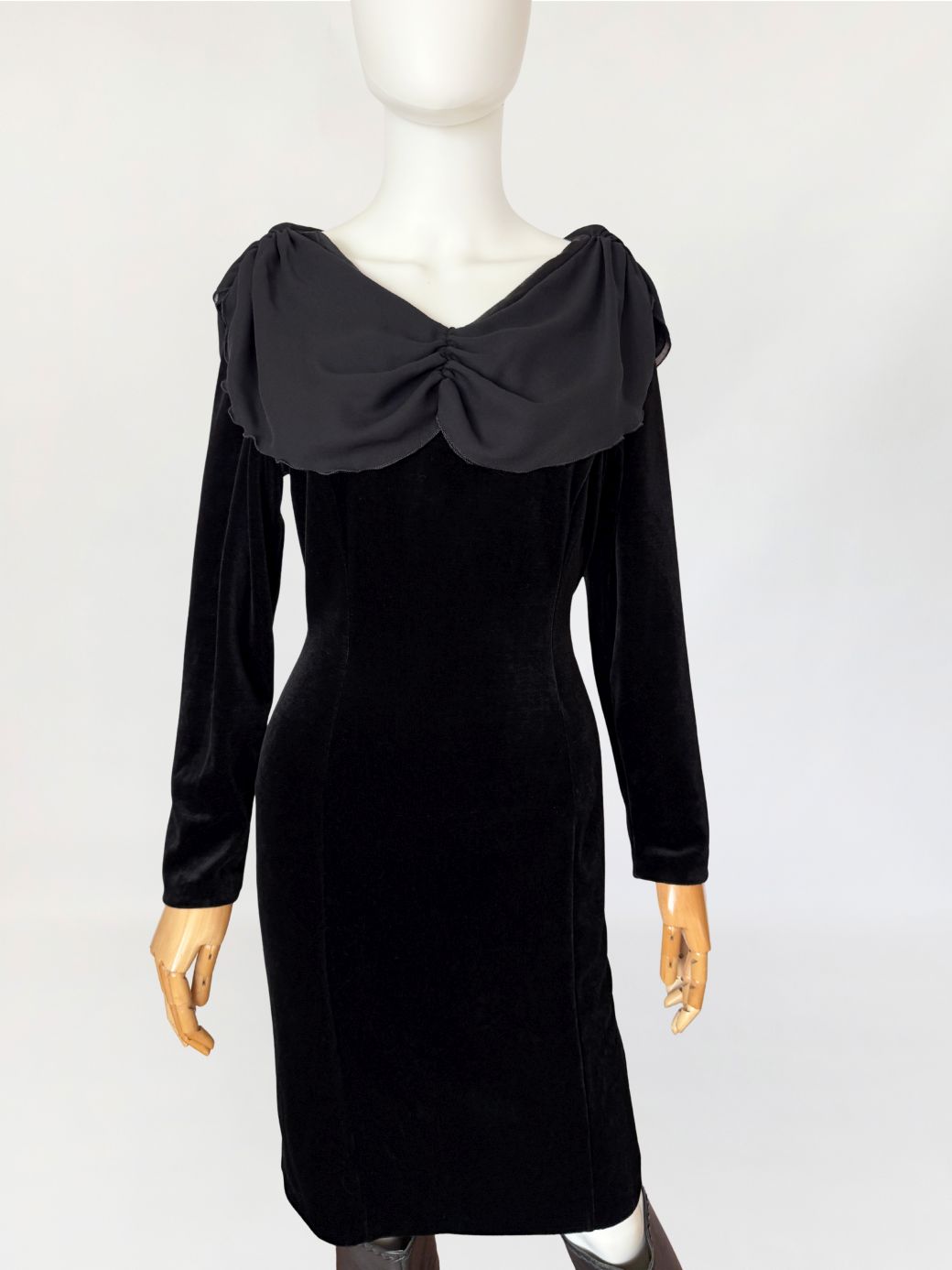 Sukienka vintage wykonana z czarnego weluru, o dopasowanej, klasycznej linii długości midi. Góra z szerokim, miękko układającym się szyfonowym kołnierzem obejmującym linię ramion i dekoltu, wykończonym subtelną falowaną krawędzią. Długie klasyczne rękawy. Z tyłu nieduży rozporek.