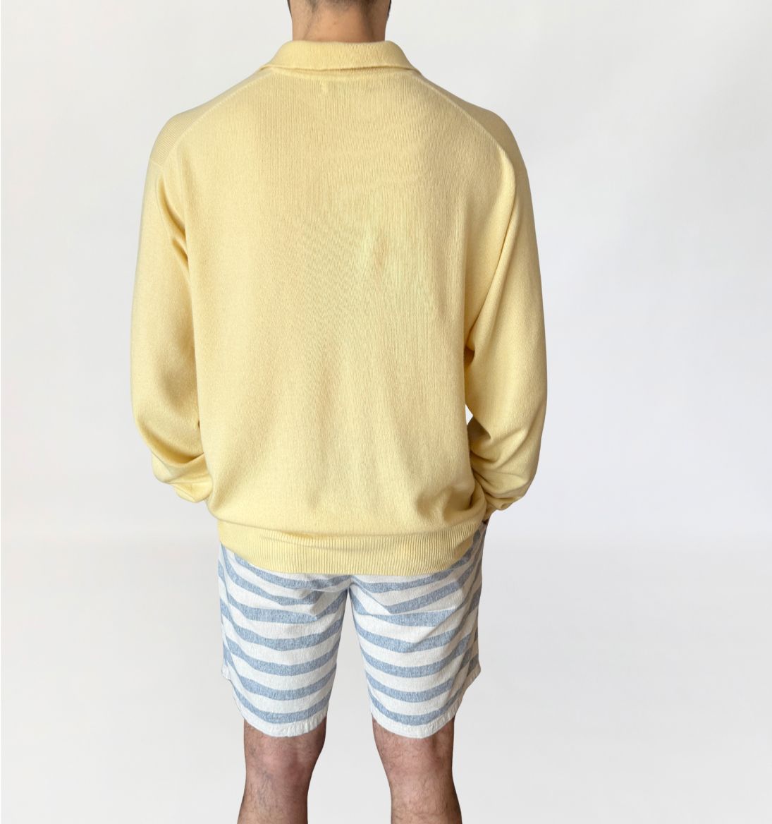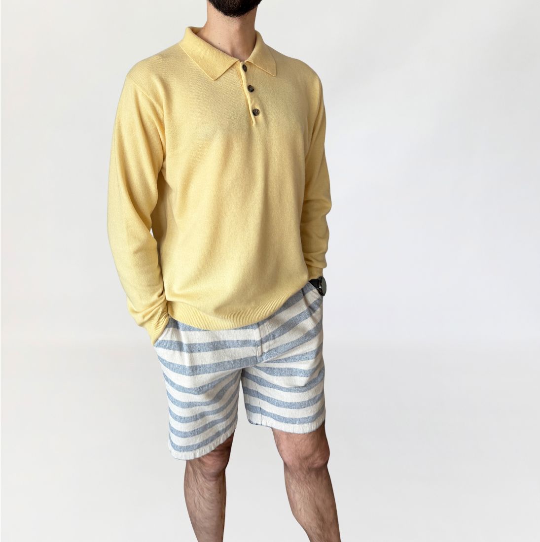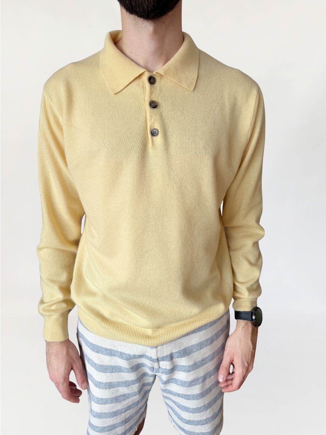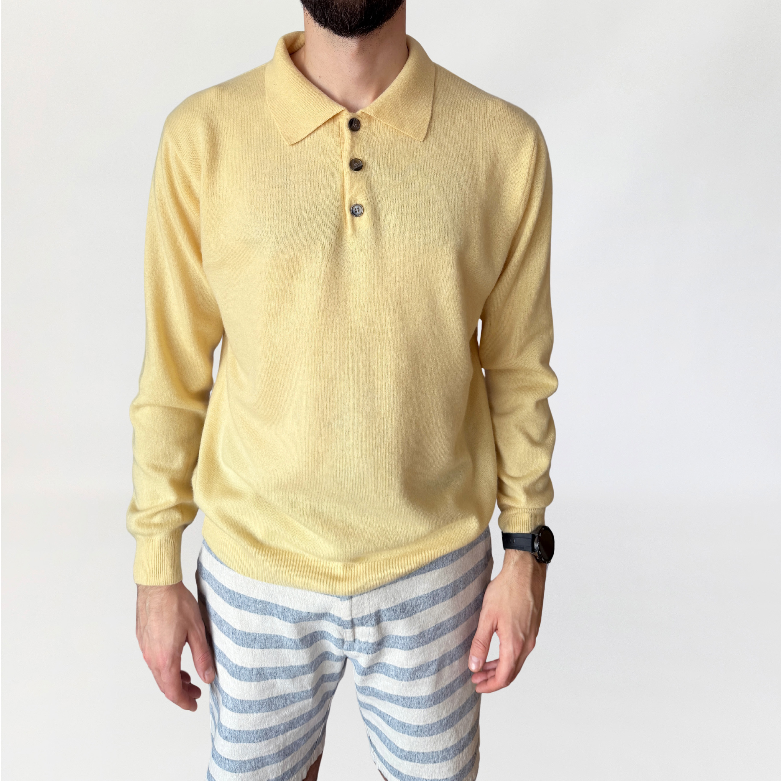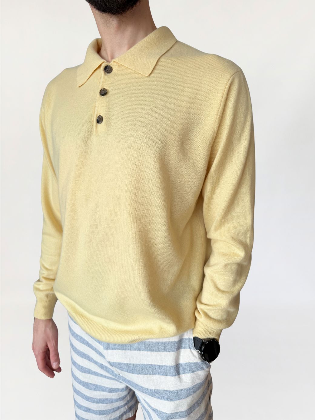 Sweter wykonany w 100% z kaszmiru w jasnym, pastelowym odcieniu żółci. Dzianina gładka, o jednolitej strukturze. Fason swobodny, z lekko obniżoną linią ramion, rękawy długie, zakończone ściągaczami. Dekolt typu polo z kołnierzem oraz krótkim zapięciem na trzy guziki. Dół wykończony szerokim ściągaczem, tył gładki.