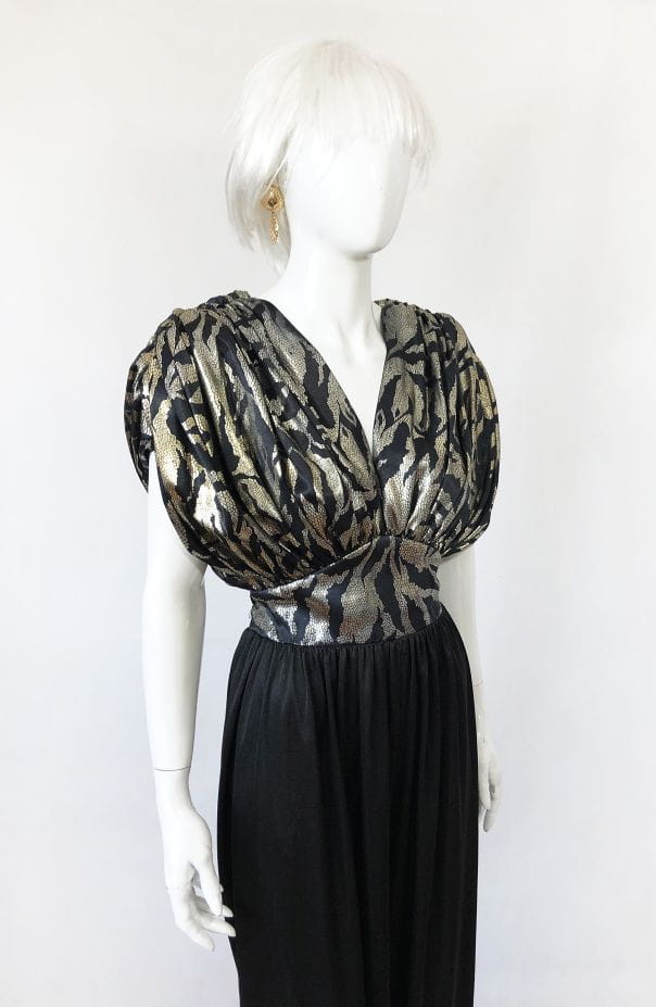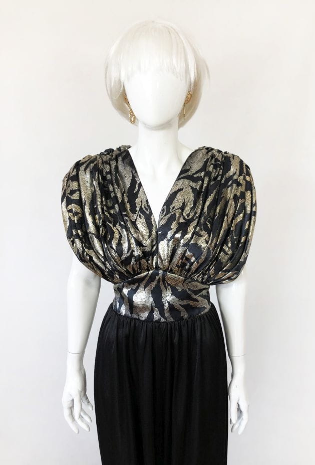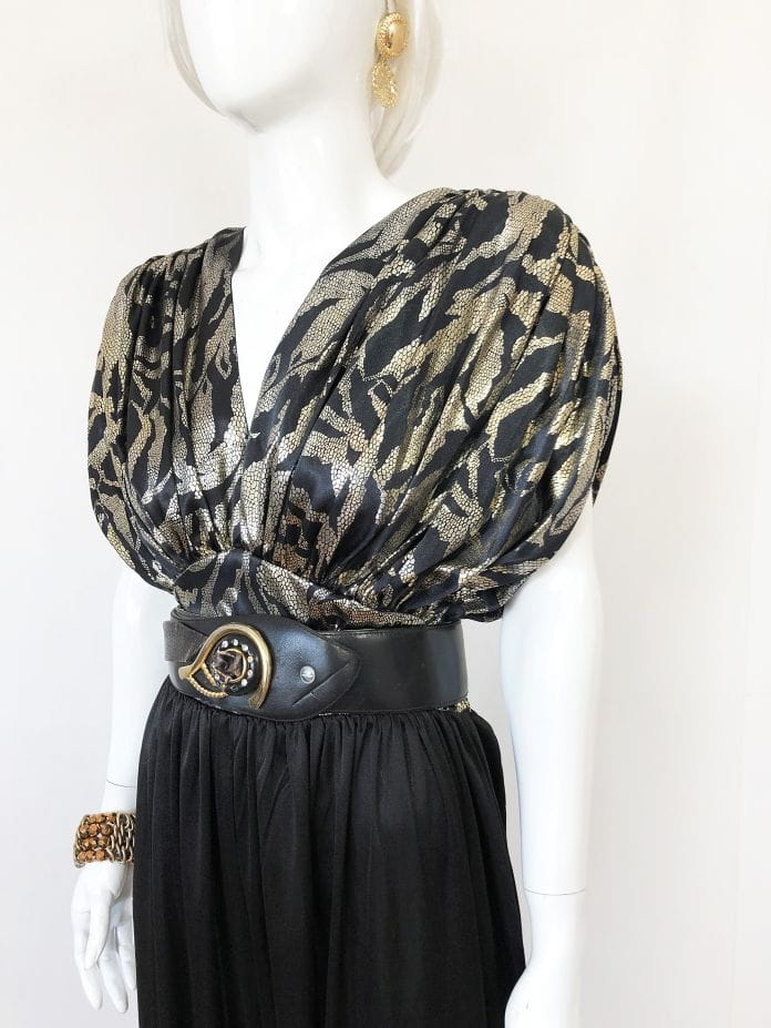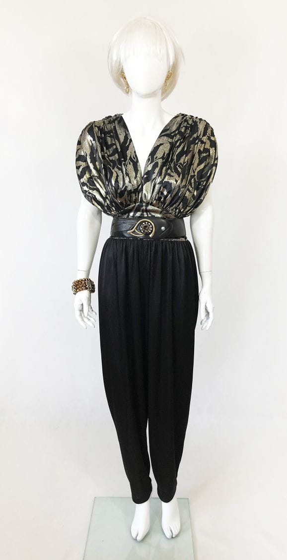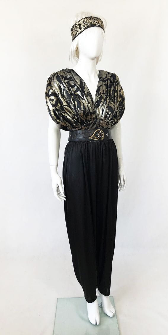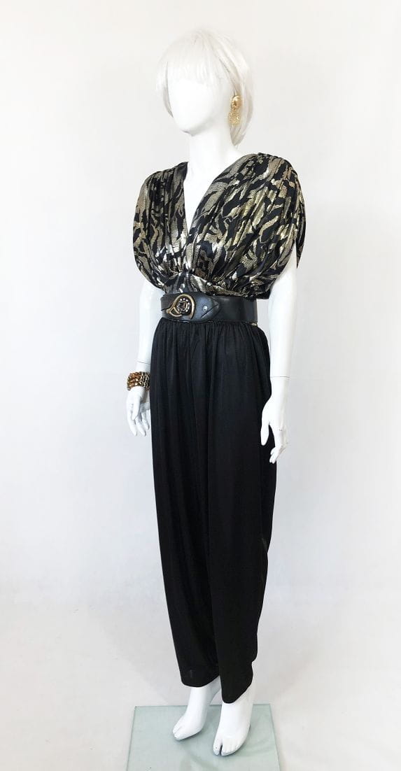 Wieczorowy kombinezon vintage. Góra mocno drapowana, luźniejsza. Połyskujące złote wzory. Dopasowany na wysokości talii. Dół a'la baggy, luźny , gładki. Pasek nie jest elementem sprzedaży.