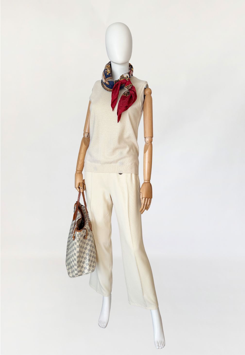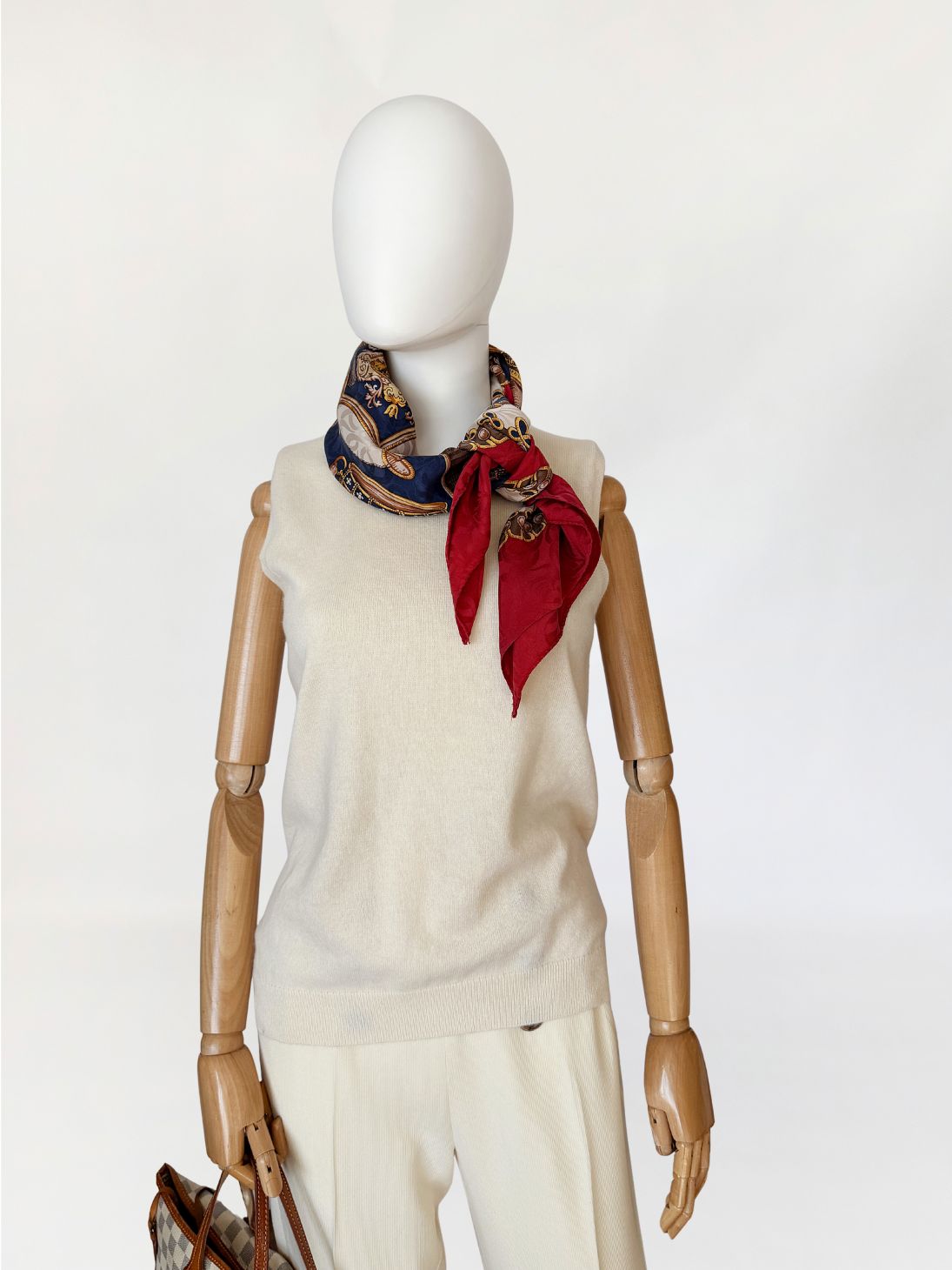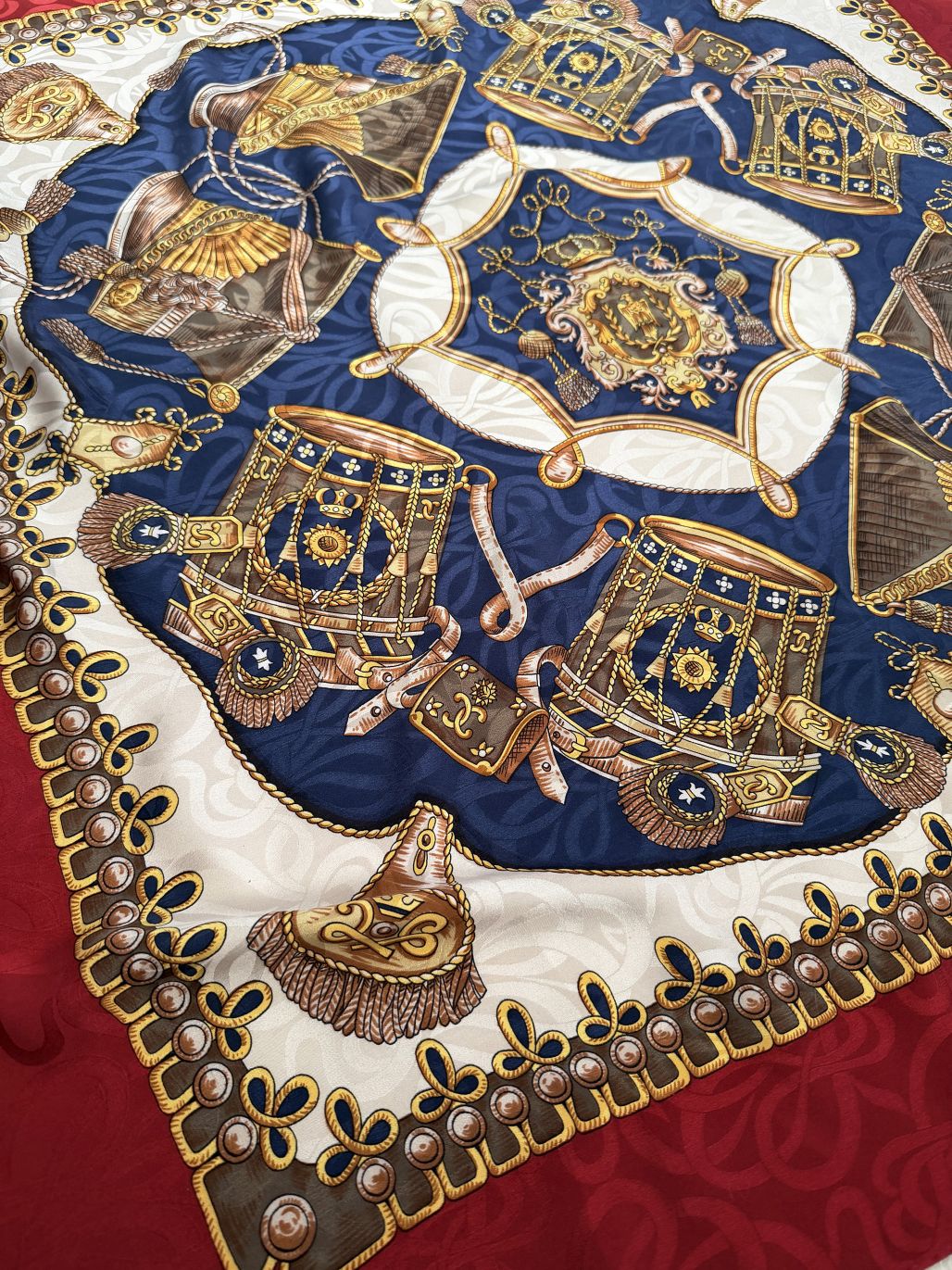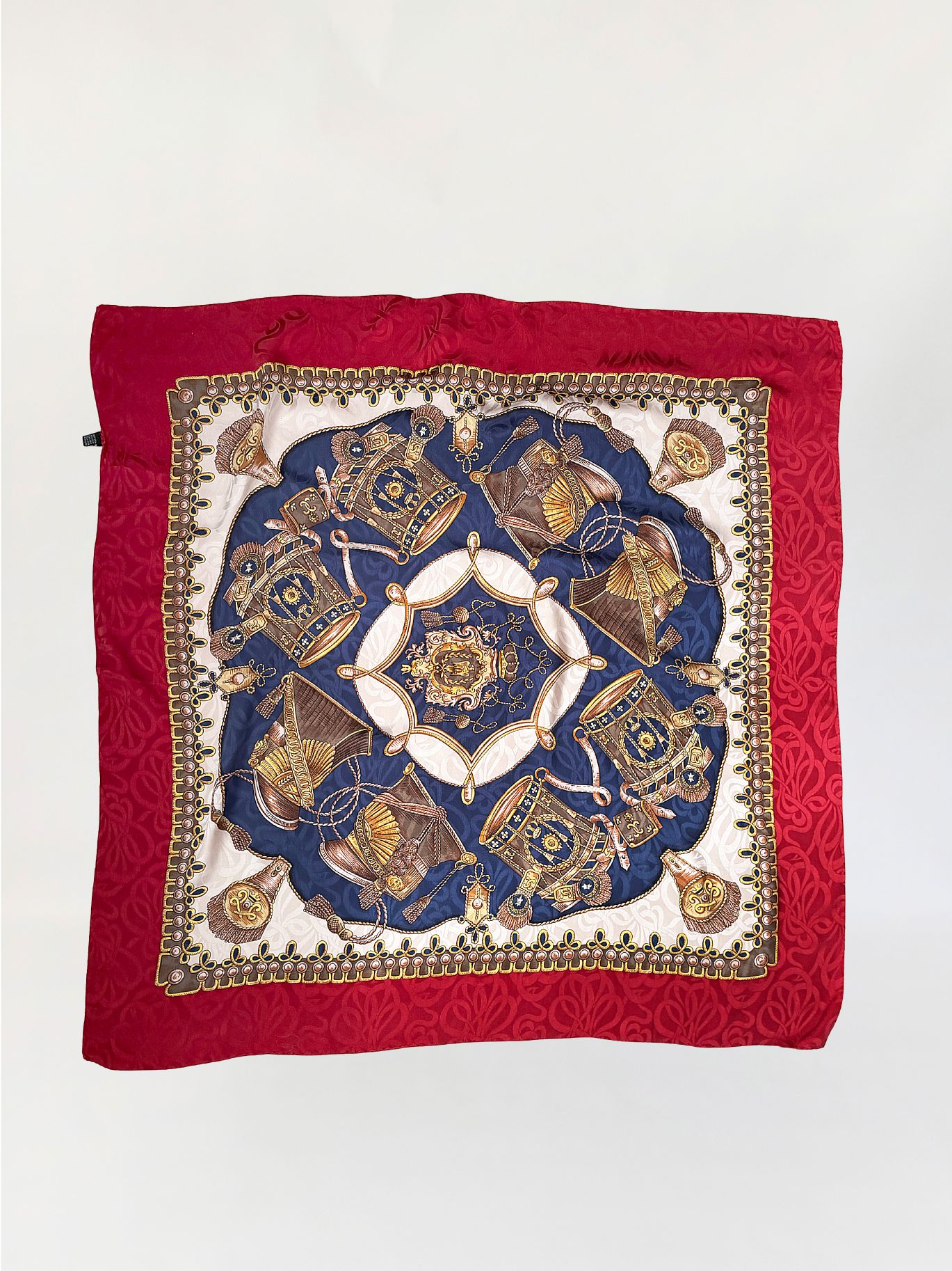 Włoska apaszka vintage wykonana z jedwabiu. Kompozycja centralna w odcieniach granatu i złota, z motywem dekoracyjnych elementów inspirowanych formami biżuteryjnymi i ornamentalnymi, ujęta w symetryczny układ. Tło centralne przełamane jasnym polem z bordiurą. Szeroka rama w intensywnym odcieniu czerwieni, z subtelnym, tonalnym wzorem ornamentalnym. Krawędzie wykończone wąskim obrębem. Ręcznie rolowana i podszywana