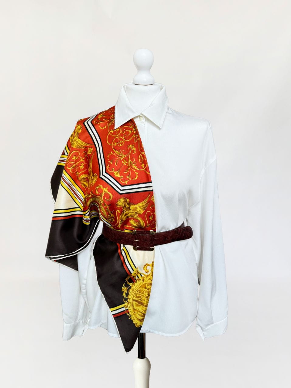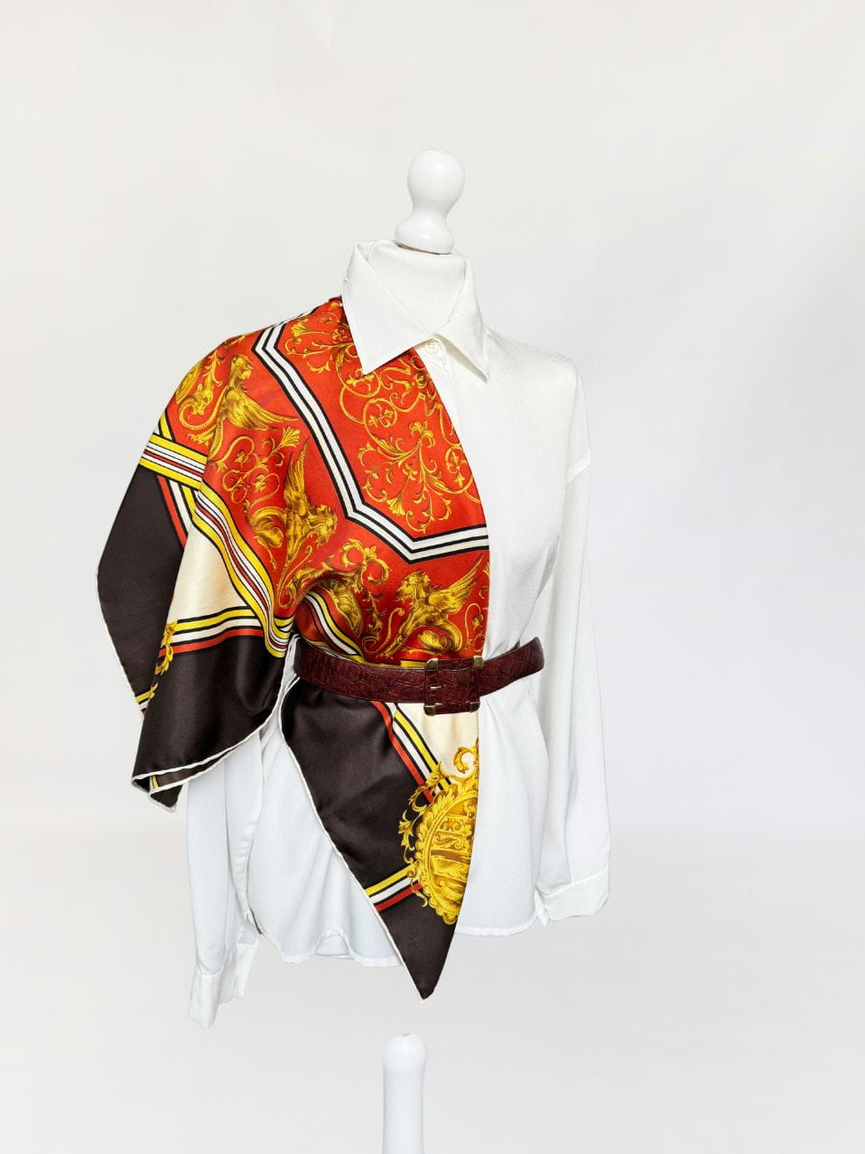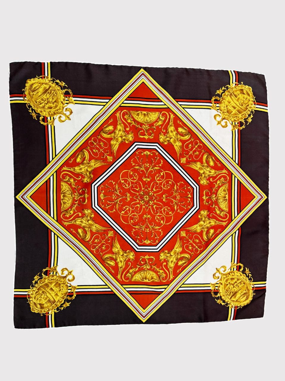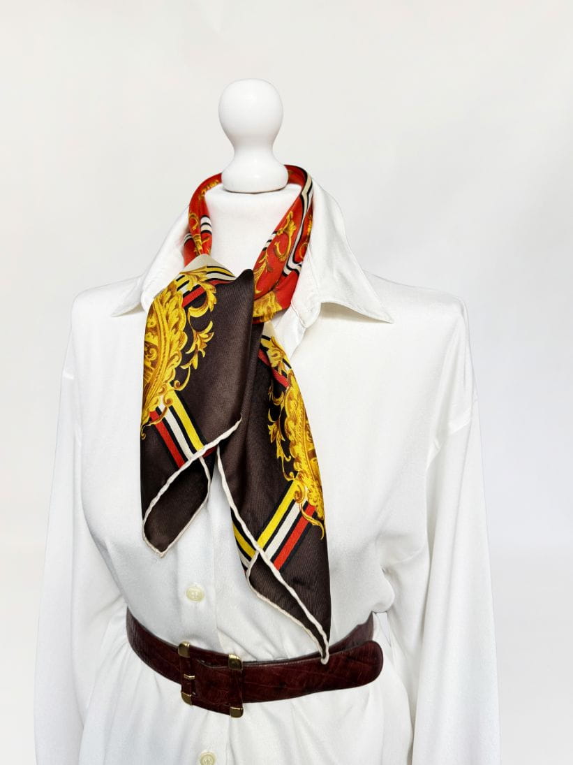 Włoska apaszka wykonana z jedwabnej tkaniny w barokowe wzory w mocnej, nasyconej kolorystyce