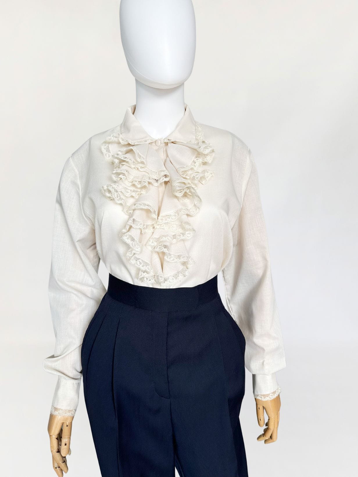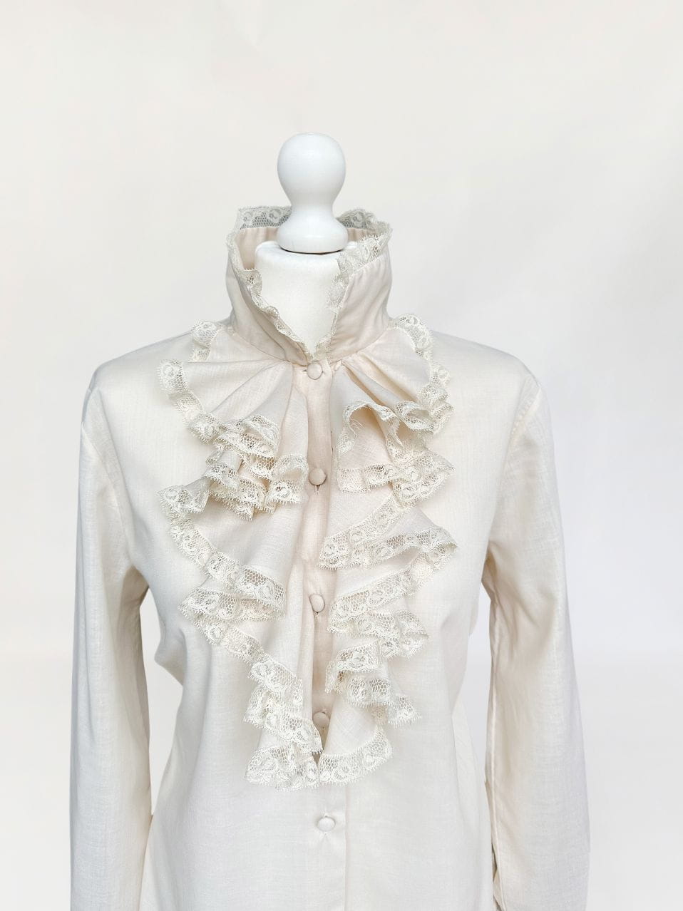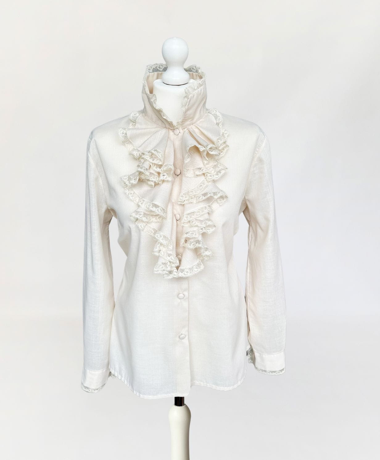 Włoska koszula true vintage lata 70-te/80-te, w kolorze piaskowym/jasny surowy beż. Model w stylu wiktoriańskim, z okazałym falbaniastym żabotem wykończonym koronkową lamówką. Prosty fason z długimi rękawami. Mankiety dopasowane, przepinane - również wykończone drobną koronką. Zapinana na oblekane guziki, dwa zapasowe w komplecie. Pochodzi z Rzymu.