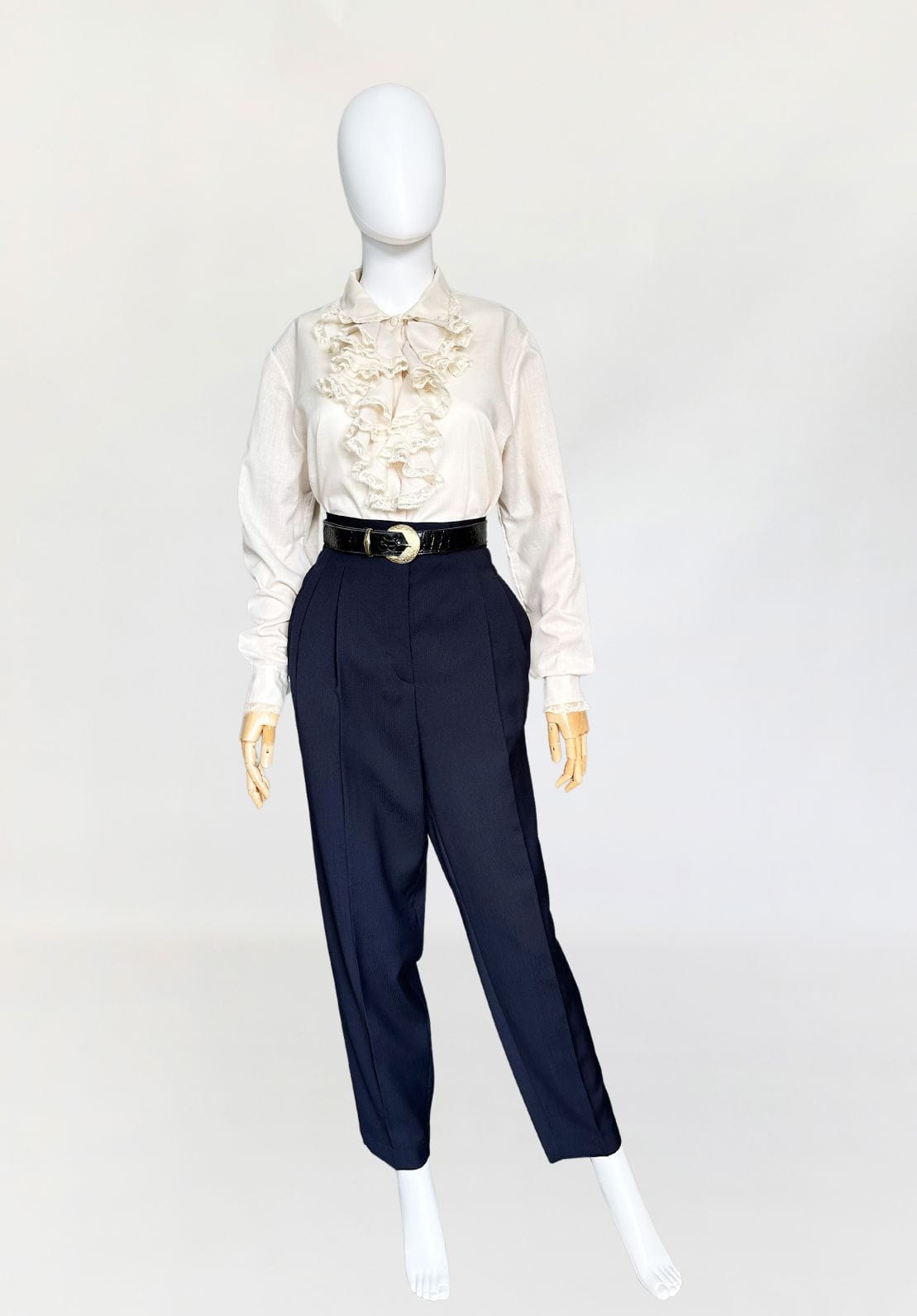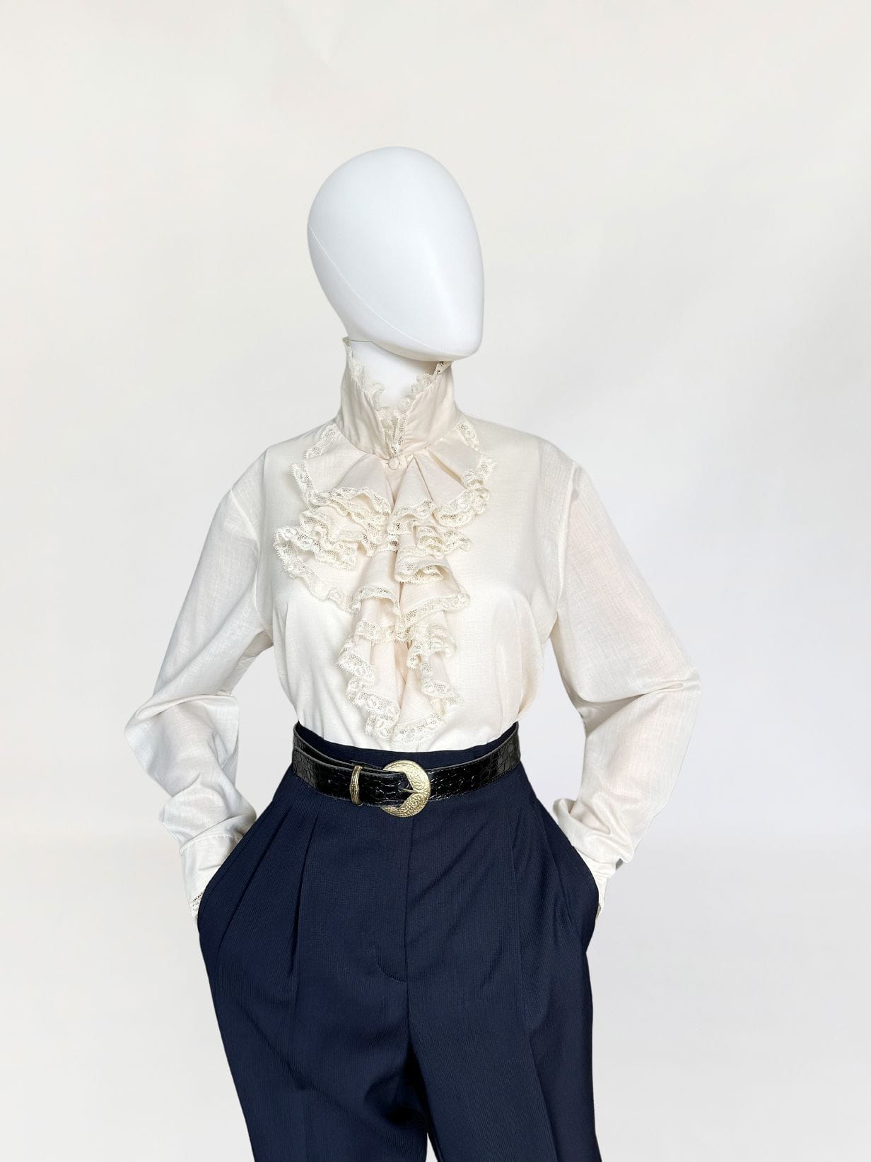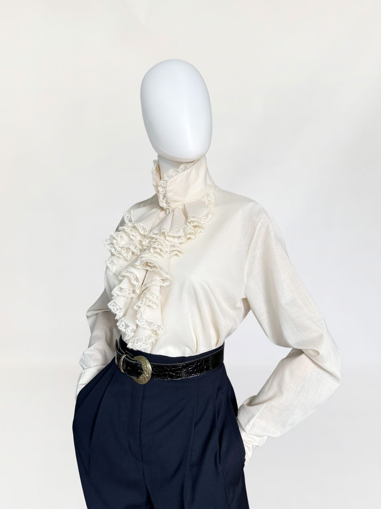 Włoska koszula true vintage lata 70-te/80-te, w kolorze piaskowym/jasny surowy beż. Model w stylu wiktoriańskim, z okazałym falbaniastym żabotem wykończonym koronkową lamówką. Prosty fason z długimi rękawami. Mankiety dopasowane, przepinane - również wykończone drobną koronką. Zapinana na oblekane guziki, dwa zapasowe w komplecie. Pochodzi z Rzymu.
