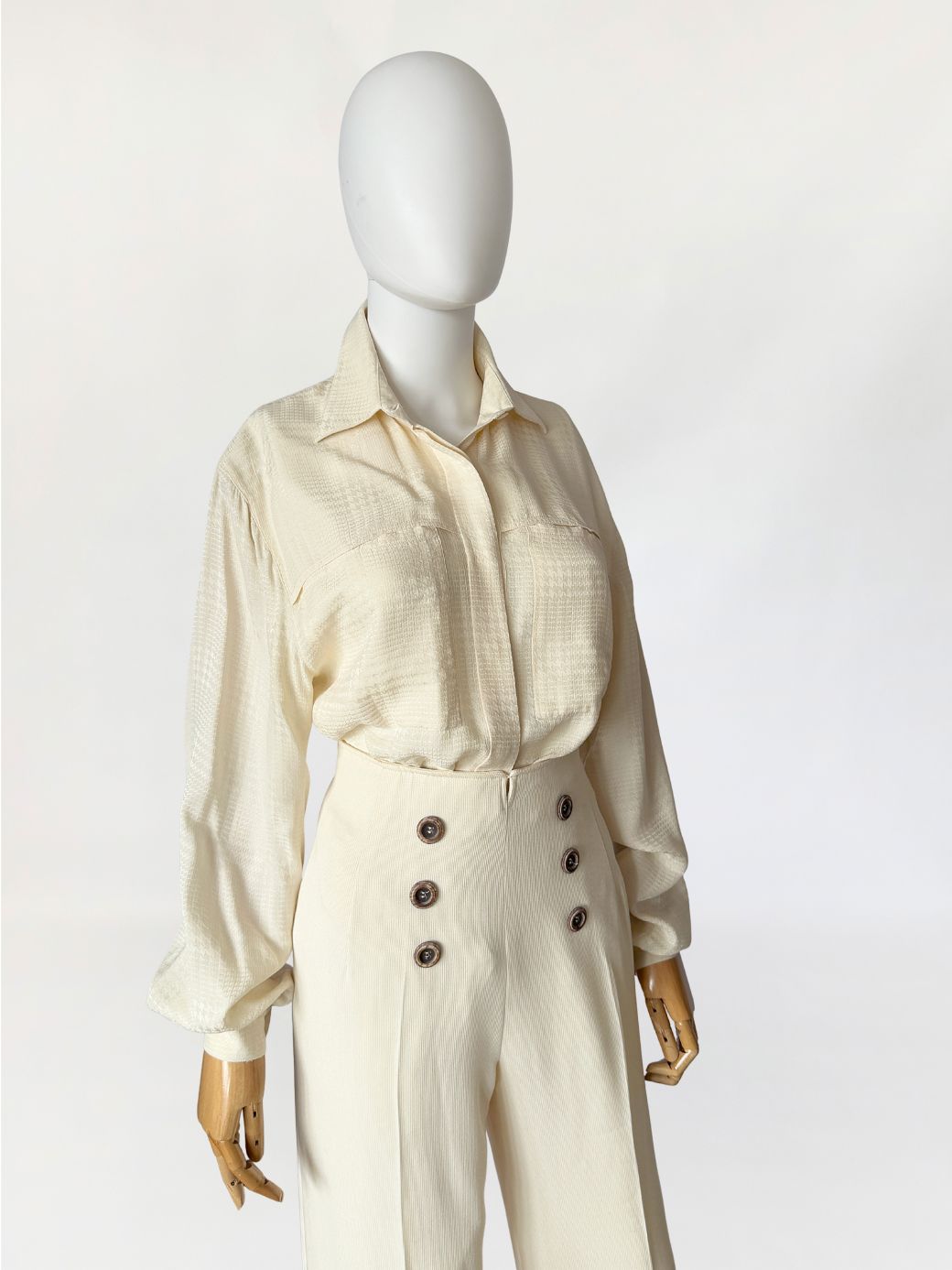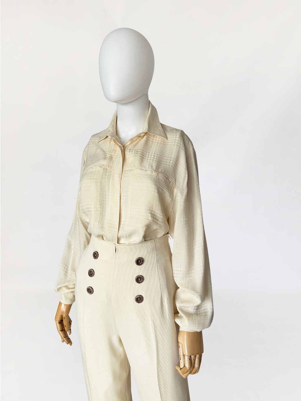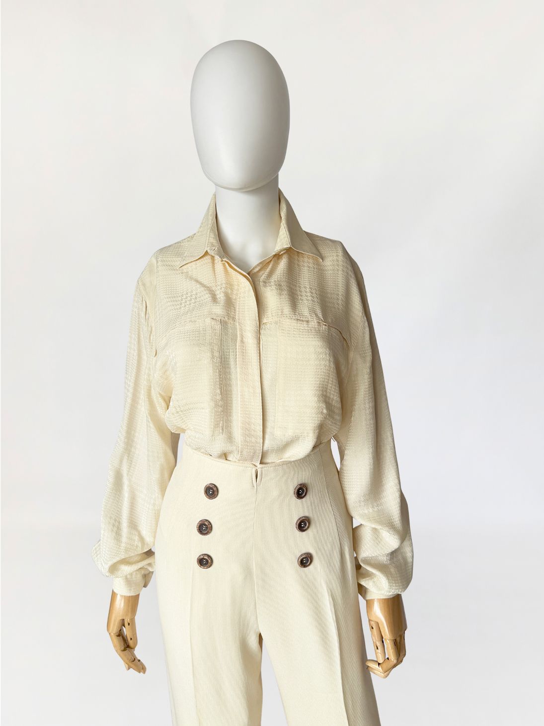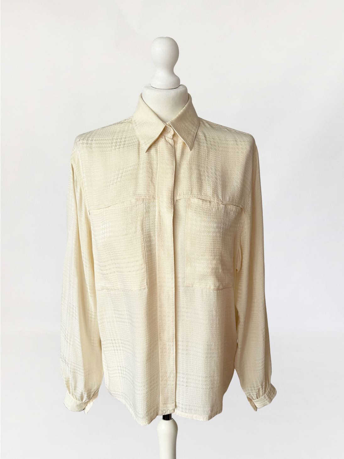 Włoska koszula vintage wykonana z naturalnego jedwabiu w jasnym, kremowym odcieniu. Tkanina o strukturalnej powierzchni z bardzo subtelnym, wypukłym rysunkiem nawiązującym do drobnej pepitki. Swobodny fason z długimi luźnymi rękawami zakończonymi przepinanymi mankietami. Przód z naszytymi dużymi kieszeniami zintegrowanymi z linią karczku. Kołnierz klasyczny, z wyraźnie zaznaczonymi wyłogami. Zapięcie na rząd guzików ukrytych pod listwą. Tył z karczkiem oraz kontrafałdą pośrodku