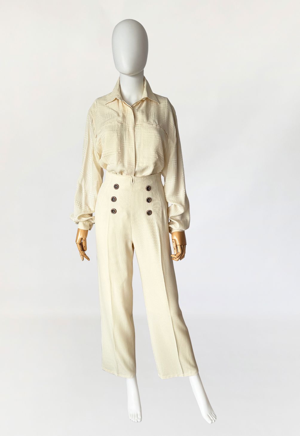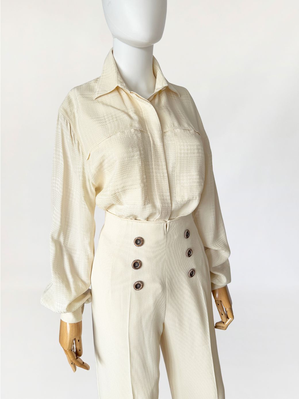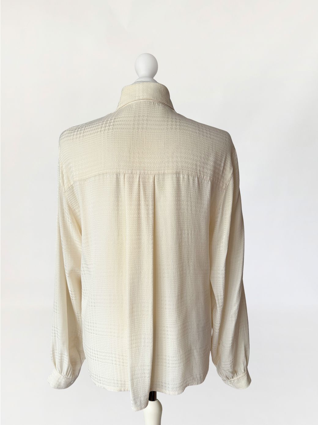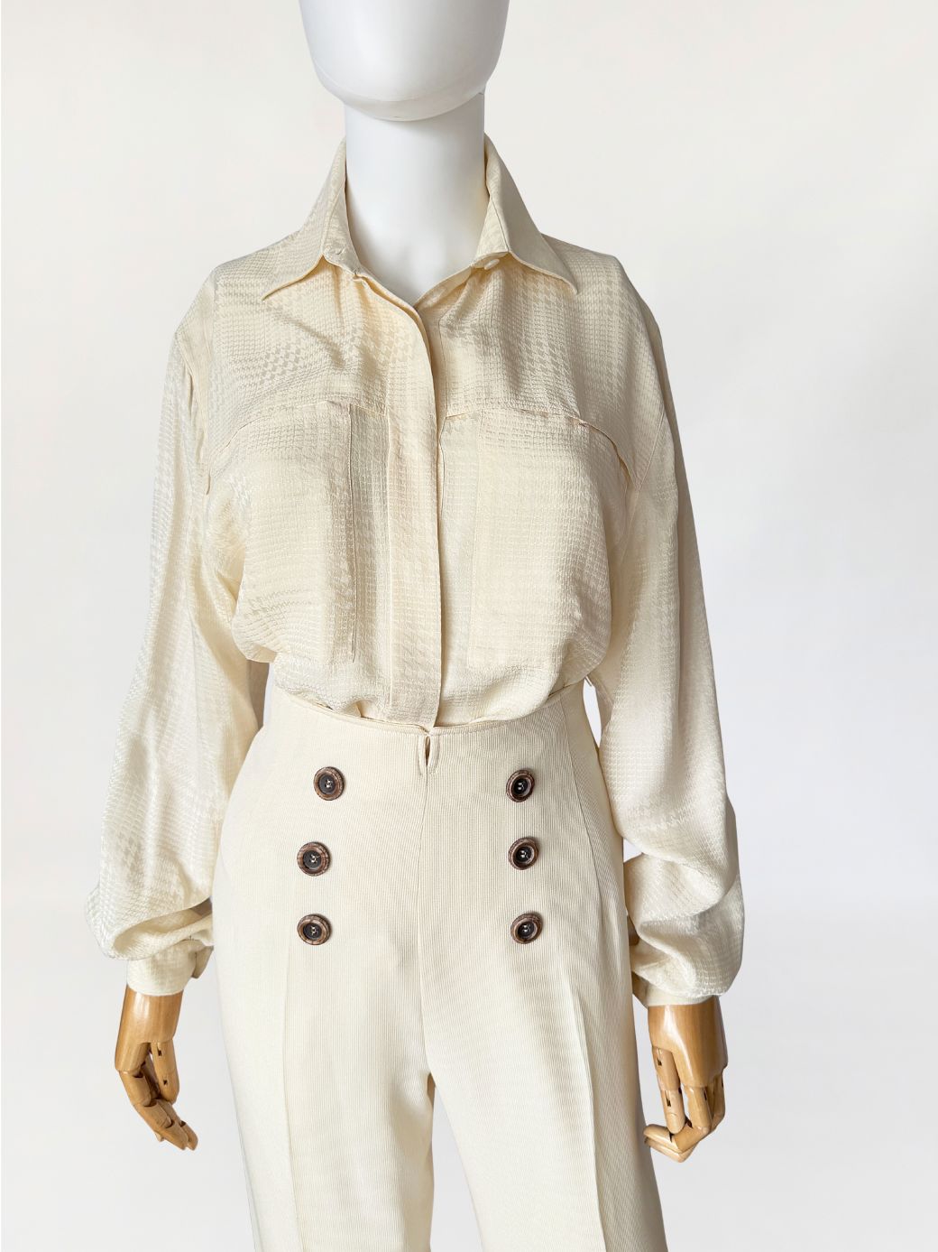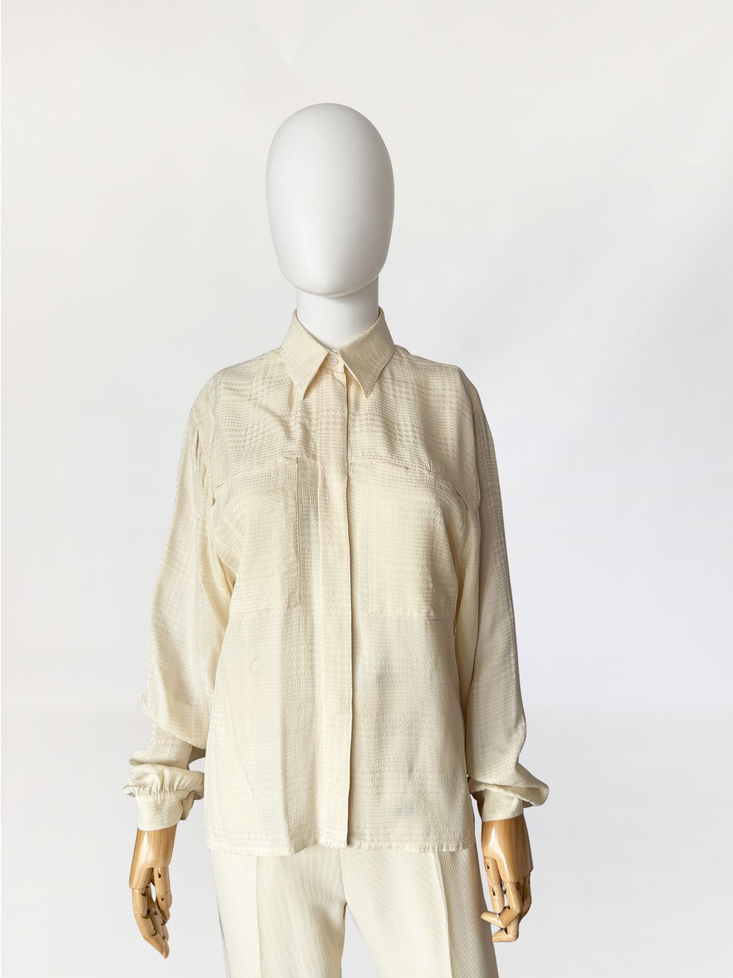 Włoska koszula vintage wykonana z naturalnego jedwabiu w jasnym, kremowym odcieniu. Tkanina o strukturalnej powierzchni z bardzo subtelnym, wypukłym rysunkiem nawiązującym do drobnej pepitki. Swobodny fason z długimi luźnymi rękawami zakończonymi przepinanymi mankietami. Przód z naszytymi dużymi kieszeniami zintegrowanymi z linią karczku. Kołnierz klasyczny, z wyraźnie zaznaczonymi wyłogami. Zapięcie na rząd guzików ukrytych pod listwą. Tył z karczkiem oraz kontrafałdą pośrodku