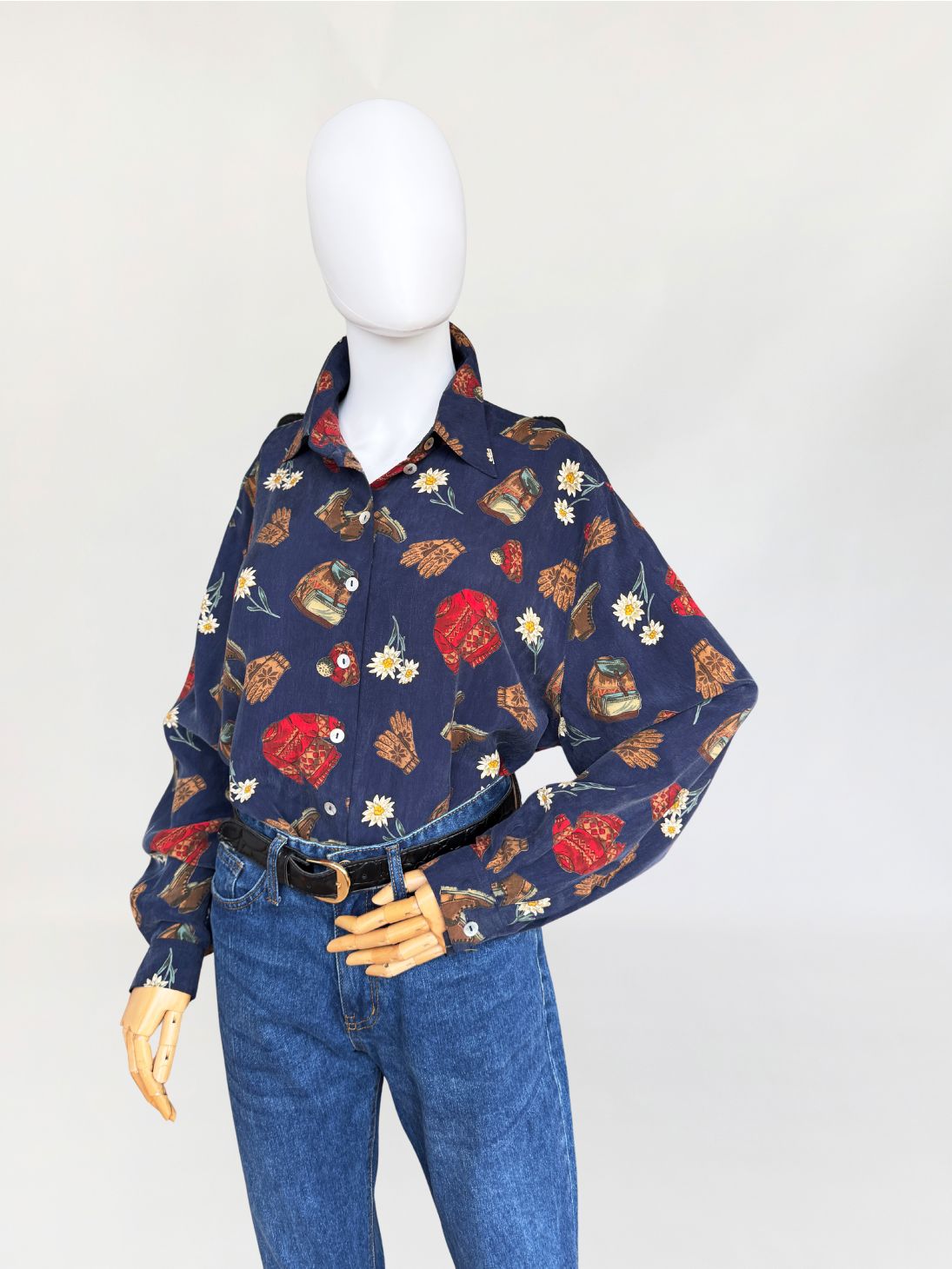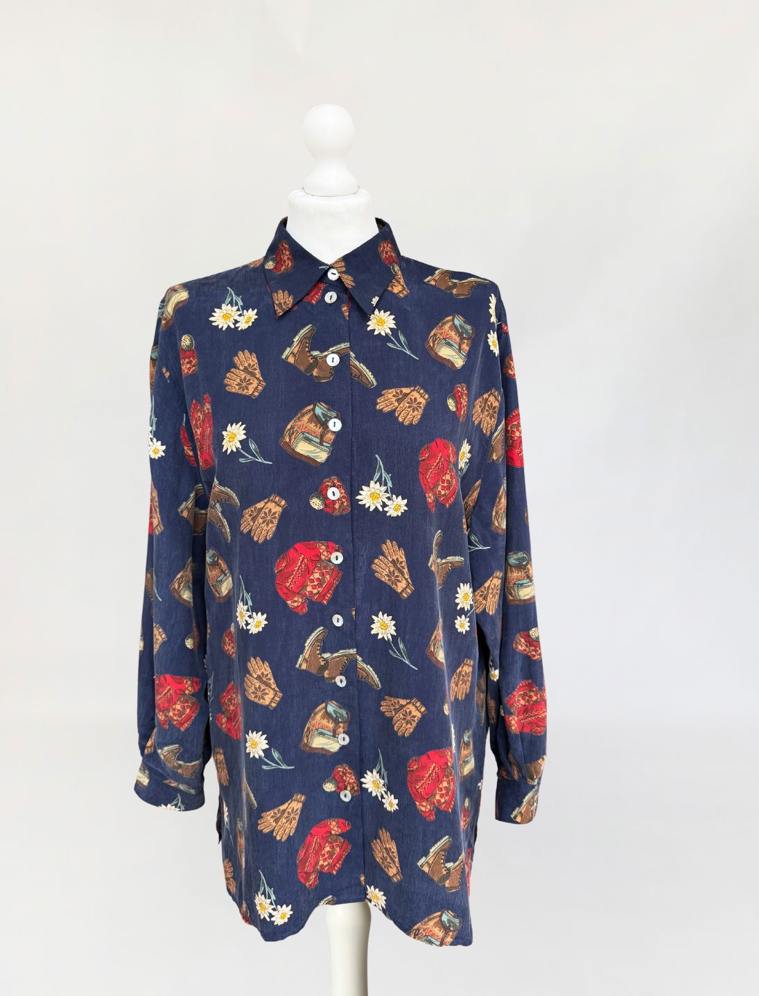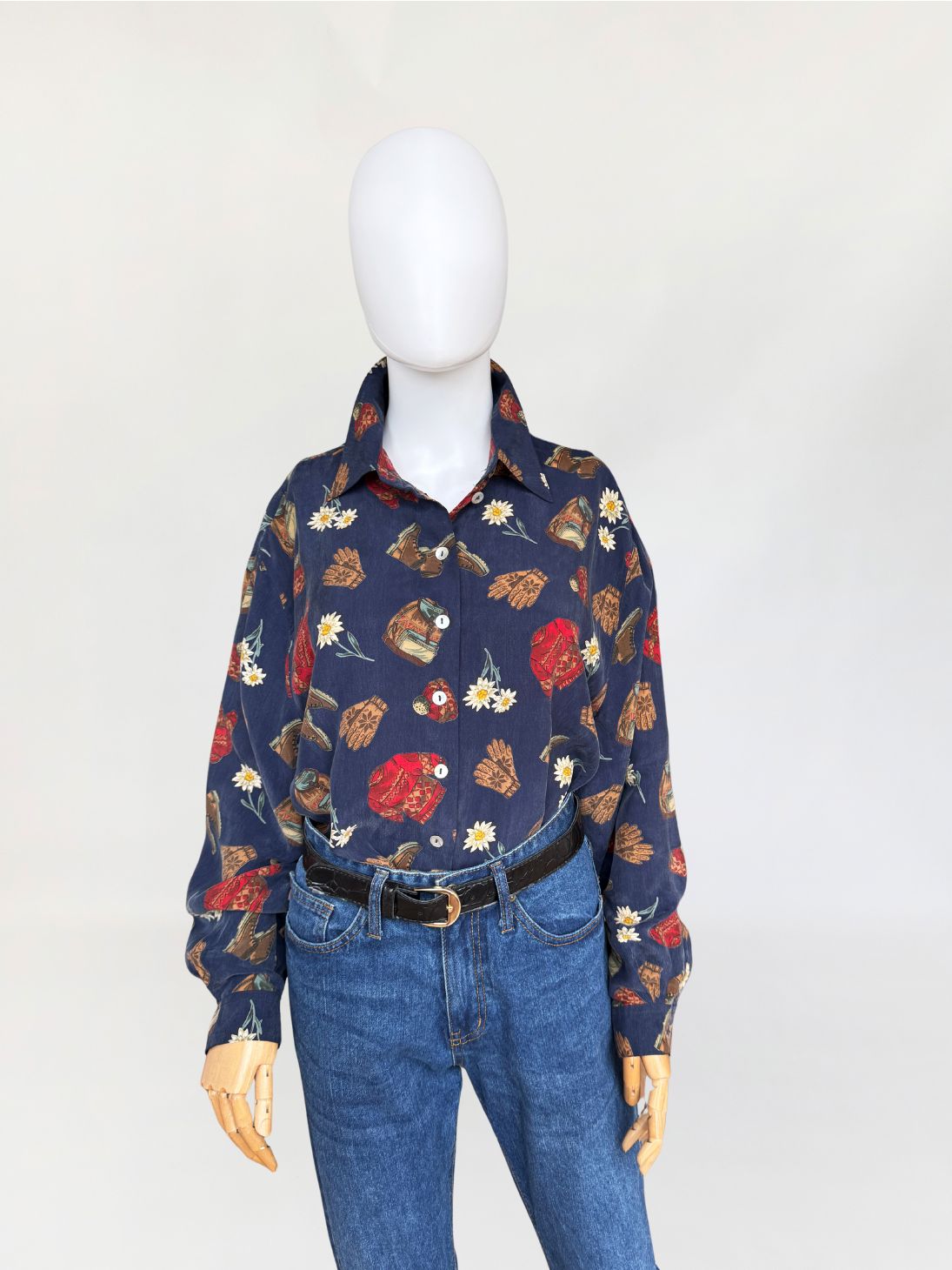 Koszula vintage o swobodnym fasonie, wykonana z miękkiego cupro. Tkanina zdobiona wzorem w jesienne motywy garderoby i akcesoriów, m.in. czapki, rękawiczki, bluzy, plecaki oraz traperowe buty. Zapinana na guziki z masy perłowej.