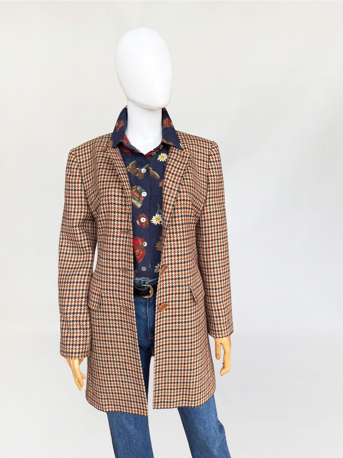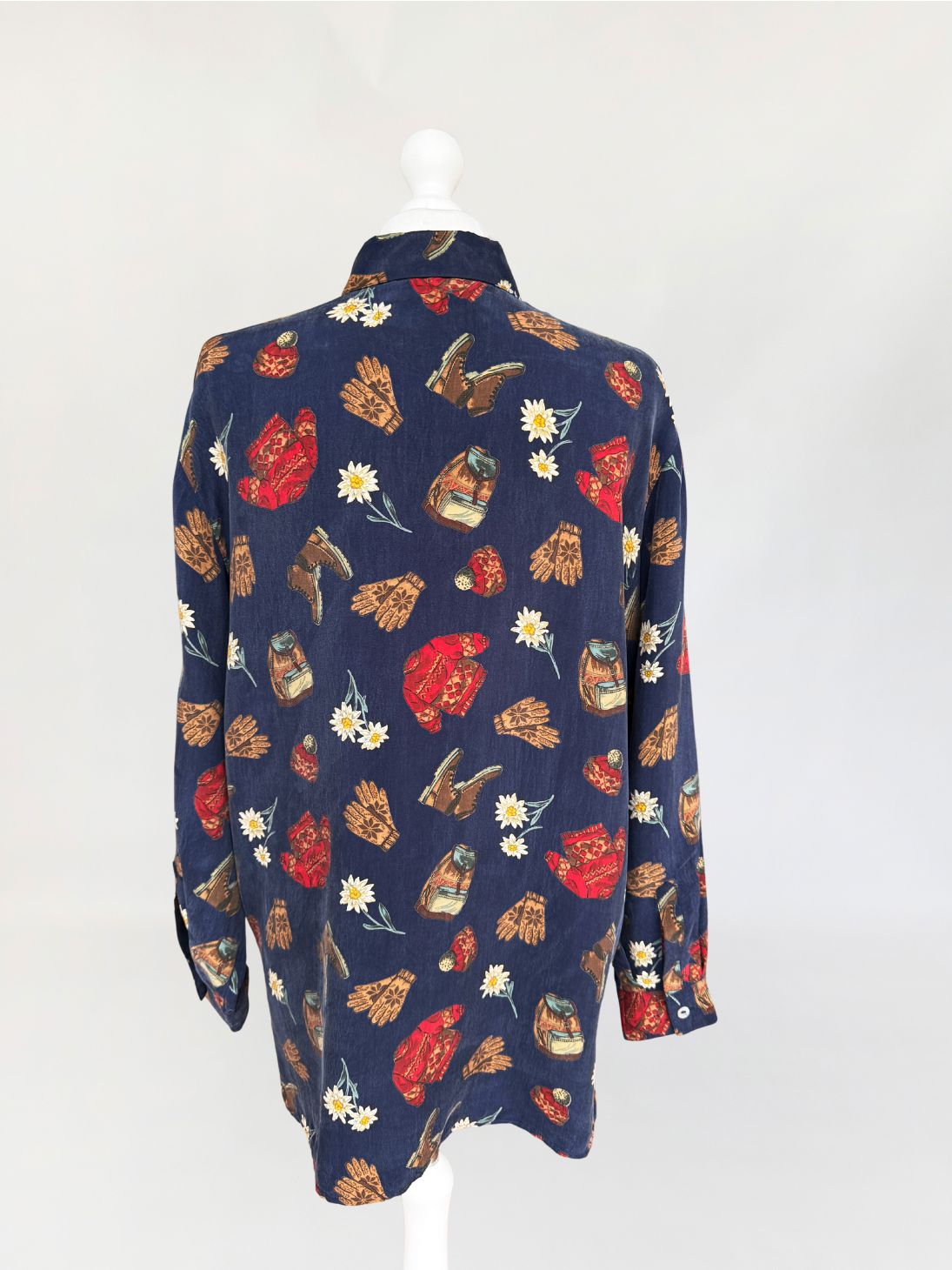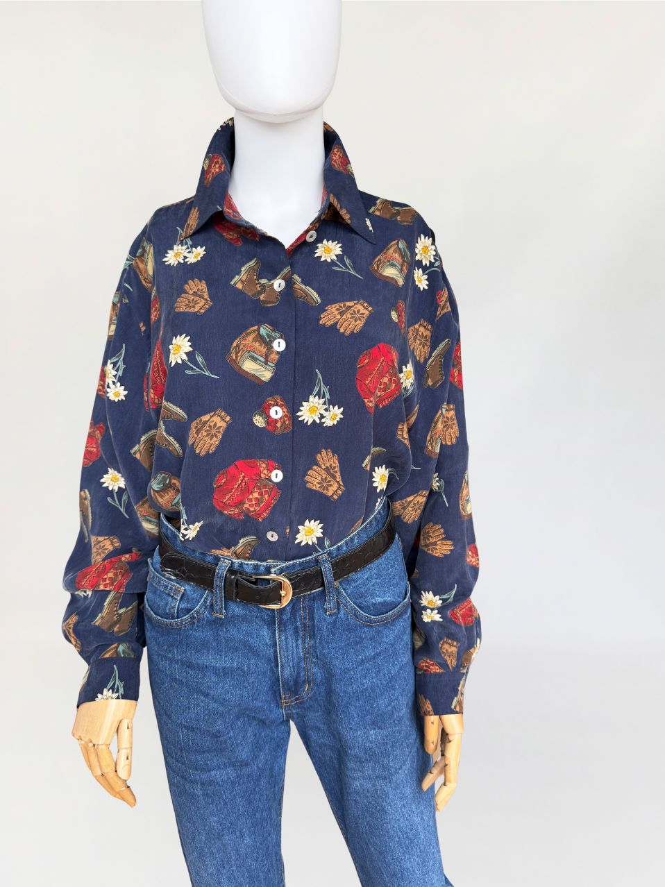 Koszula vintage o swobodnym fasonie, wykonana z miękkiego cupro. Tkanina zdobiona wzorem w jesienne motywy garderoby i akcesoriów, m.in. czapki, rękawiczki, bluzy, plecaki oraz traperowe buty. Zapinana na guziki z masy perłowej.