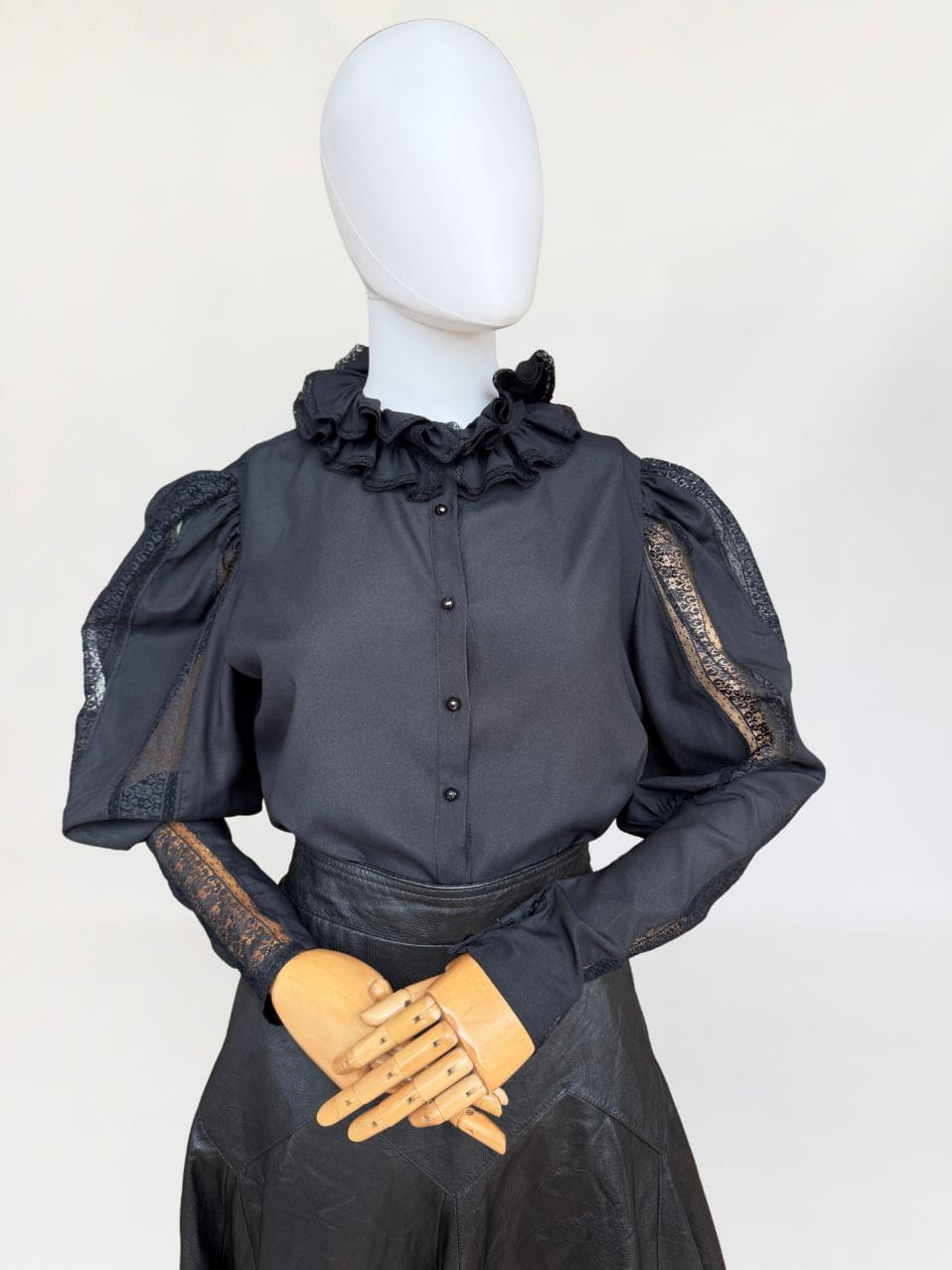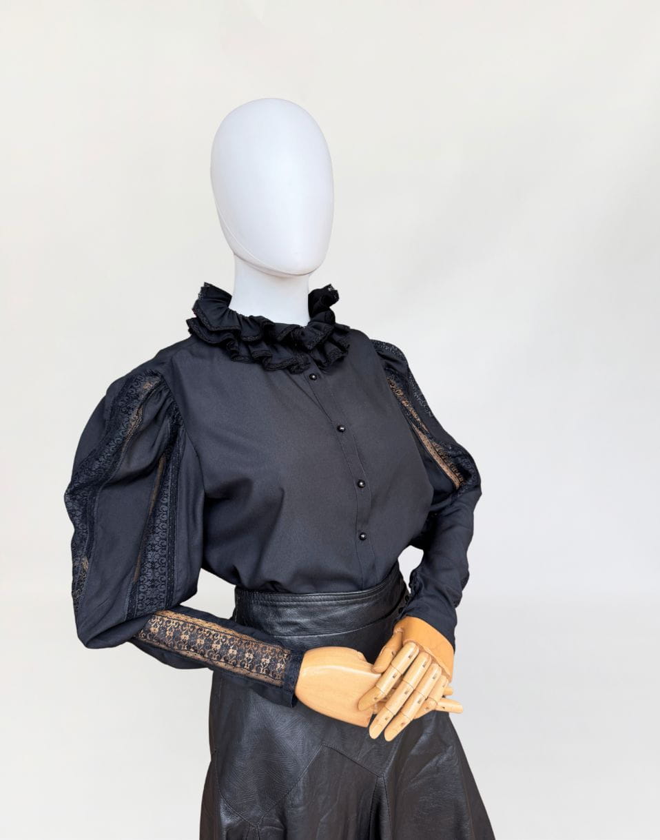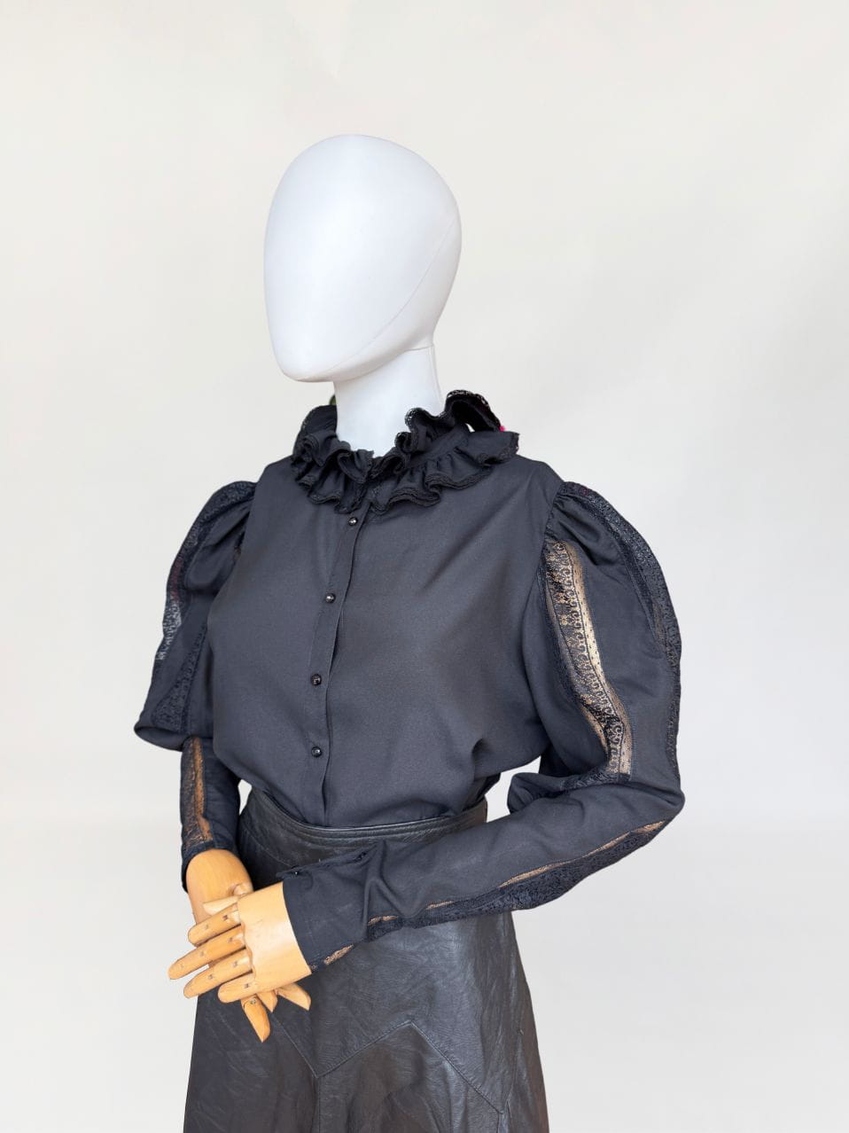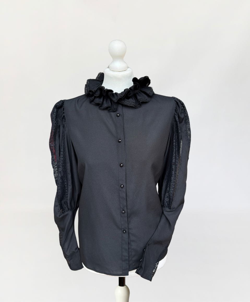Włoska koszula vintage w wiktoriańskim stylu. Długie, bufiaste w ramionach rękawy z koronkowym panelem. U góry falbaniasty kołnierz z koronkowym wykończeniem. Zapinana na drobne guziki