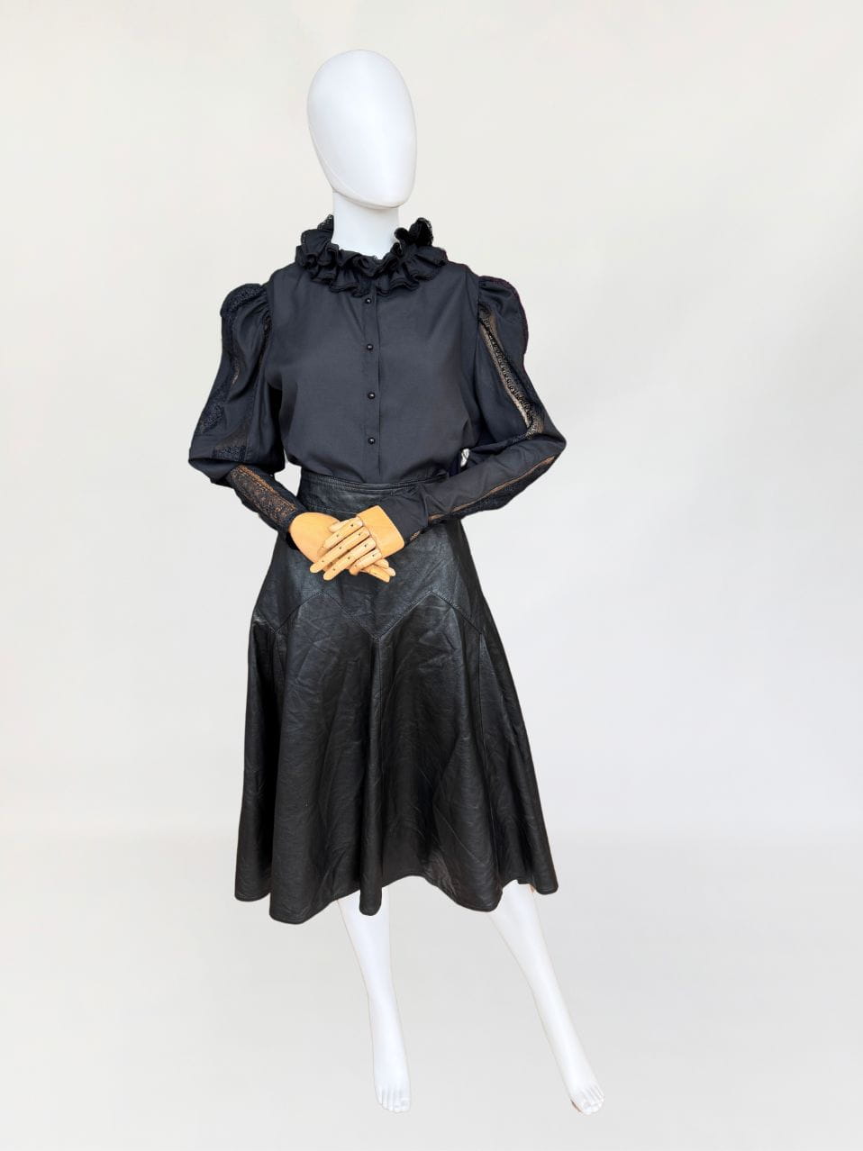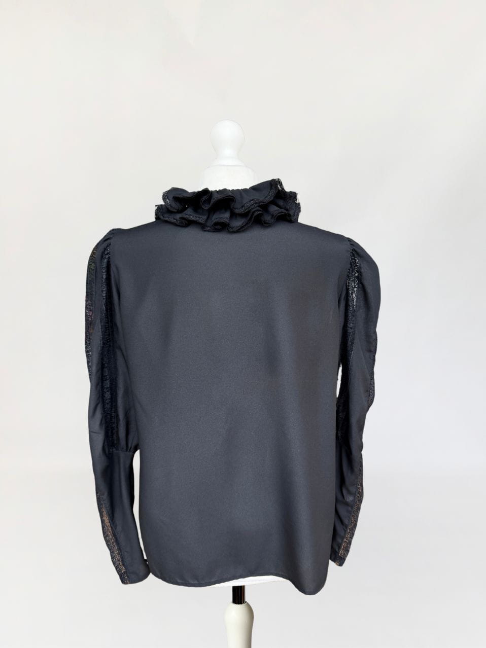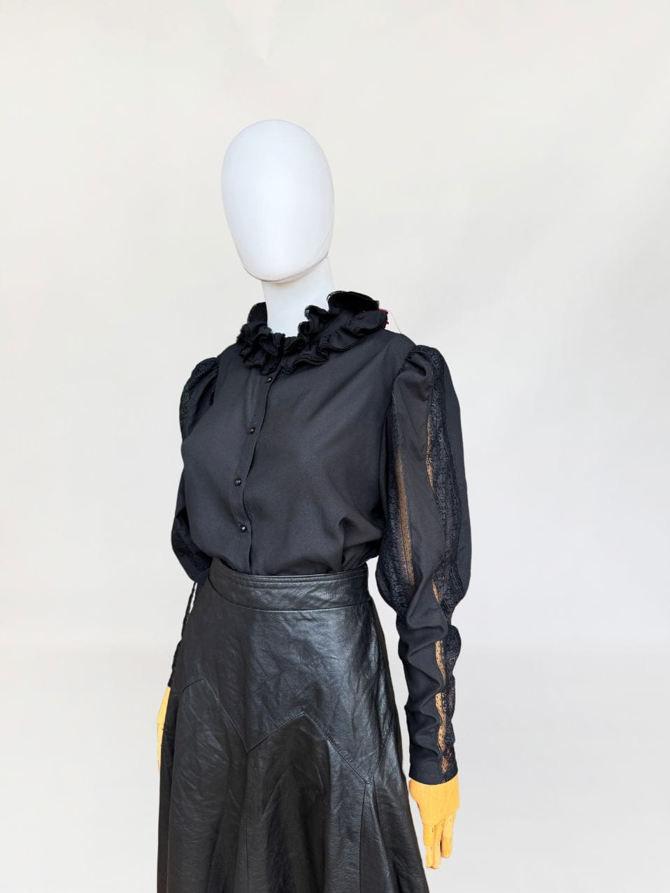 Włoska koszula vintage w wiktoriańskim stylu. Długie, bufiaste w ramionach rękawy z koronkowym panelem. U góry falbaniasty kołnierz z koronkowym wykończeniem. Zapinana na drobne guziki