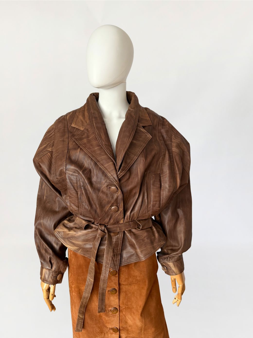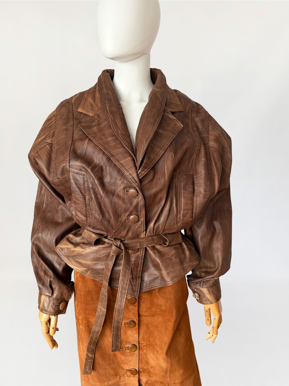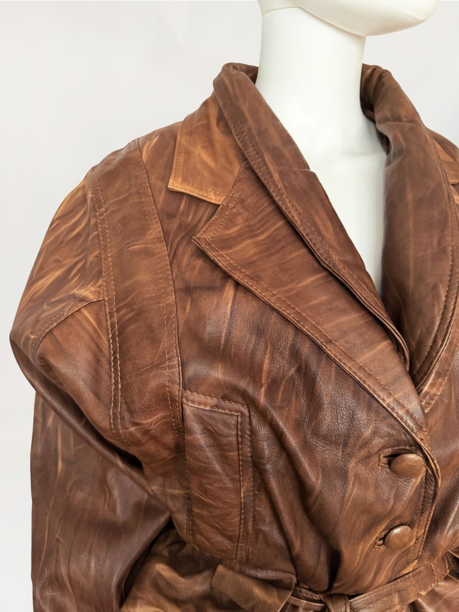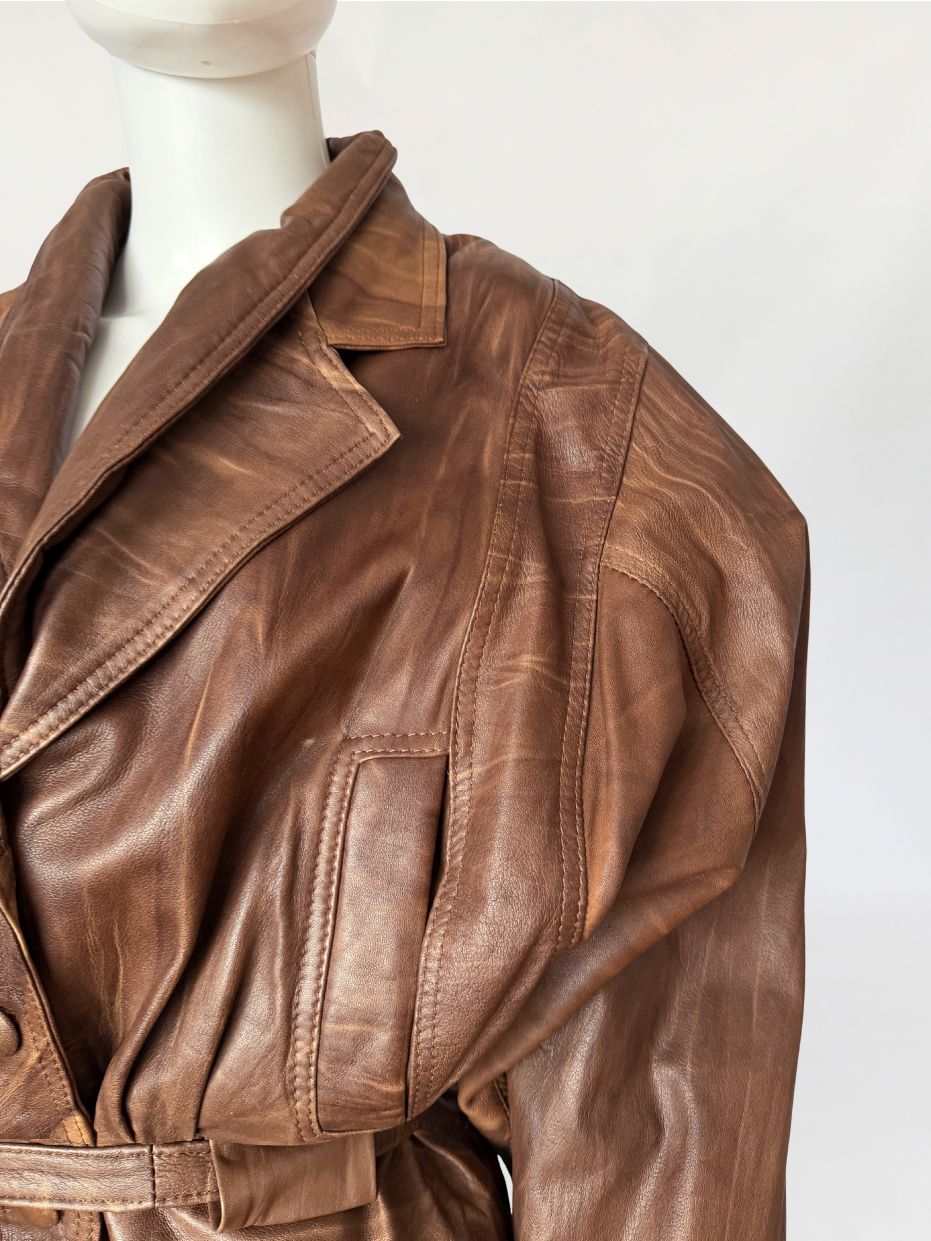 Włoska kurtka vintage z lat 80-tych/90-tych. Wykonana z naturalnej skóry jagnięcej w ciepłym odcieniu brązu, z regularnym cieniowaniem na całości poiwerzchni. Oversize'owy fason z mocno obniżoną linią pach, pas podkreślony przewiązywanym paskiem. Długie szerokie rękawy zwężane przy mankietach, ramiona watowane. Zapinana powlekane guziki. Po bokach nieduże wsuwane kieszenie.