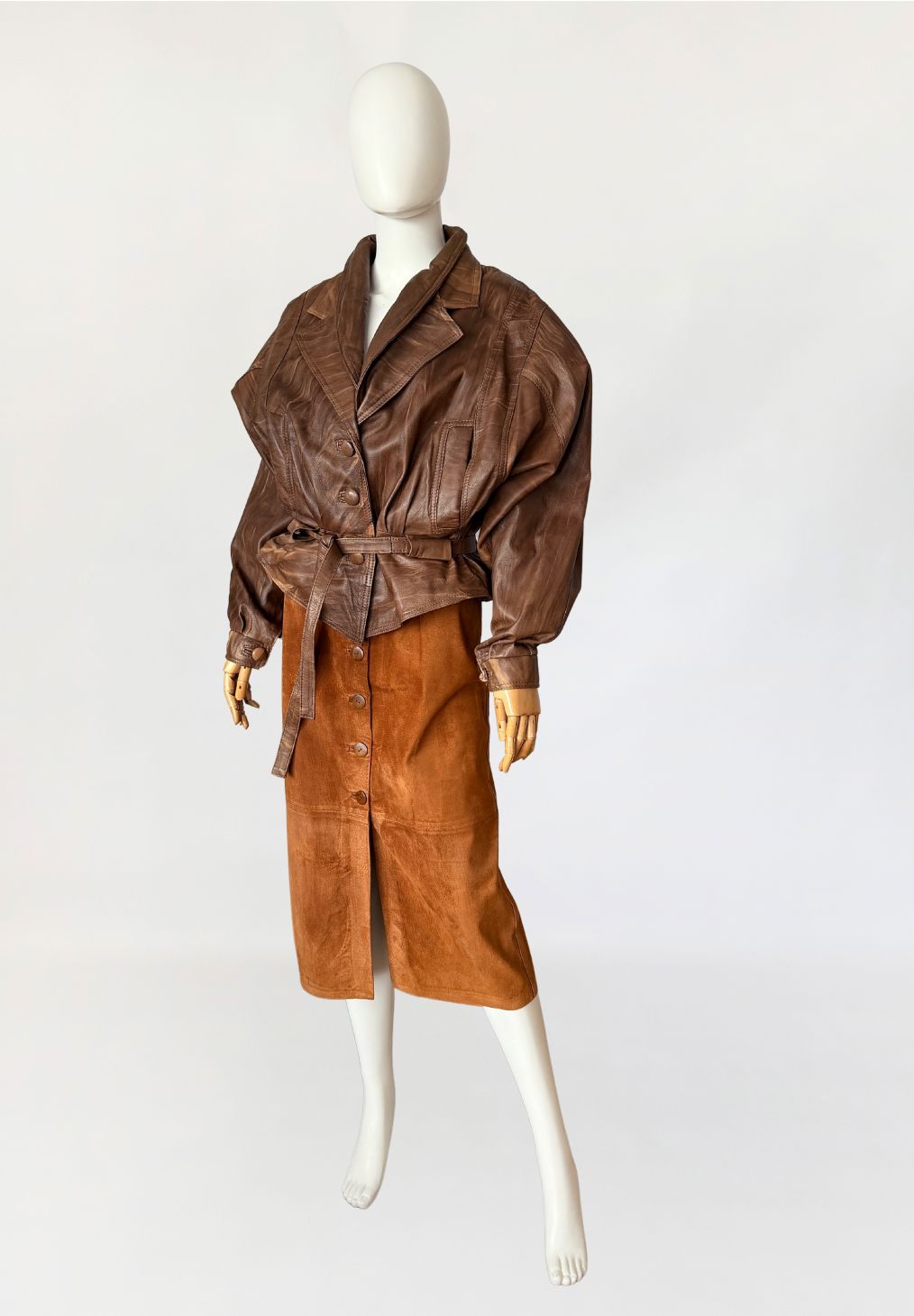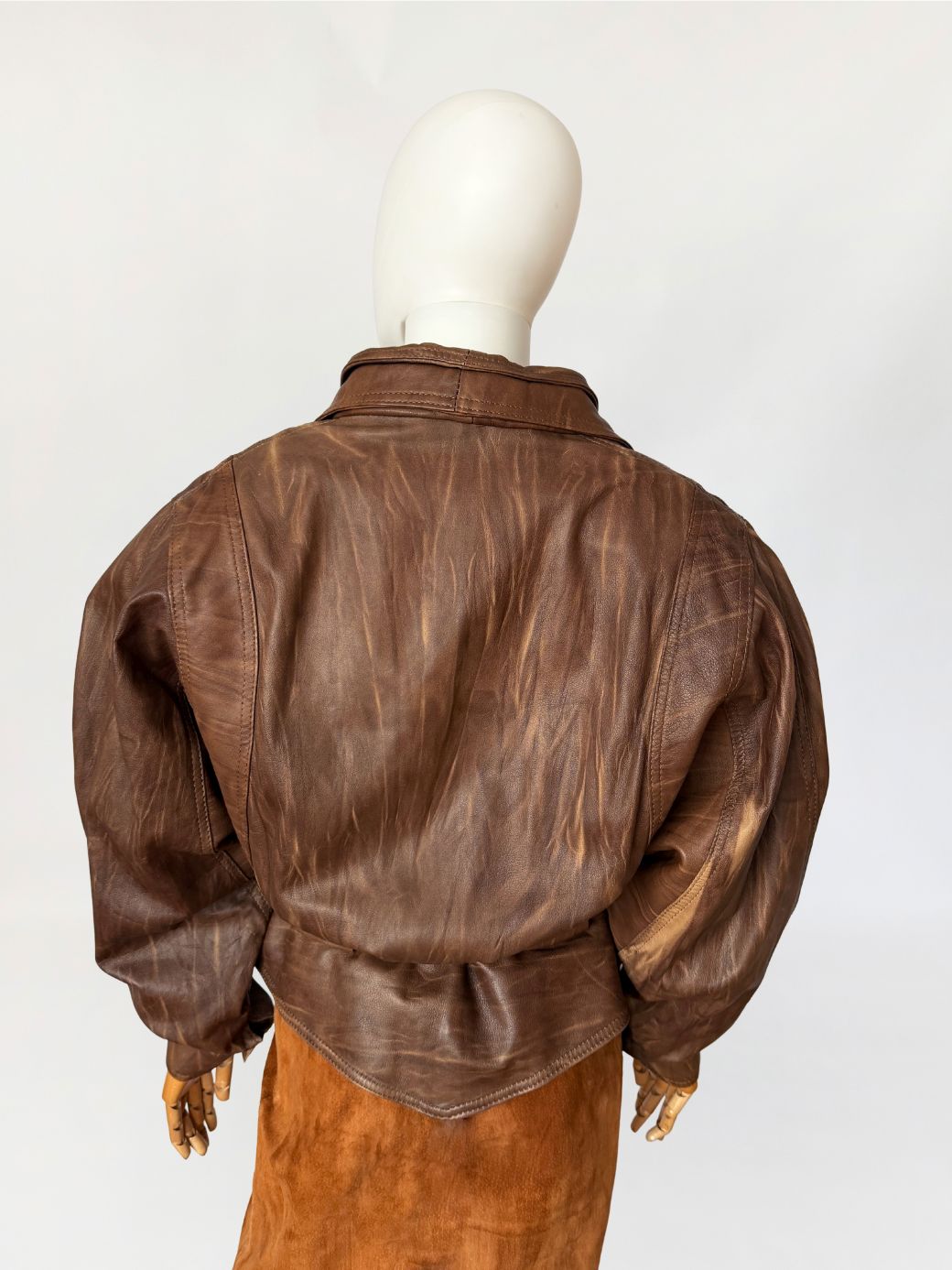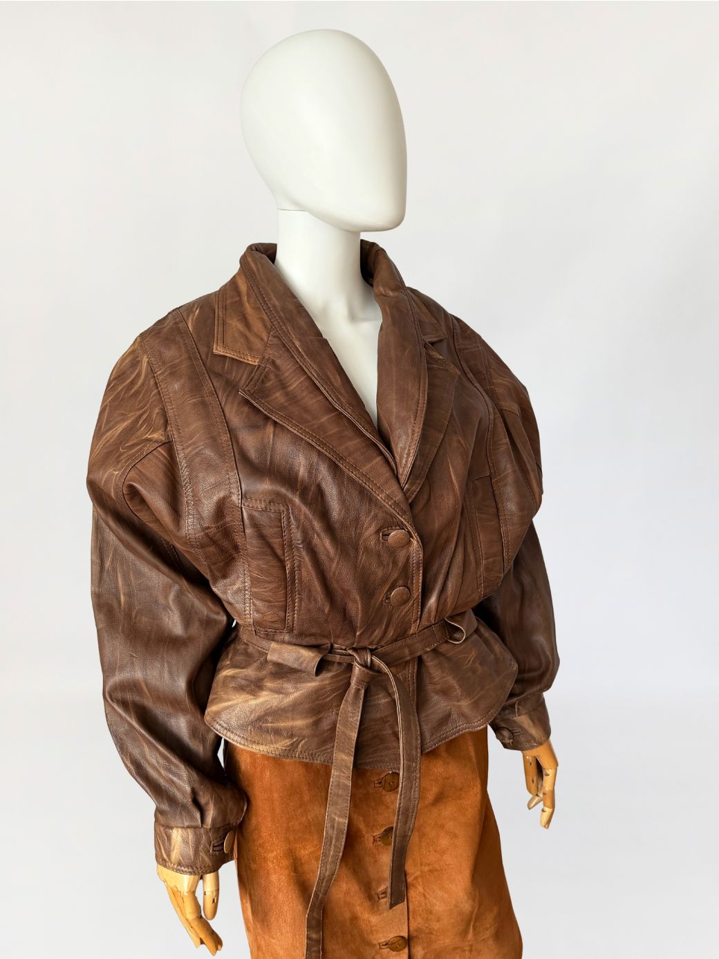Włoska kurtka vintage z lat 80-tych/90-tych. Wykonana z naturalnej skóry jagnięcej w ciepłym odcieniu brązu, z regularnym cieniowaniem na całości poiwerzchni. Oversize'owy fason z mocno obniżoną linią pach, pas podkreślony przewiązywanym paskiem. Długie szerokie rękawy zwężane przy mankietach, ramiona watowane. Zapinana powlekane guziki. Po bokach nieduże wsuwane kieszenie.