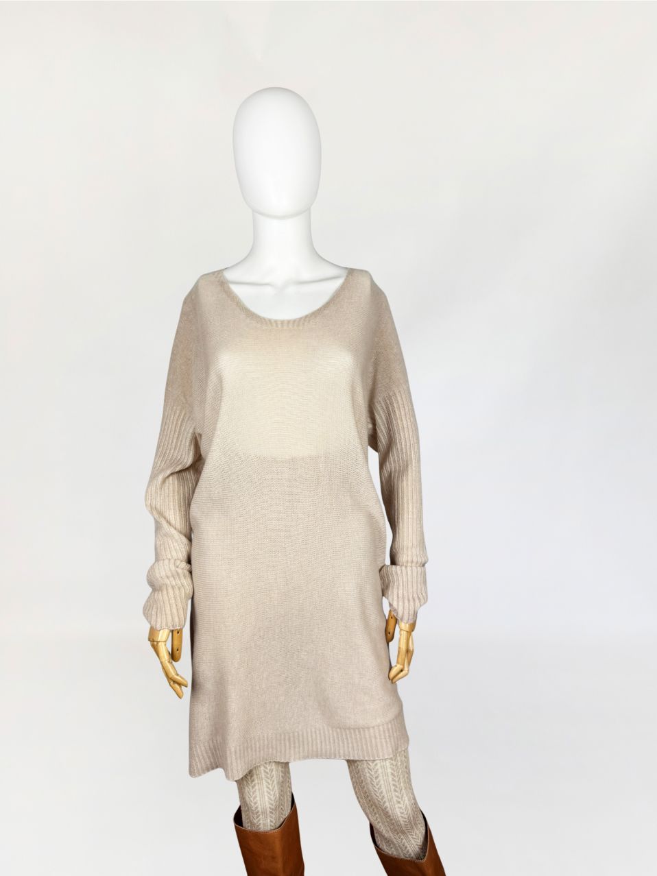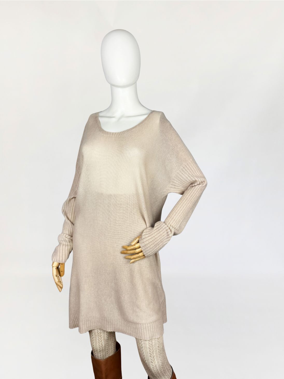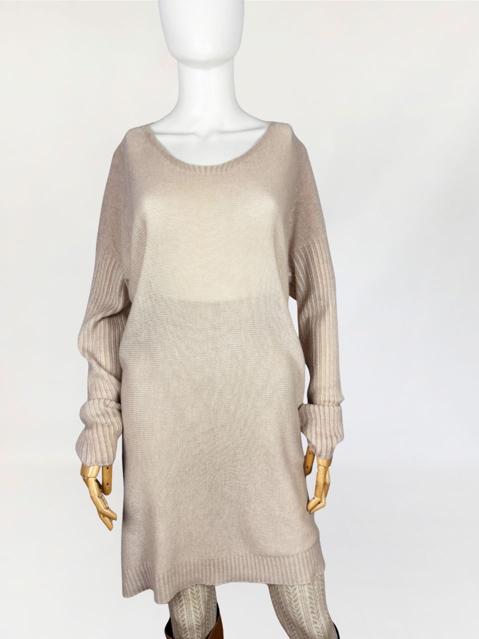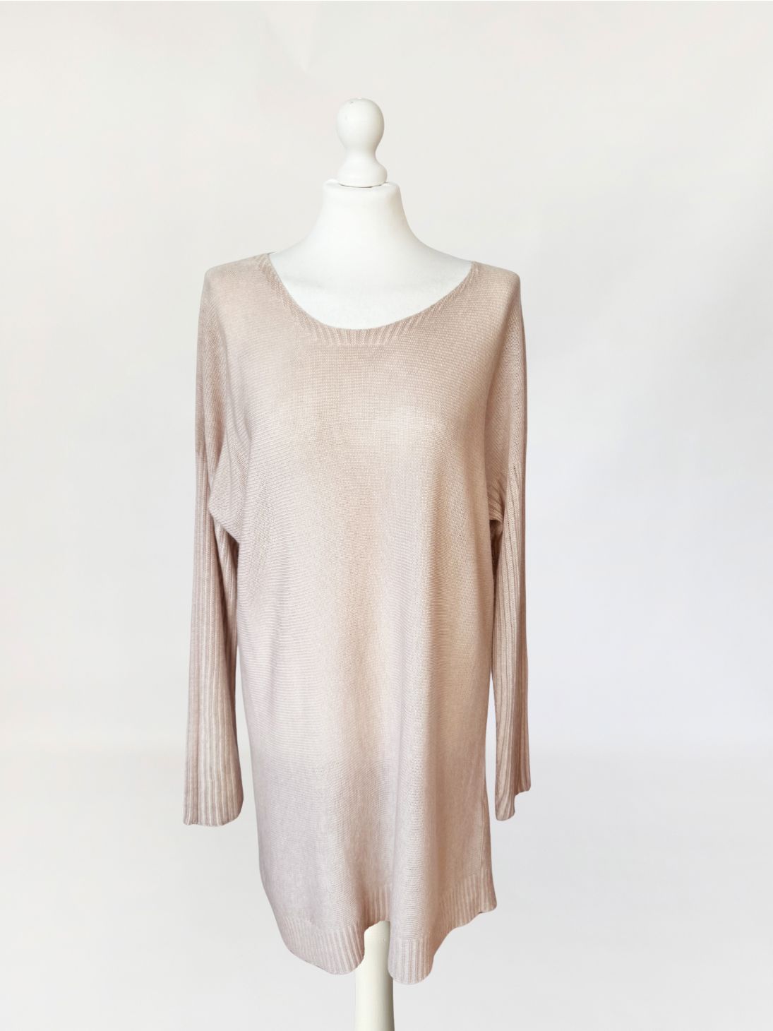 Włoska sukienka swetrowa wykonana w całości z kaszmiru o wyjątkowo miękkim, delikatnym splocie. Lekka, luksusowa przędza w odcieniu bężu z subtelnym różowym tonem. Konstrukcja oparta na swobodnym, prostym kroju z lekko obniżoną linią ramion i dopasowanymi rękawami o wyraźnym, prążkowanym ściągaczu. Dekolt szeroki, półokrągły, wykończony subtelnym, wąskim rantem z prążkowania. Dolna krawędź oraz mankiety wzmocnione ściągaczem o podwójnym ściegu.
