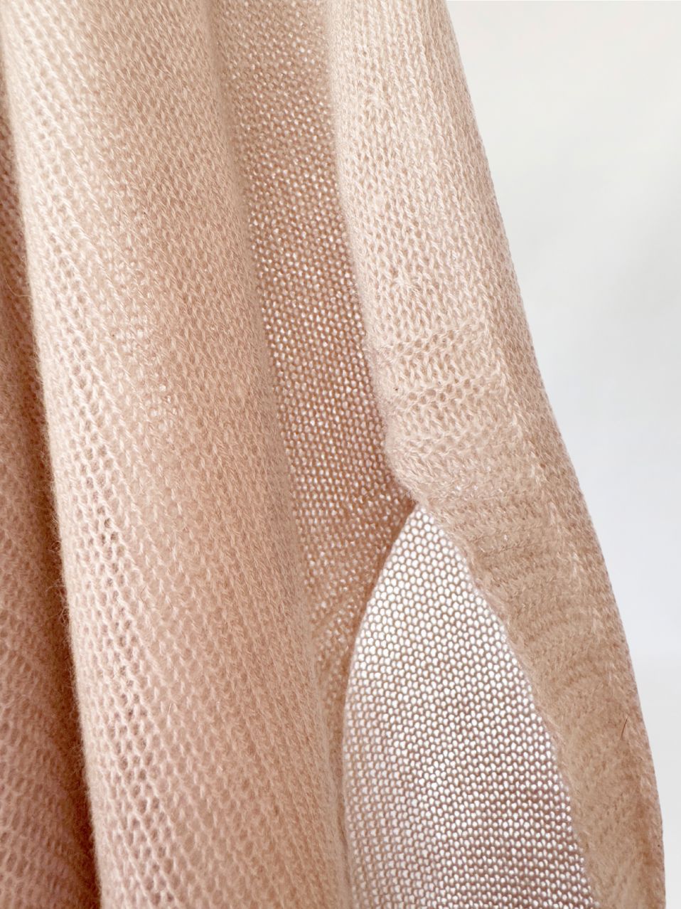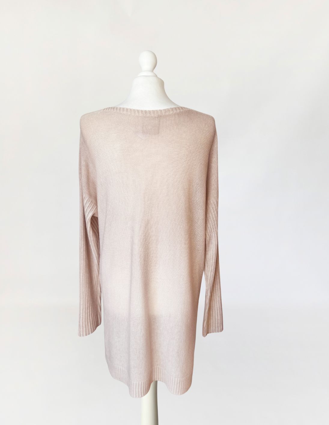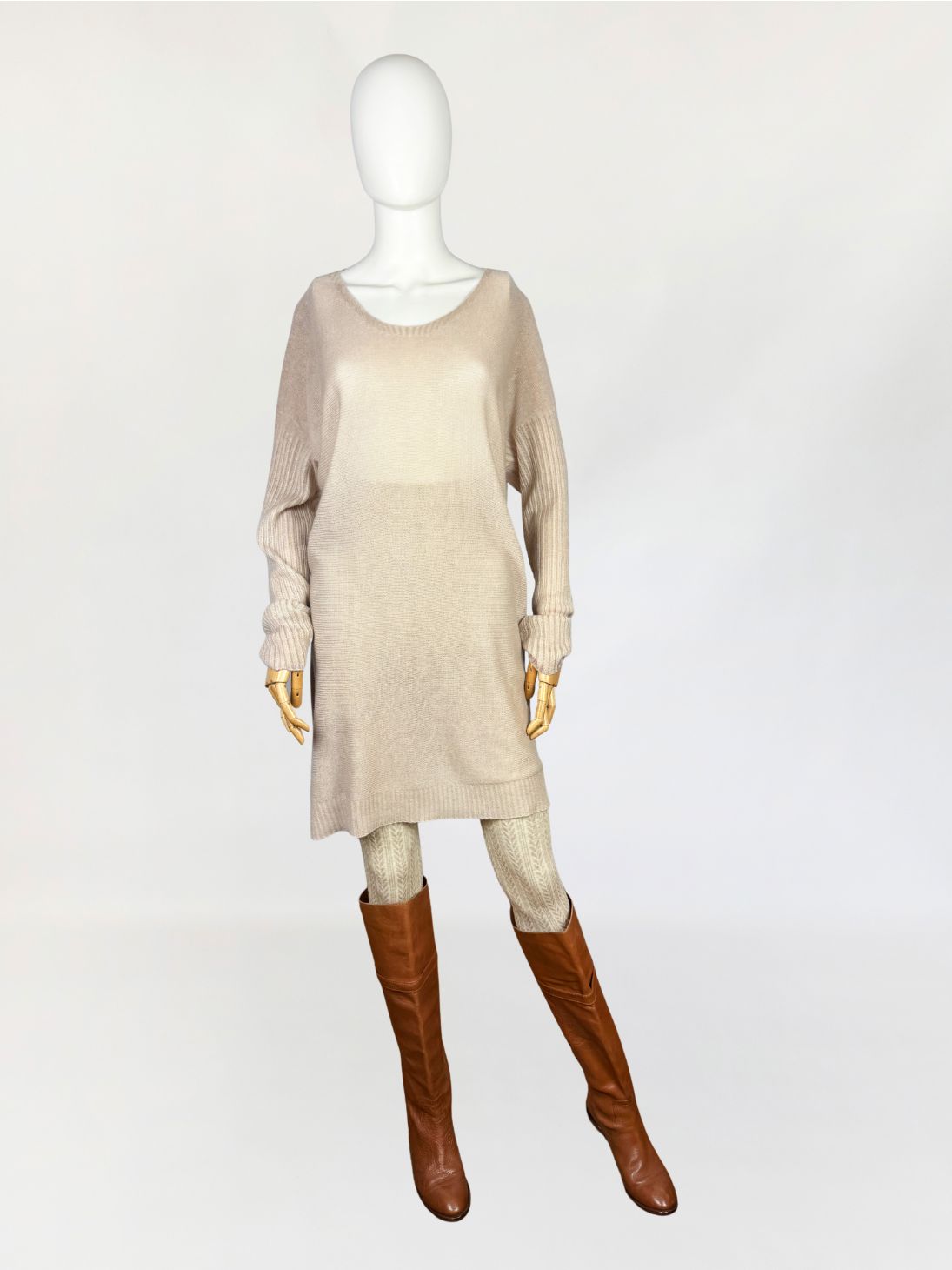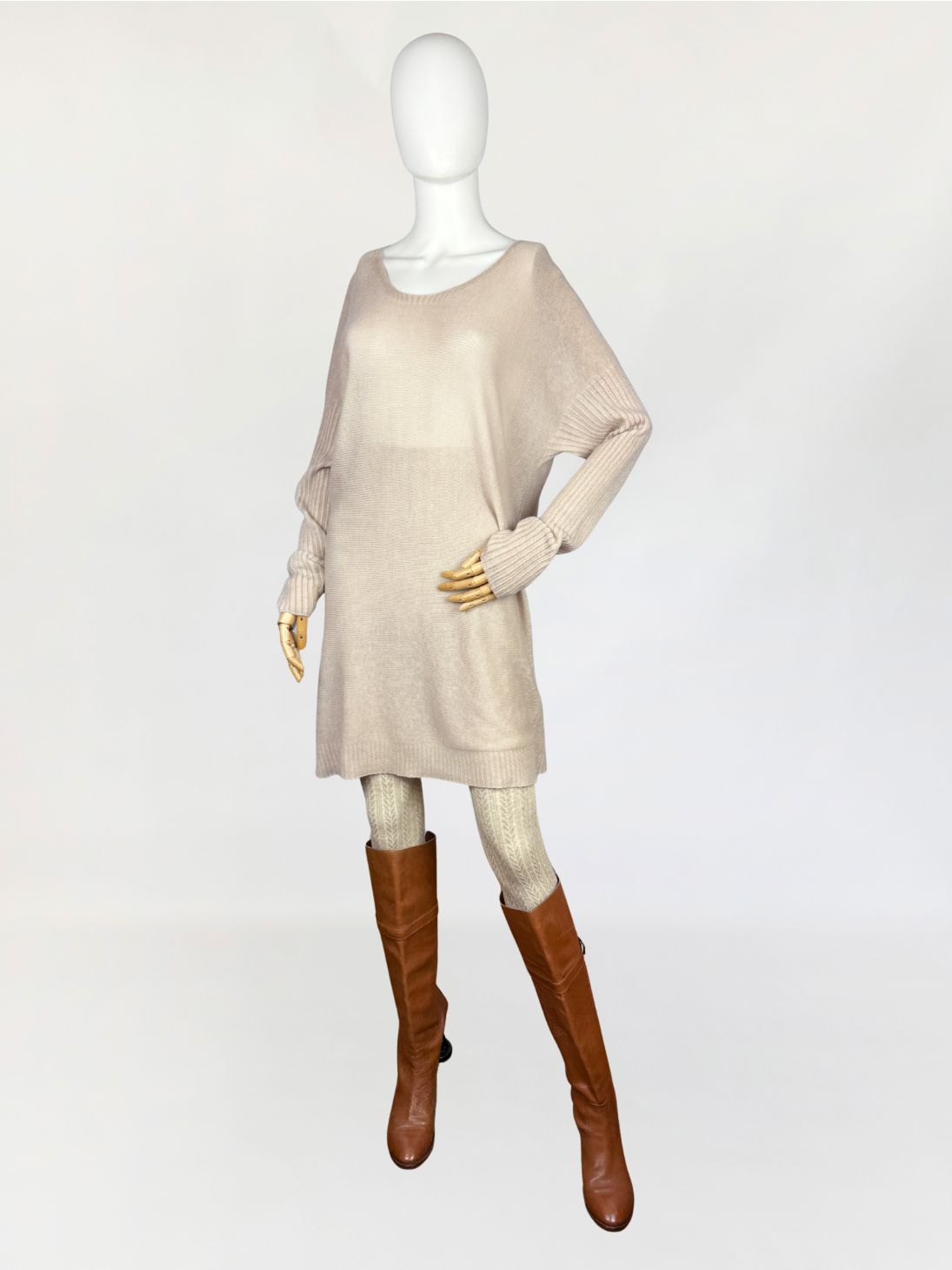 Włoska sukienka swetrowa wykonana w całości z kaszmiru o wyjątkowo miękkim, delikatnym splocie. Lekka, luksusowa przędza w odcieniu bężu z subtelnym różowym tonem. Konstrukcja oparta na swobodnym, prostym kroju z lekko obniżoną linią ramion i dopasowanymi rękawami o wyraźnym, prążkowanym ściągaczu. Dekolt szeroki, półokrągły, wykończony subtelnym, wąskim rantem z prążkowania. Dolna krawędź oraz mankiety wzmocnione ściągaczem o podwójnym ściegu.