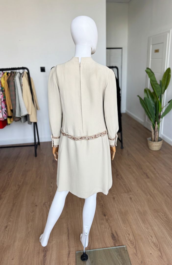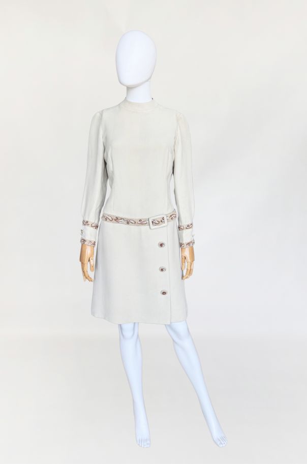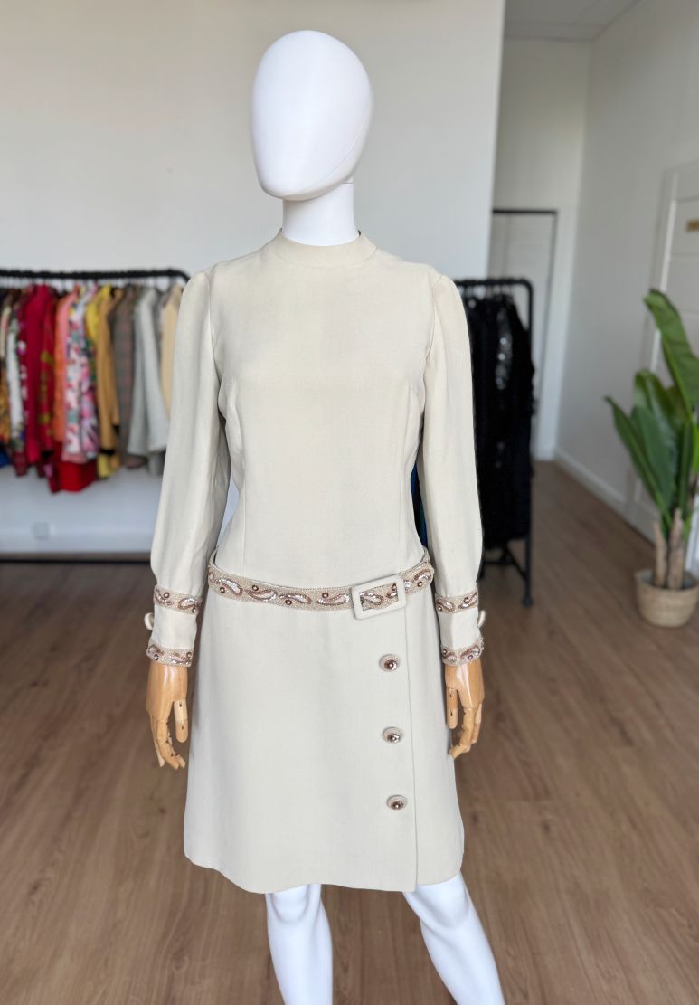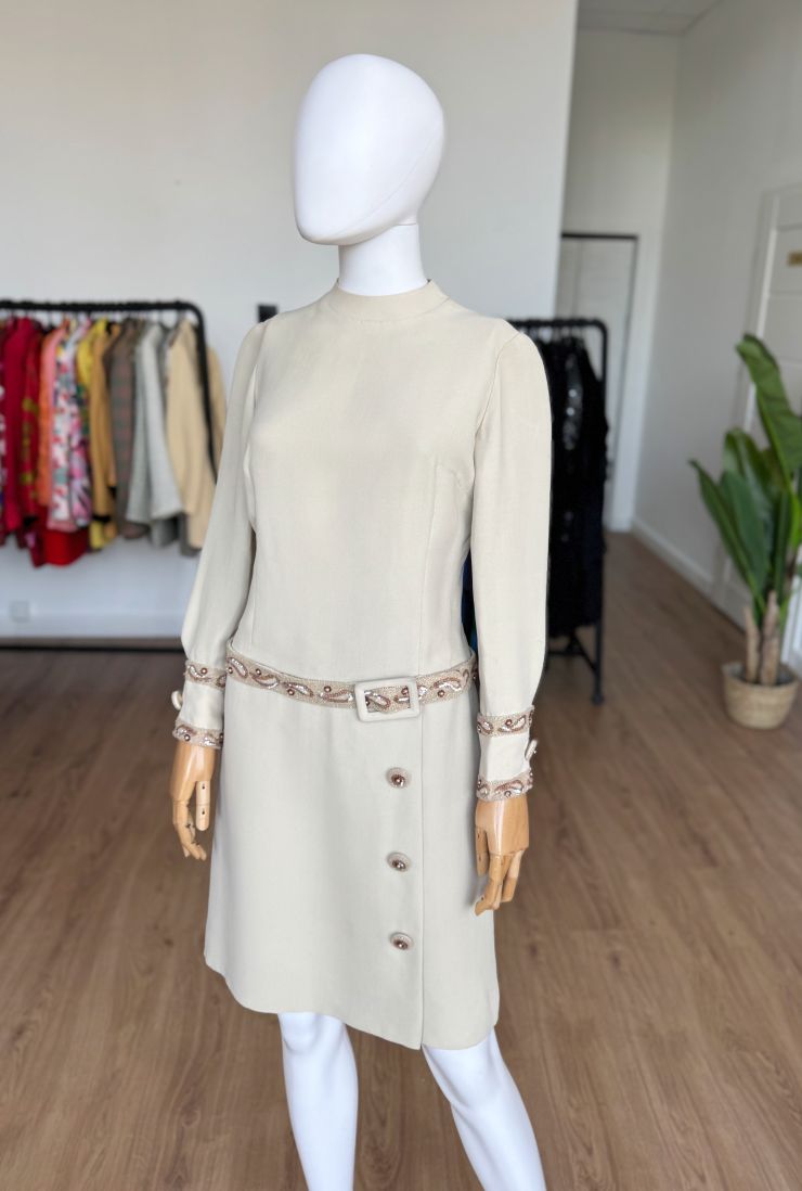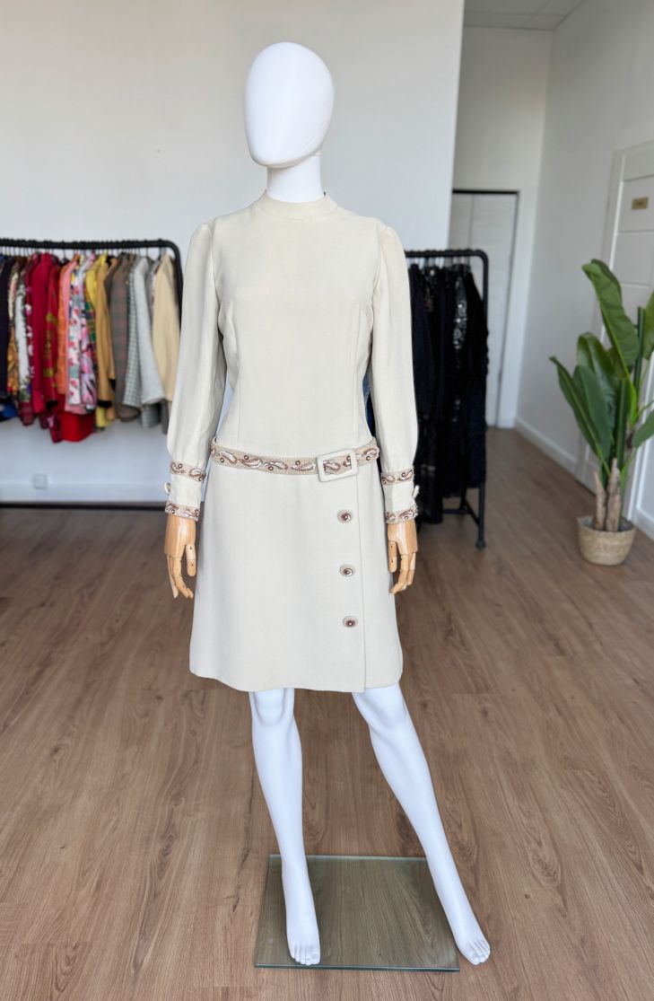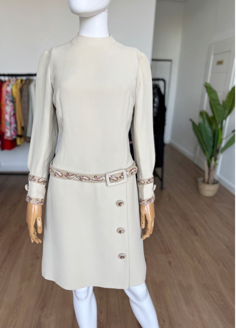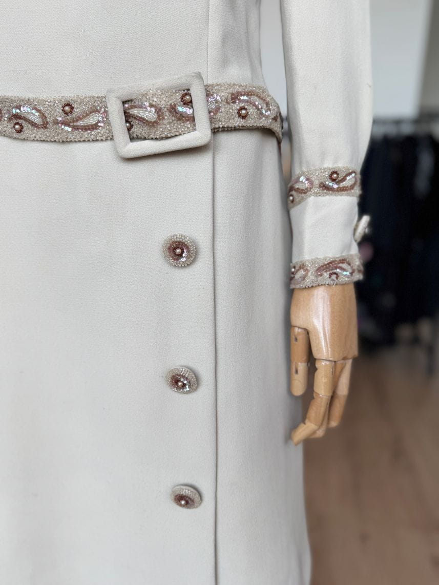 Płaszczowa sukienka o klasycznej, prostej linii i długości midi, z długimi rękawami oraz niewielką stójką. Vintage z lat 60-tych z pracowni włoskiej projektantki, podpisanej na metce. Wykonana z wełnianej krepy w eleganckim odcieniu kremu z subtelnym tonem taupe. Elementem wyróżniającym są misternie wykonane biżuteryjne aplikacje, układające się w paisley'owe wzory i drobne kwiaty, które zdobią mankiety oraz wszyty w centralnej części, dekoracyjny pas. Dolną część sukienki zdobią duże guziki, pełniące głównie funkcję dekoracyjną – rzeczywiste zapięcie stanowi dyskretny zamek na plecach. Podobne modele w latach 60-tych wprowadzał do swoich kolekcji dom mody Dior, Lanvin, czy Geoffrey Beene, a sukienki płaszczowe były jednym z charakterystycznych fasonów tej dekady, łączącym elegancję z nowoczesnym minimalizmem.